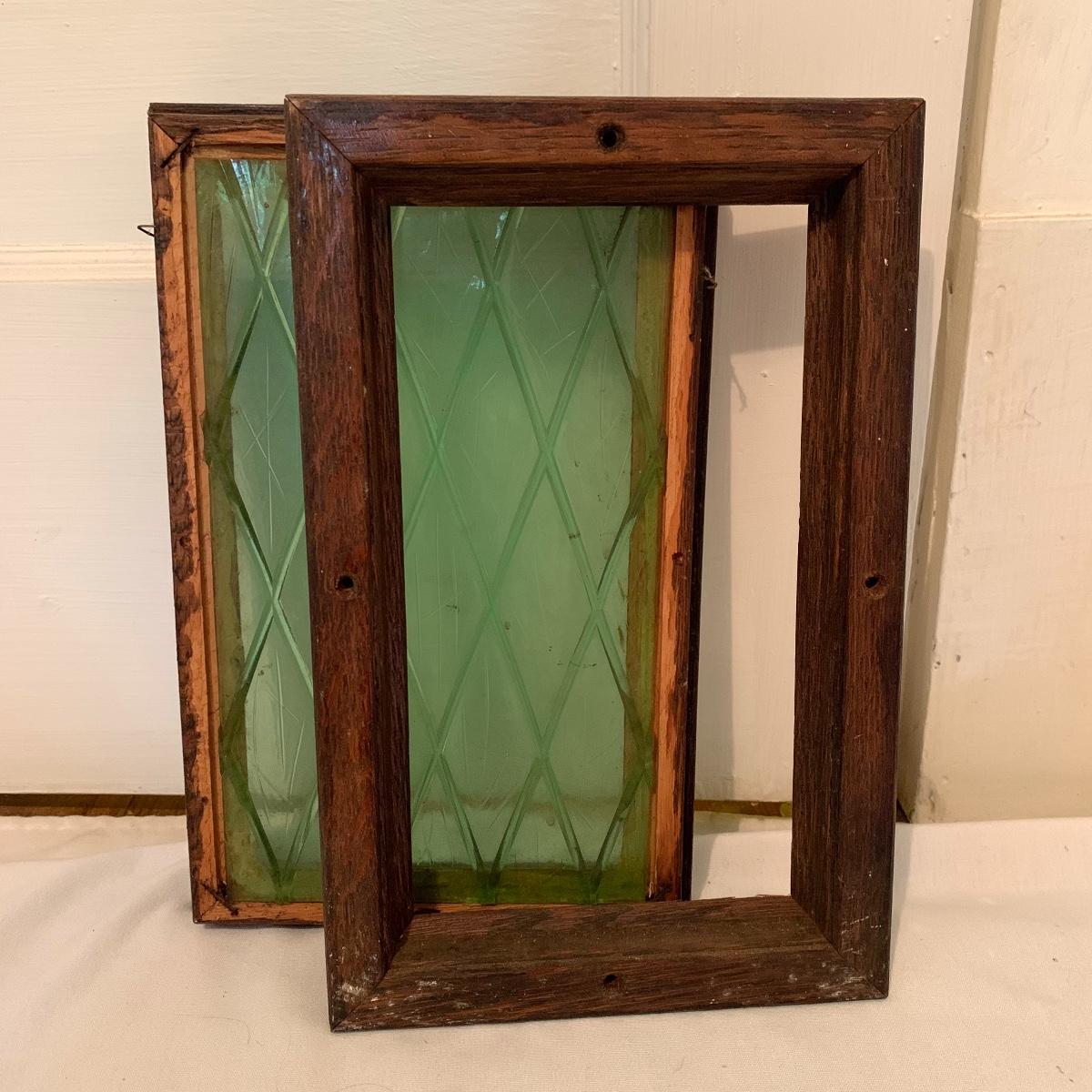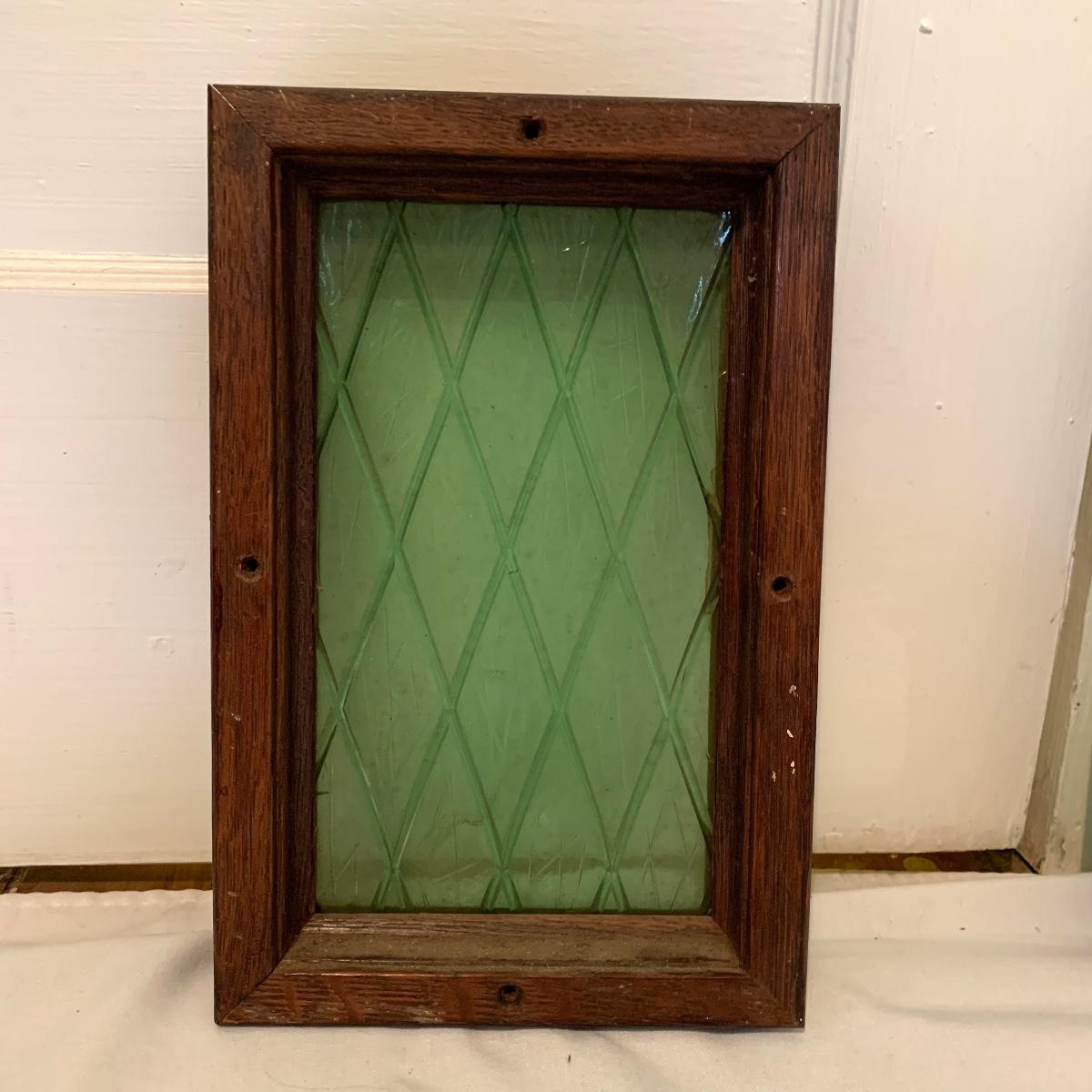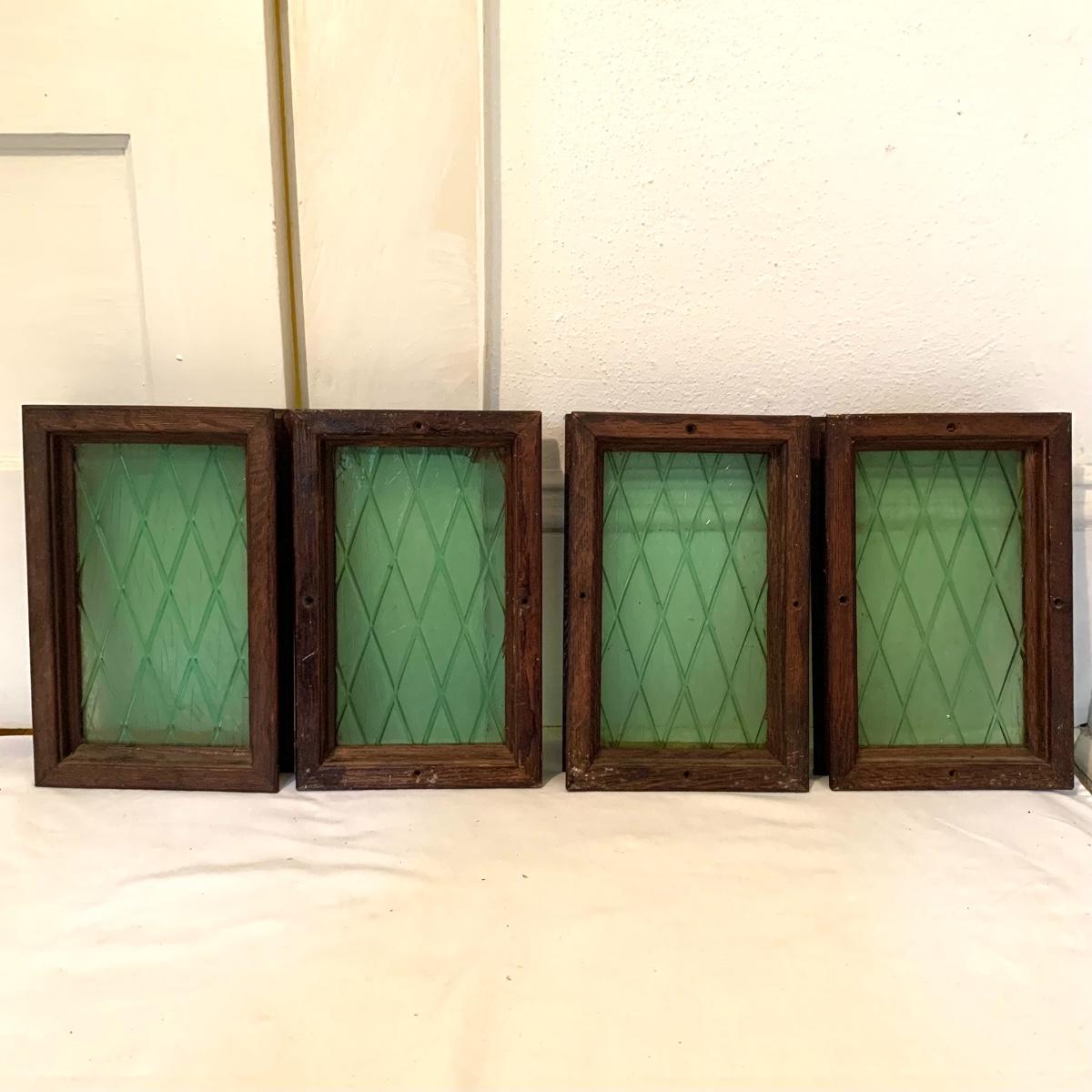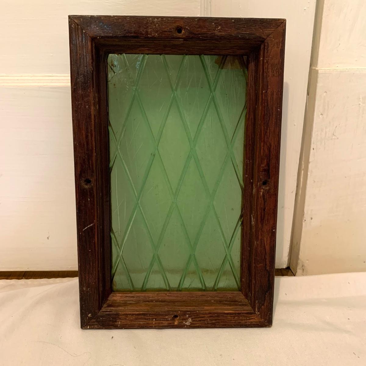 This lot includes four small (7.5” x 2.25” x 11.5”) glass windows. The glass has a light green tint and a textured argyle pattern. A label on one says they were made in West Germany. Each window comes in a two-part (front and back) wooden frame. One window has broken glass in a corner, but all the pieces are present. Another has a frame that is not currently attached, but could be glued back together. Another window has a small chip in the textured part of the design. Shipping Available
