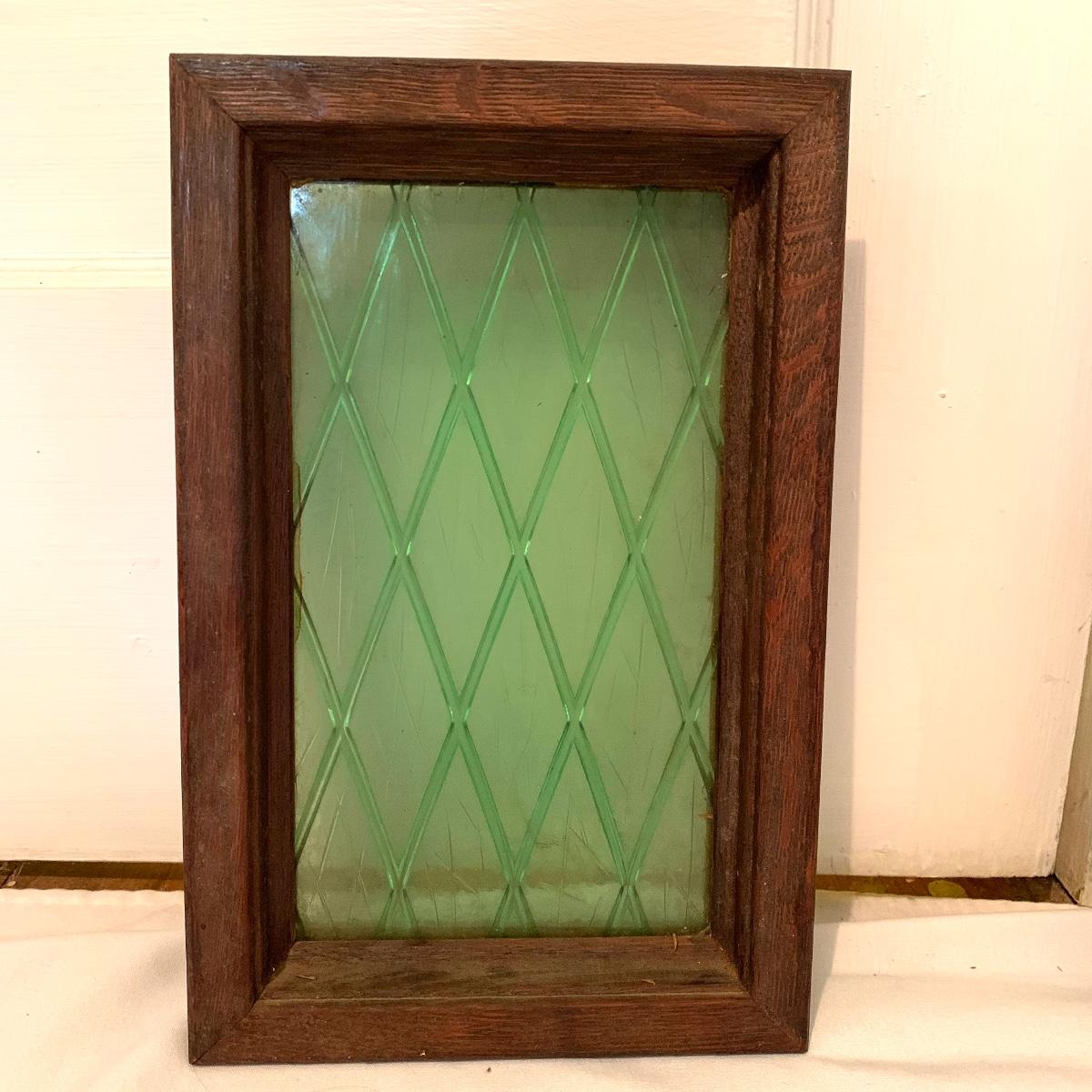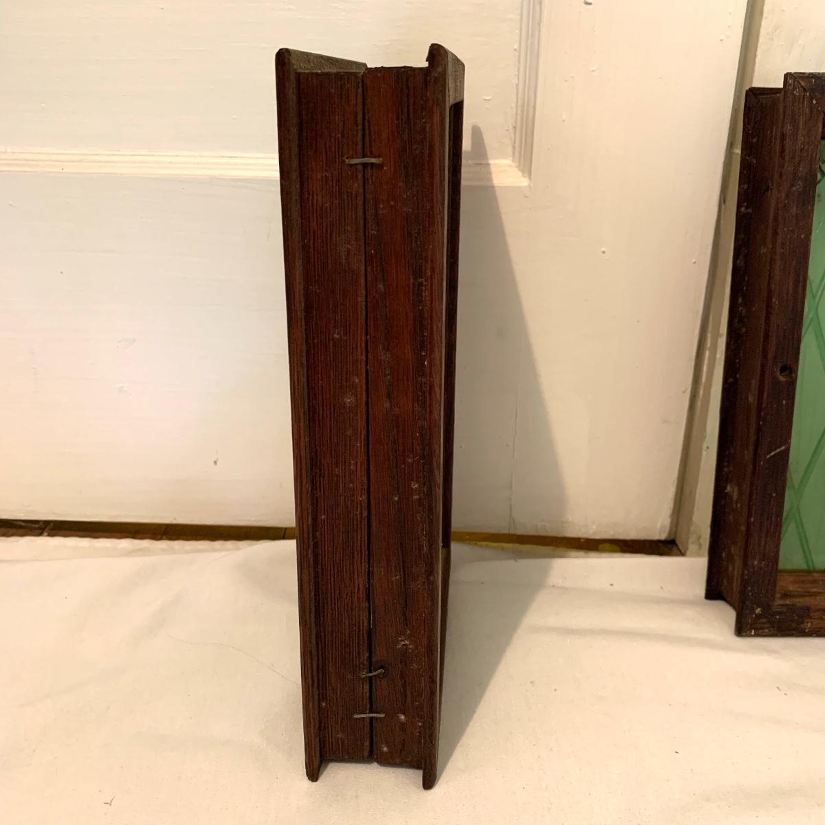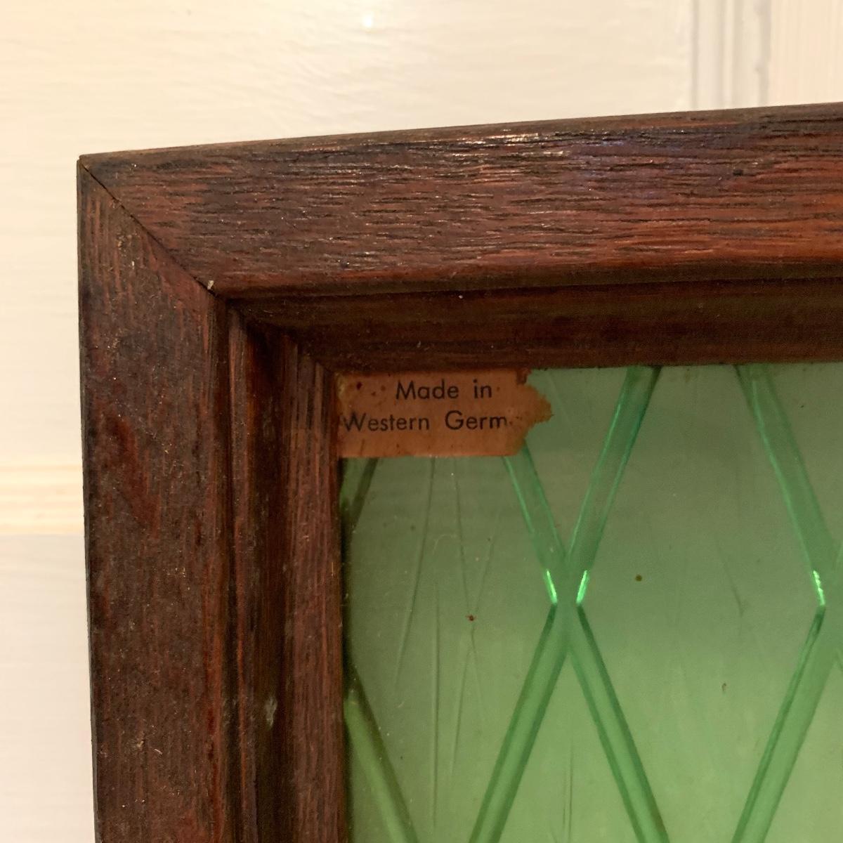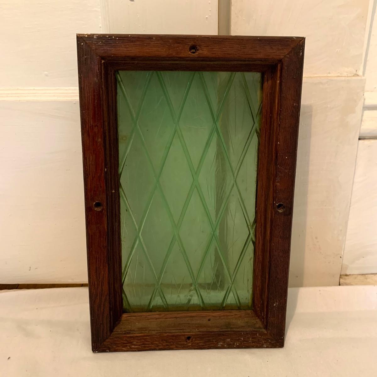 This lot includes four small (7.5” x 2.25” x 11.5”) glass windows. The glass has a light green tint and a textured argyle pattern. A label on one says they were made in West Germany. Each window comes in a two-part (front and back) wooden frame. One window has broken glass in a corner, but all the pieces are present. Another has a frame that is not currently attached, but could be glued back together. Another window has a small chip in the textured part of the design. Shipping Available