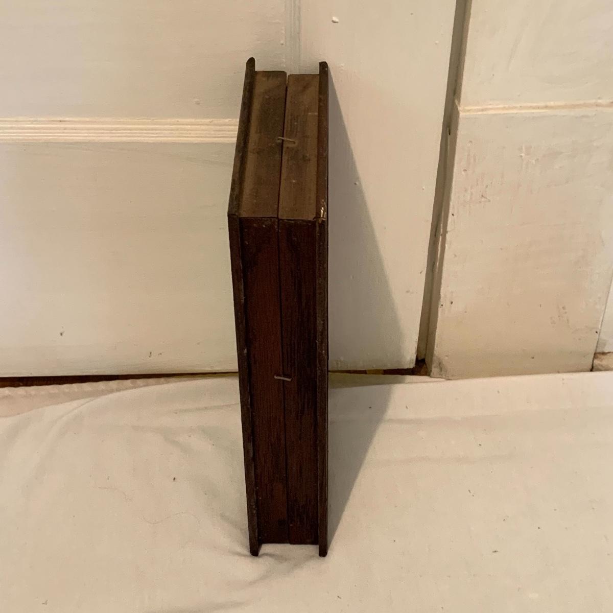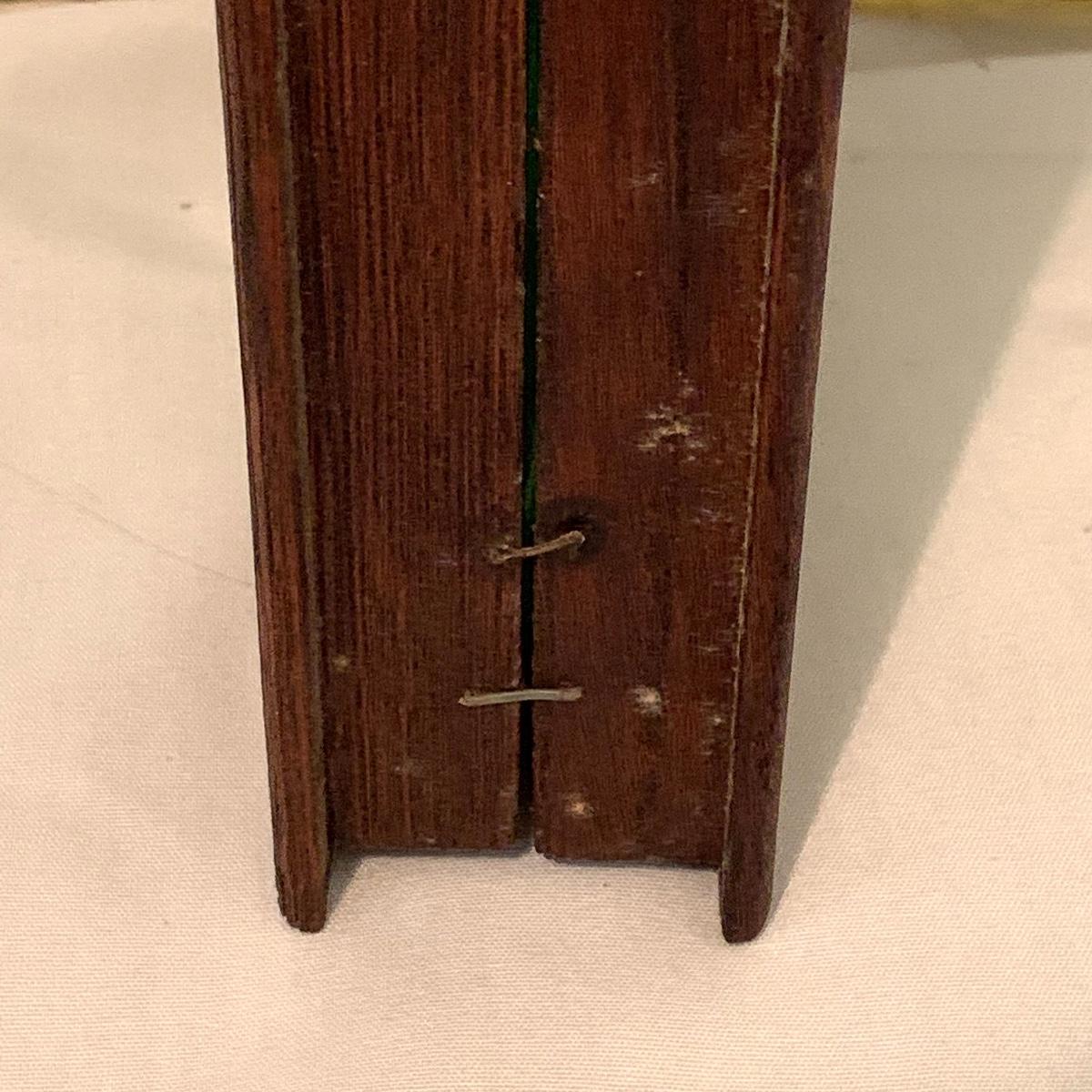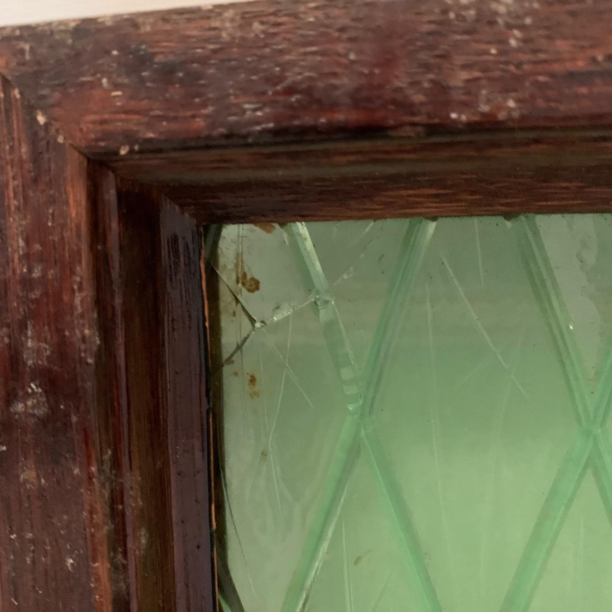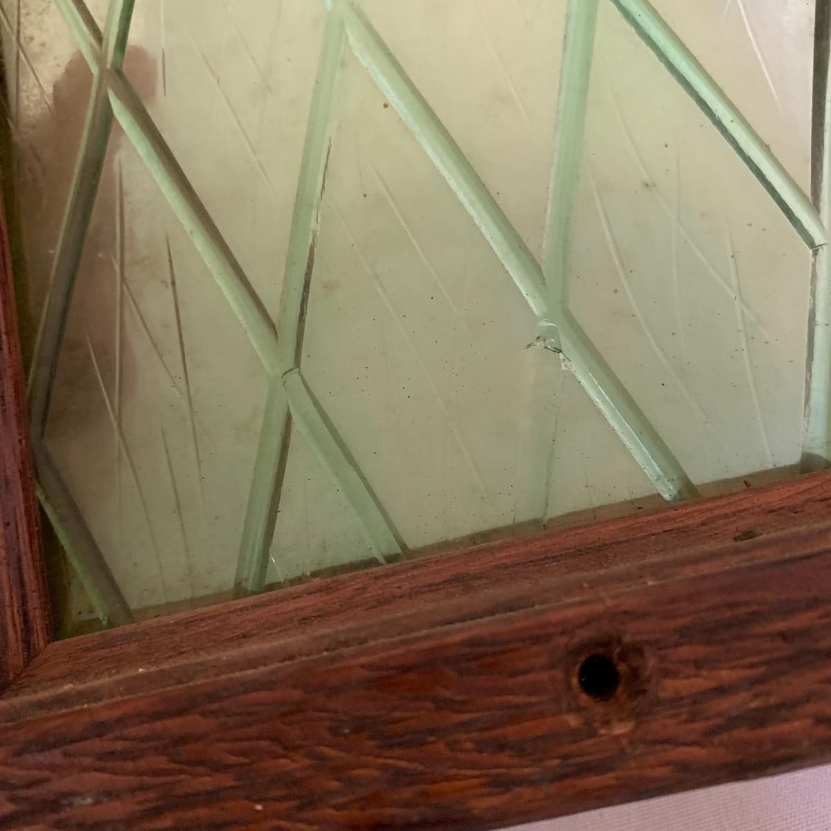 This lot includes four small (7.5” x 2.25” x 11.5”) glass windows. The glass has a light green tint and a textured argyle pattern. A label on one says they were made in West Germany. Each window comes in a two-part (front and back) wooden frame. One window has broken glass in a corner, but all the pieces are present. Another has a frame that is not currently attached, but could be glued back together. Another window has a small chip in the textured part of the design. Shipping Available