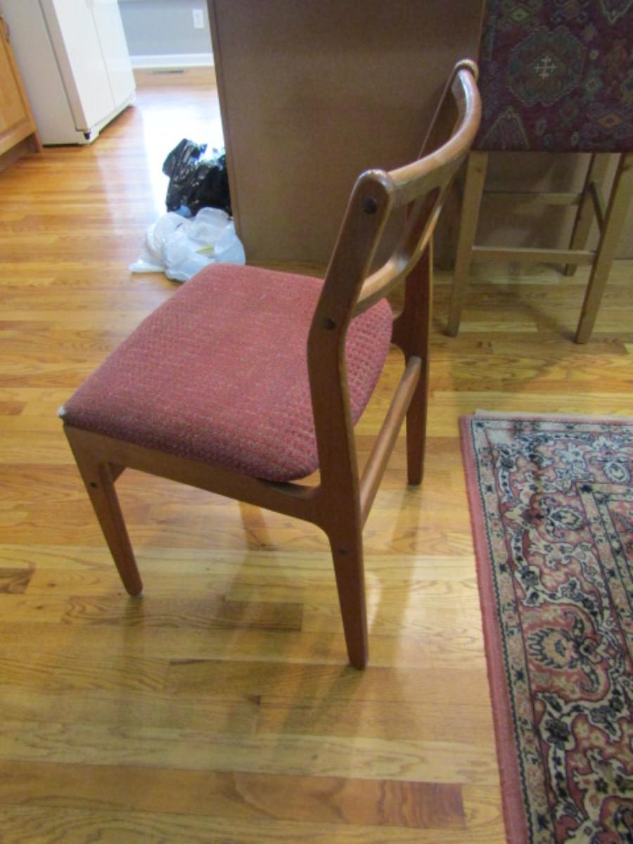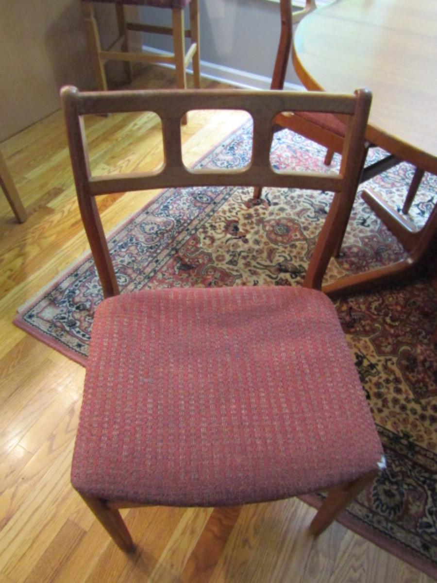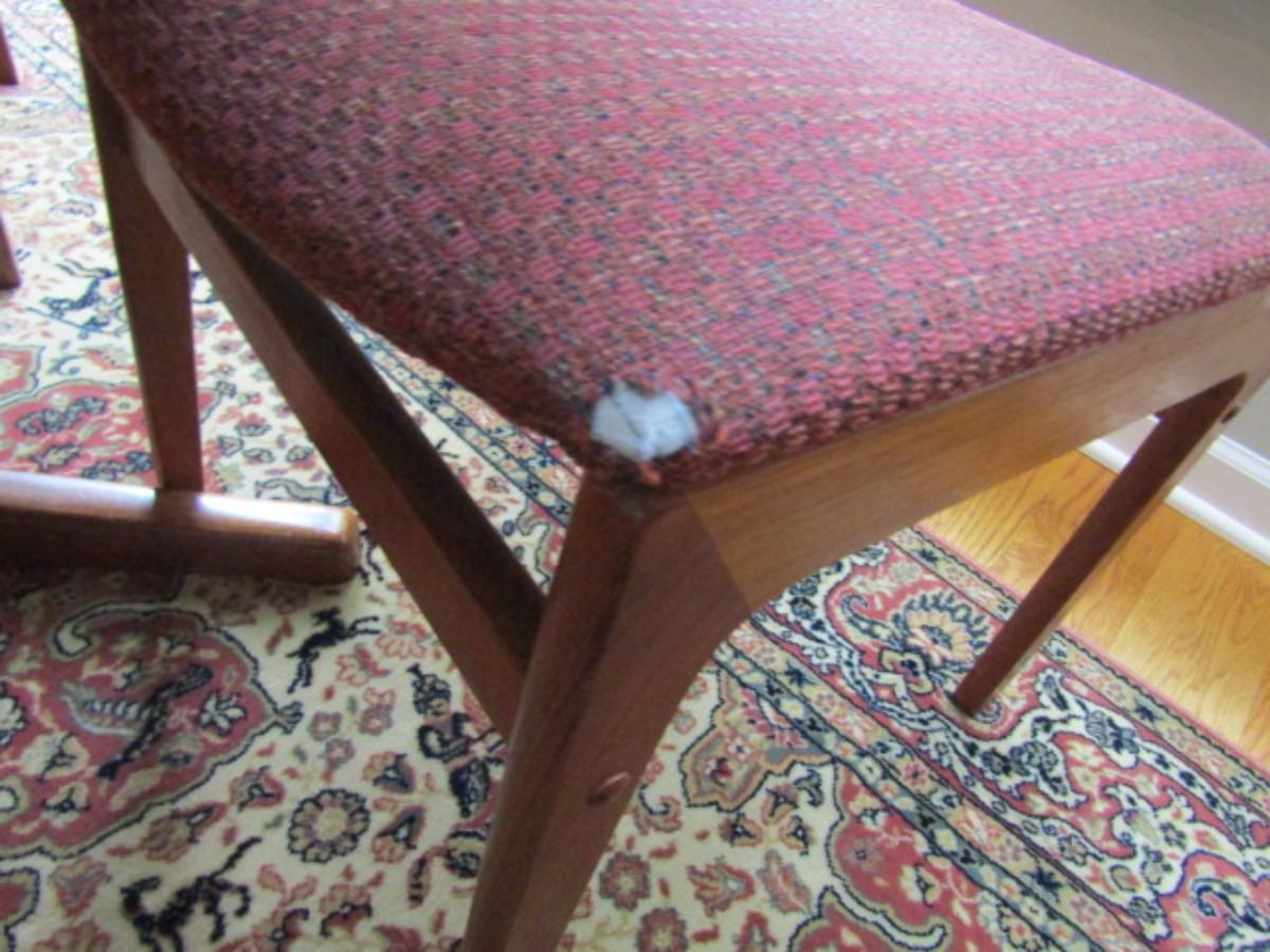 Four Upholstered Mid-Century Style Wooden Chairs. Please see all pictures- some holes in upholstery.