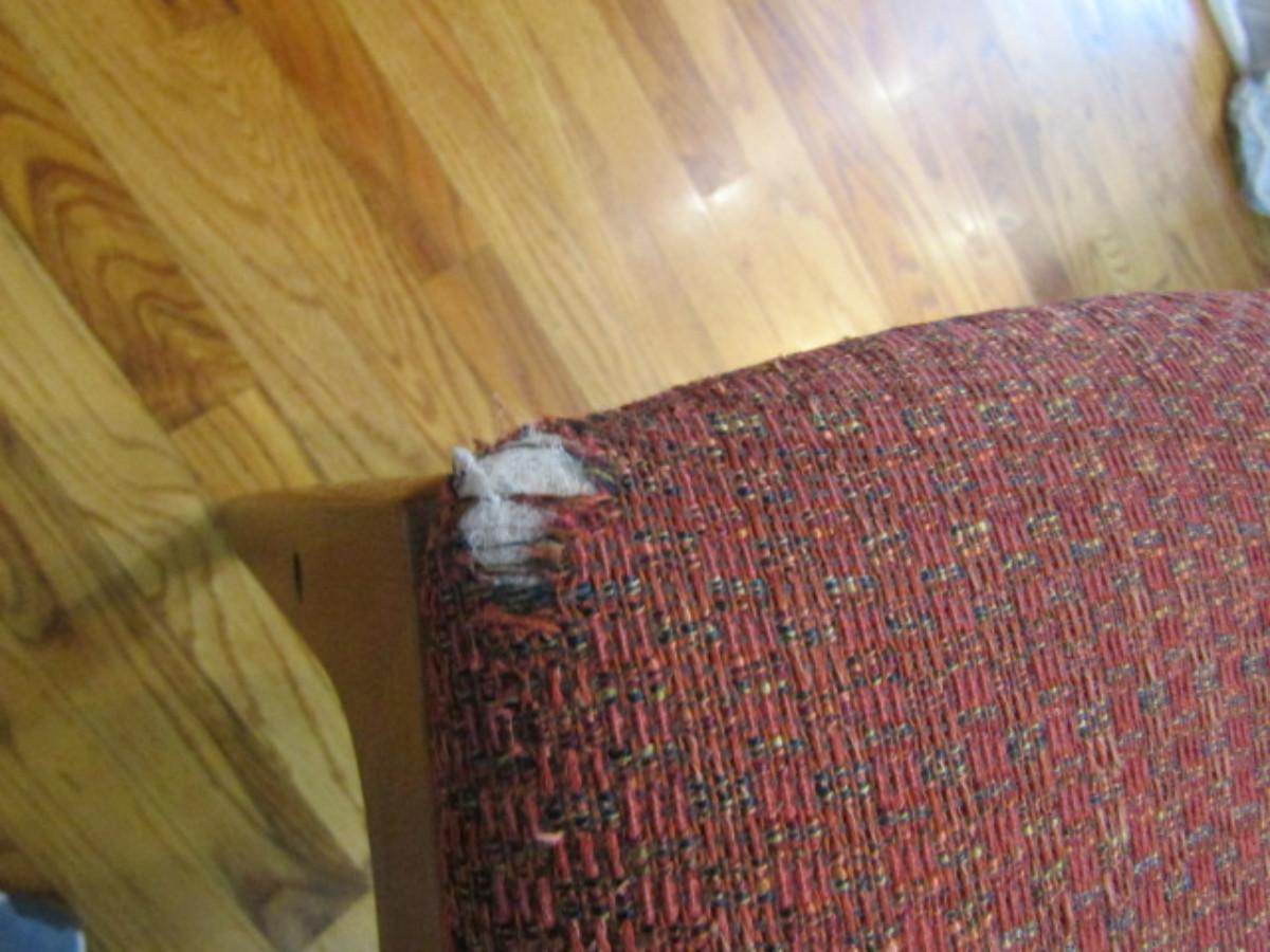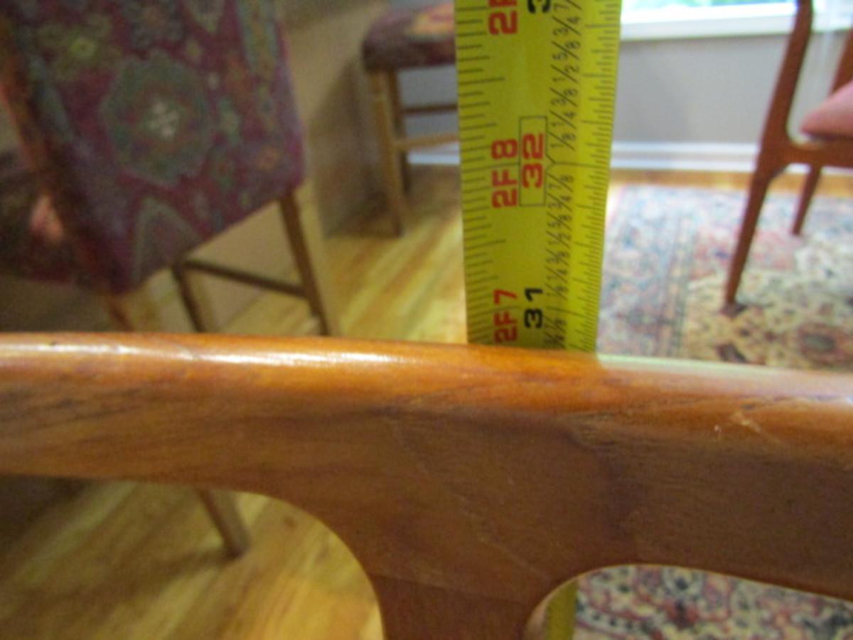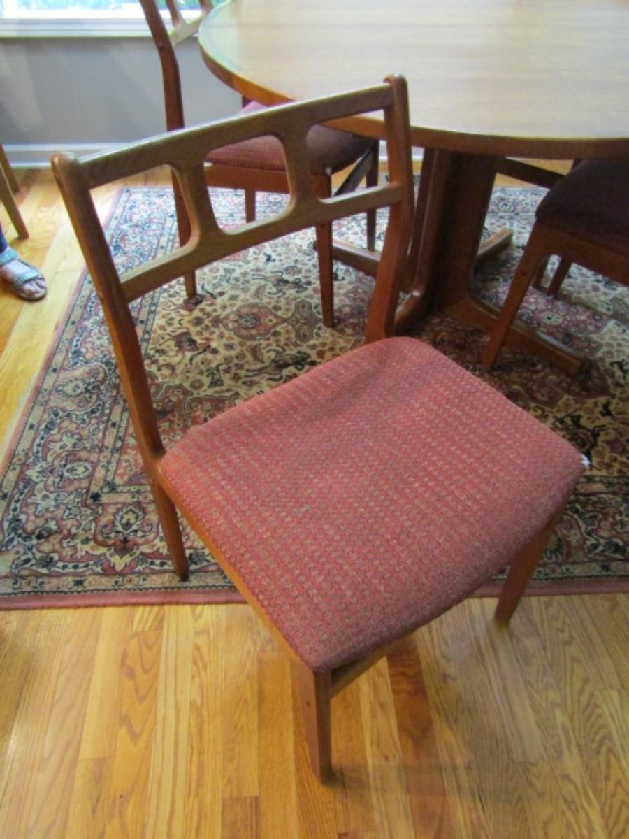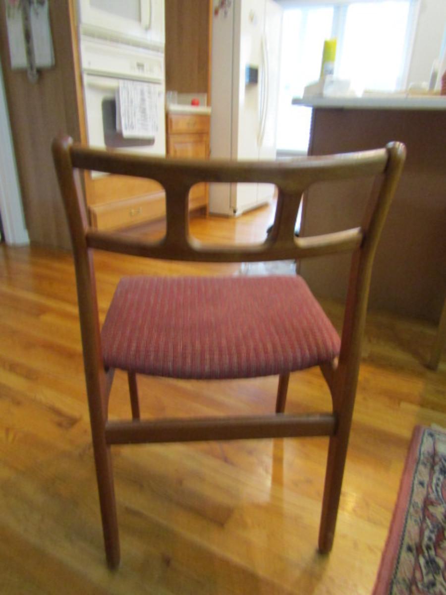 Four Upholstered Mid-Century Style Wooden Chairs. Please see all pictures- some holes in upholstery.