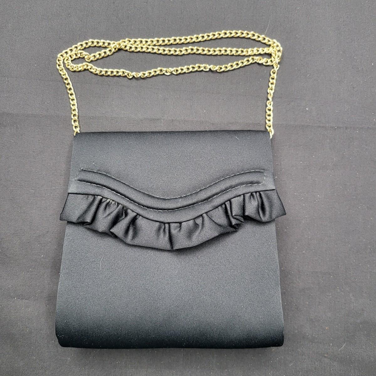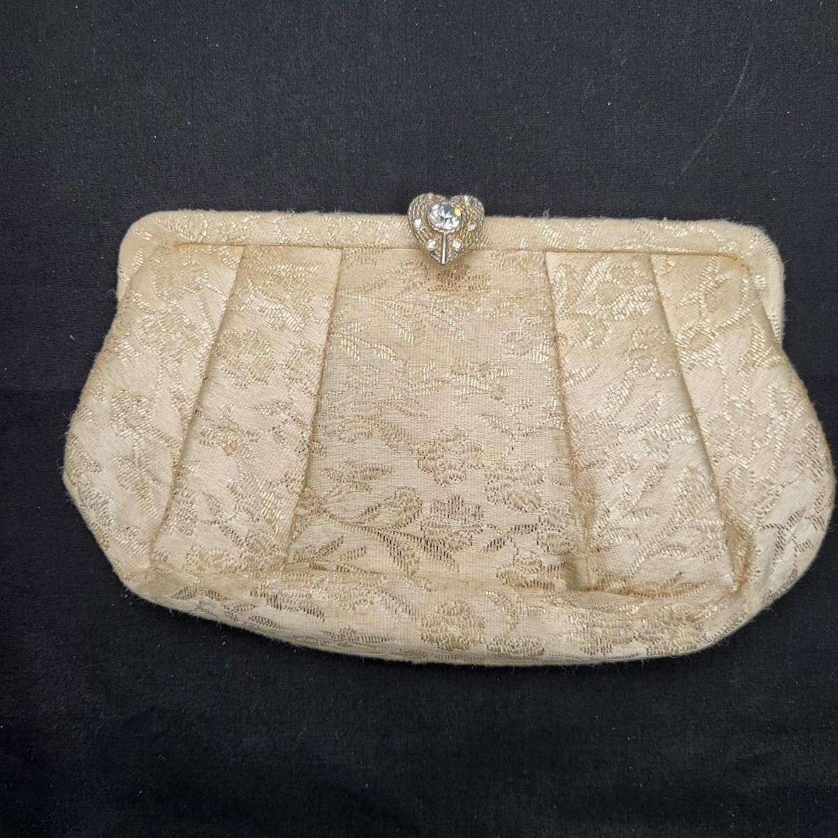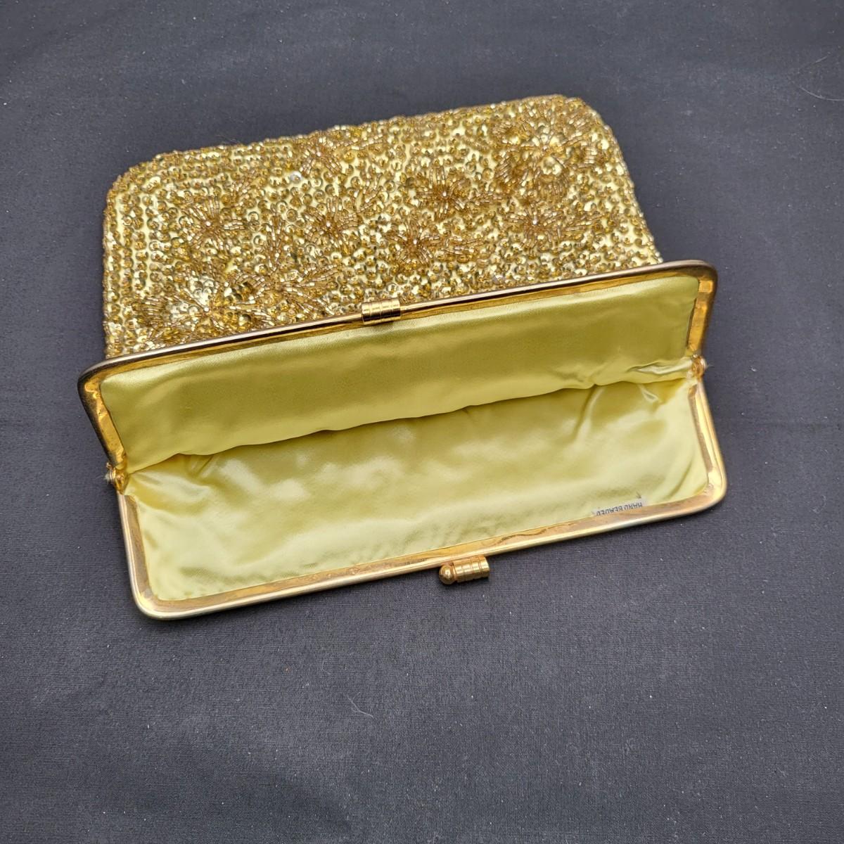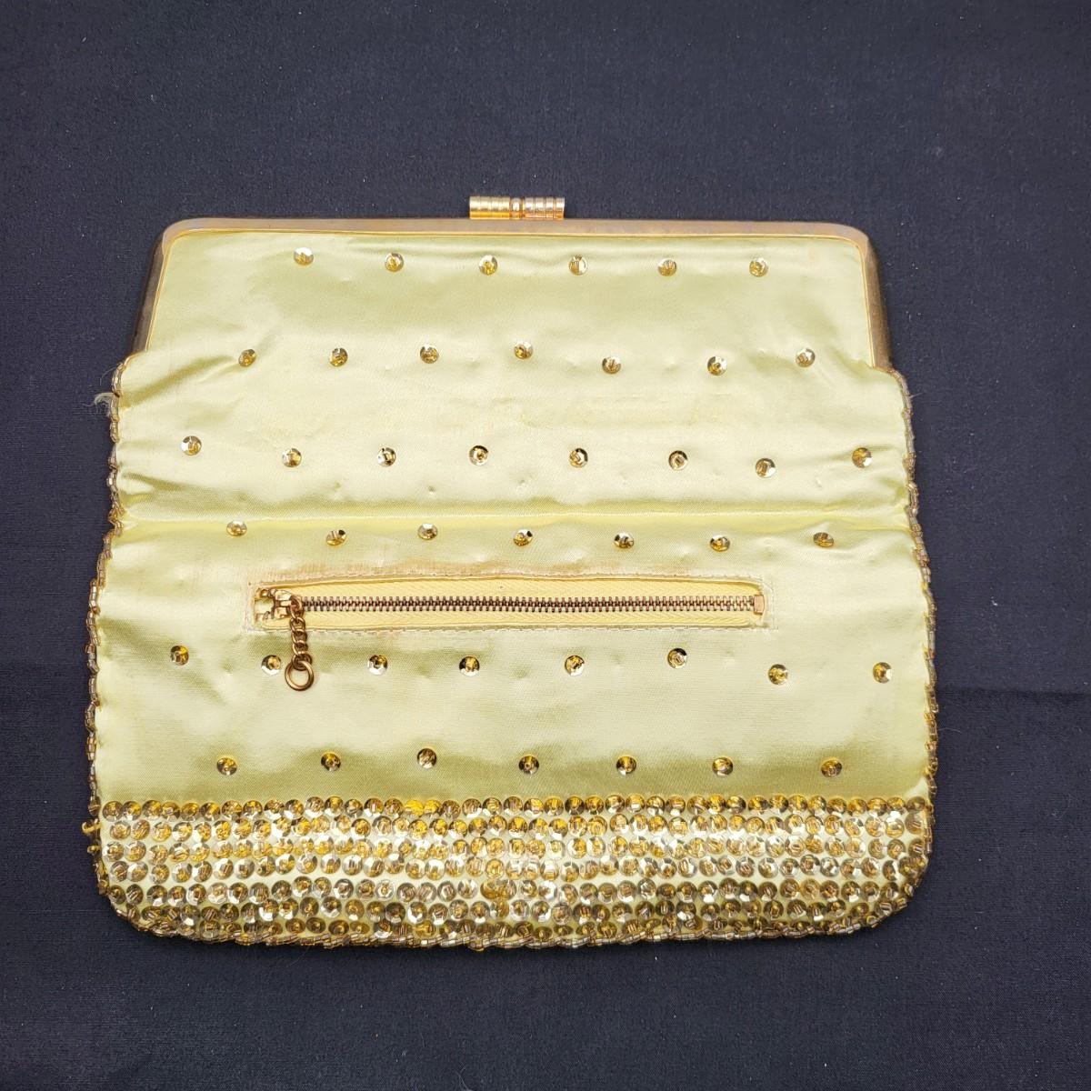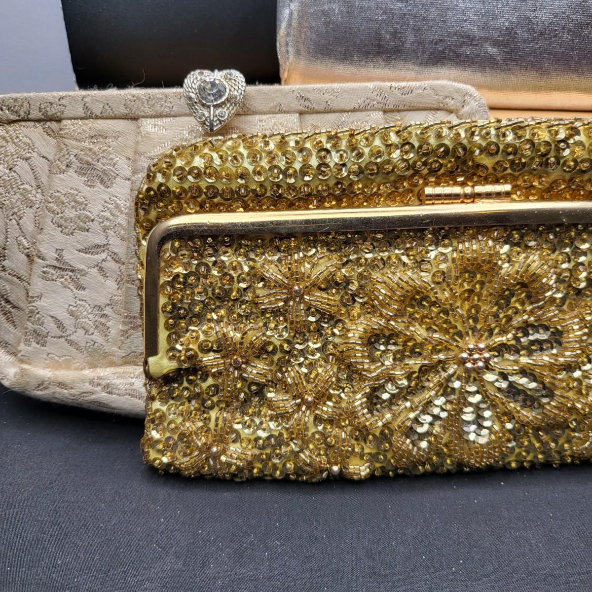 Four small, vintage clutch style Purses. Yellow/gold seed bead & sequin with kiss clasp, 8" x 4.5". Ivory color with silk embroidered flowers and heart shape clasp with rhinestones (one missing), 8" x 4.5". Silver Shimmer HL USA, purse with rhinestone snap closure and twist strap, 6.5"x6" with 14" srap length. Hand made in Hong Kong, black satin with ruffle front, snap closure, 6"x6". Goldtone chain strap 13"