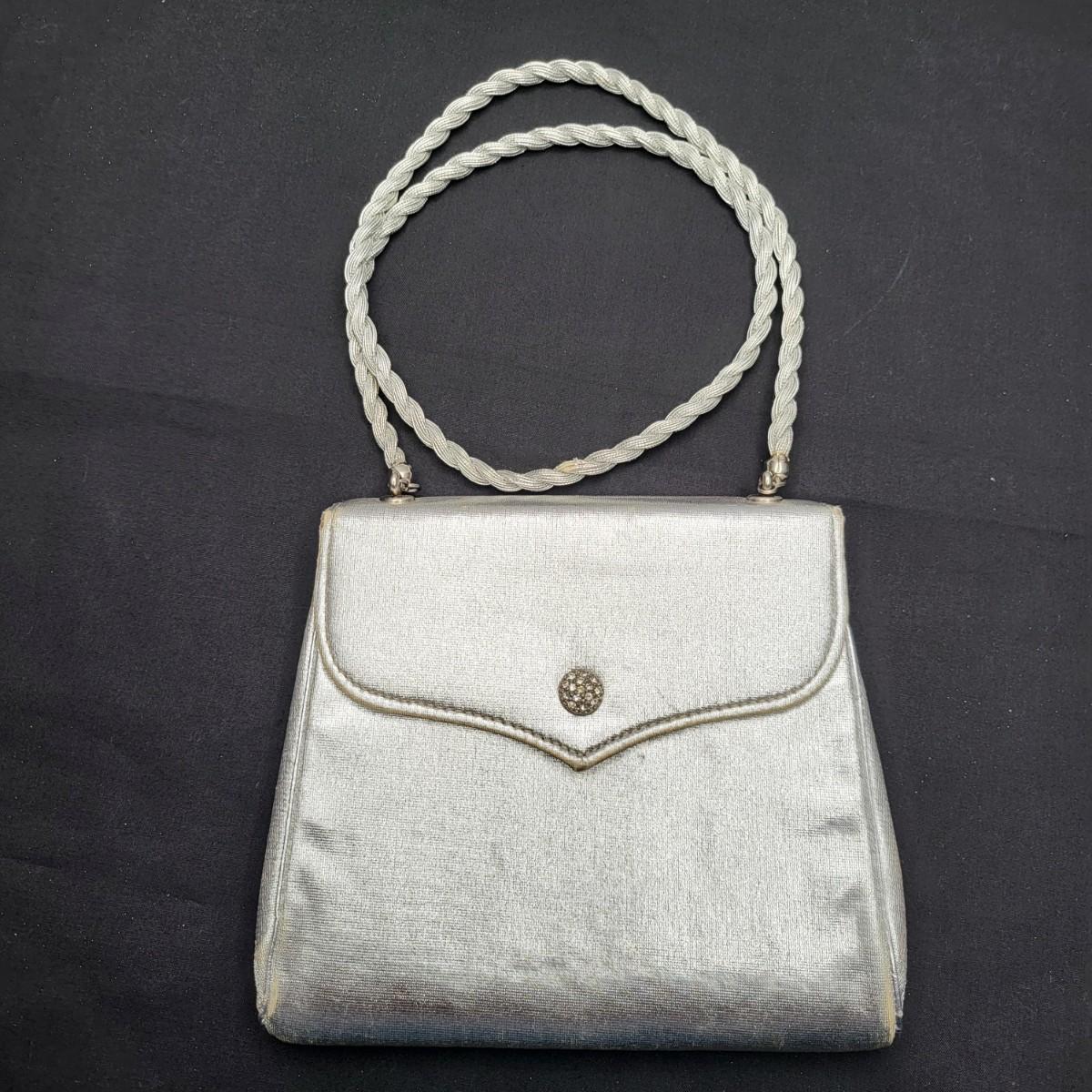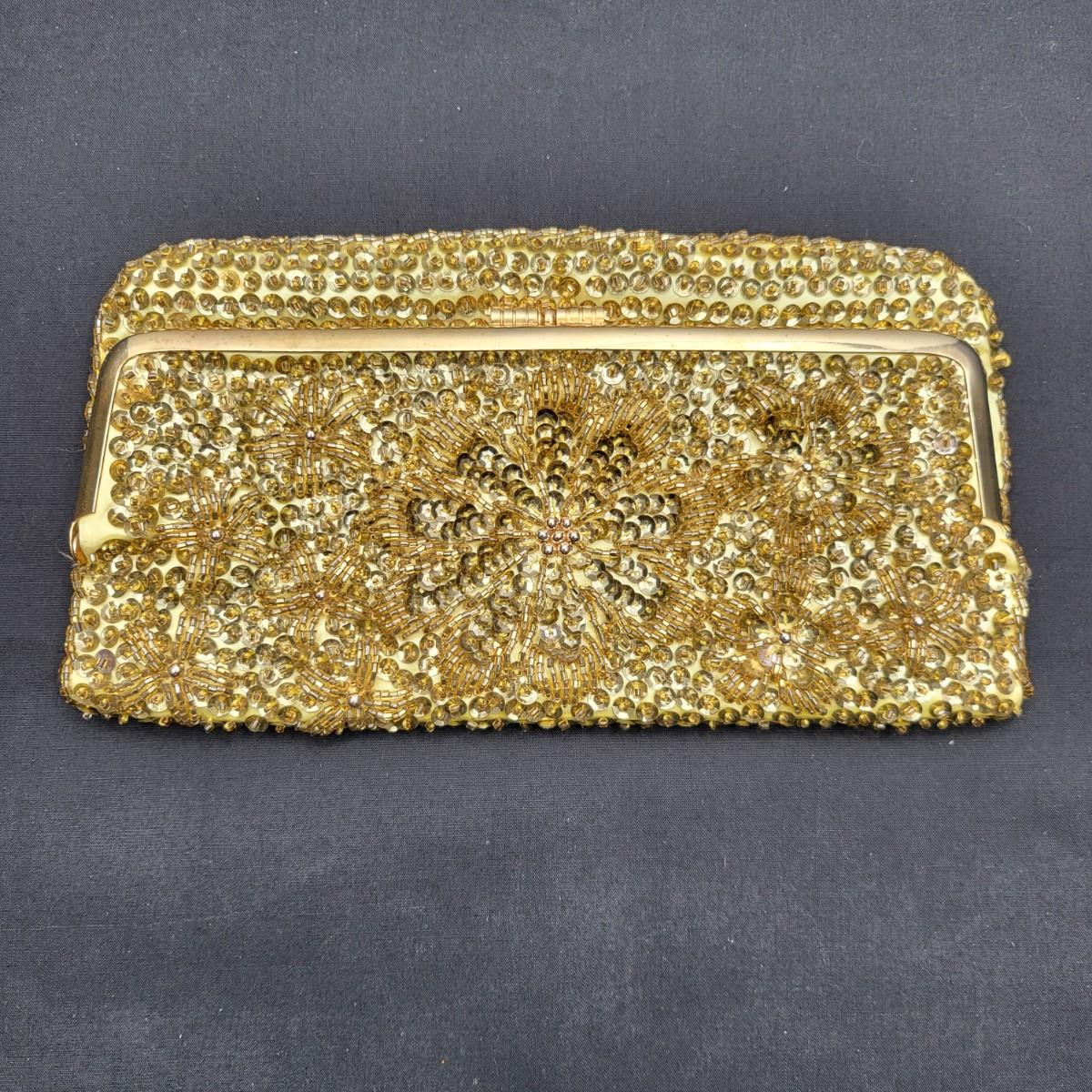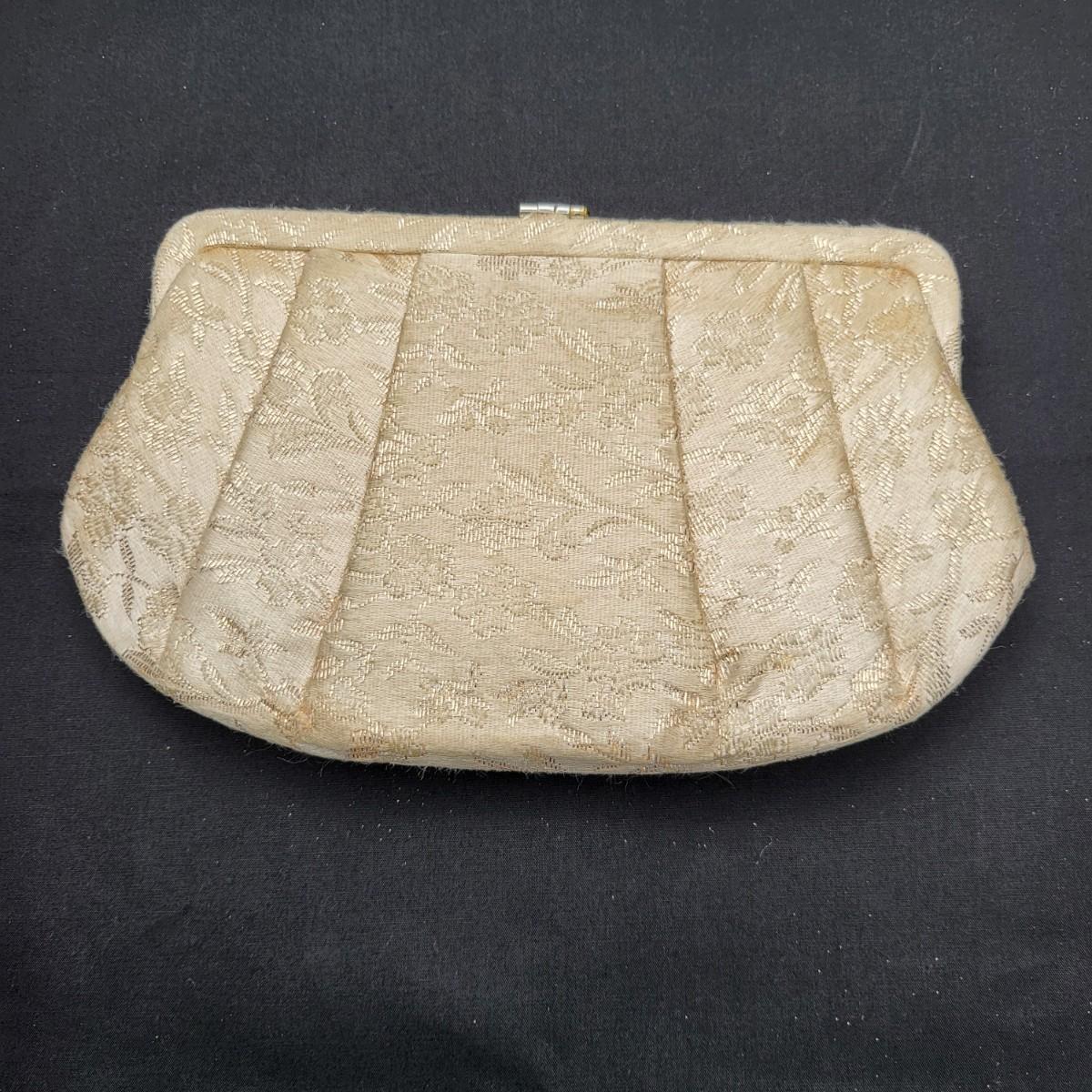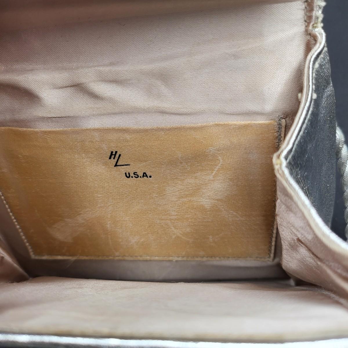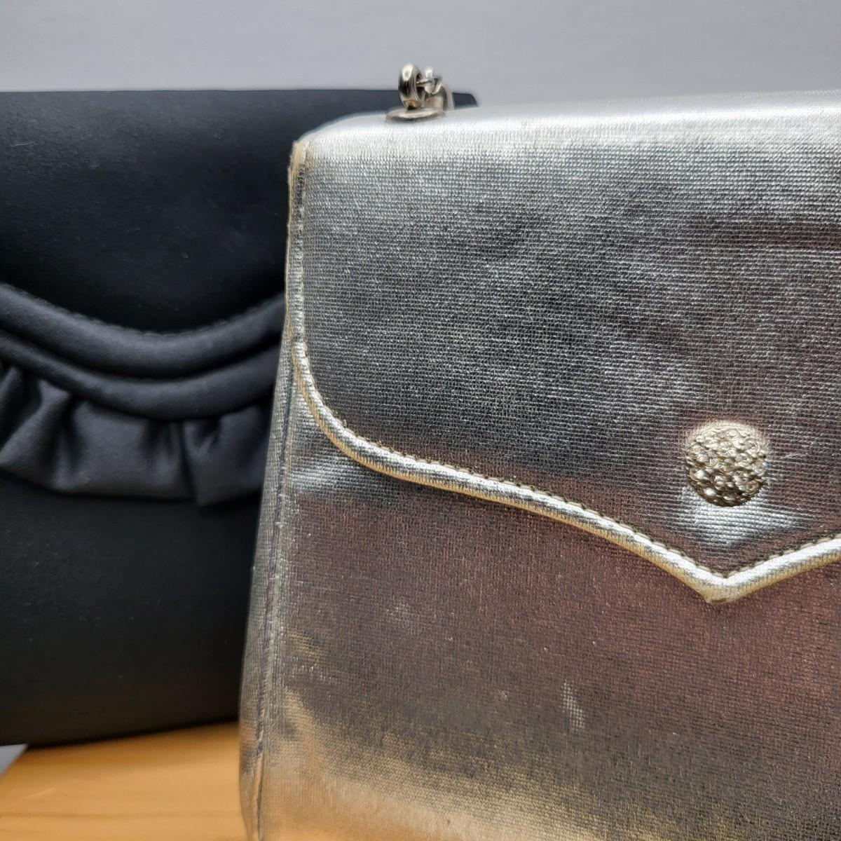 Four small, vintage clutch style Purses. Yellow/gold seed bead & sequin with kiss clasp, 8" x 4.5". Ivory color with silk embroidered flowers and heart shape clasp with rhinestones (one missing), 8" x 4.5". Silver Shimmer HL USA, purse with rhinestone snap closure and twist strap, 6.5"x6" with 14" srap length. Hand made in Hong Kong, black satin with ruffle front, snap closure, 6"x6". Goldtone chain strap 13"