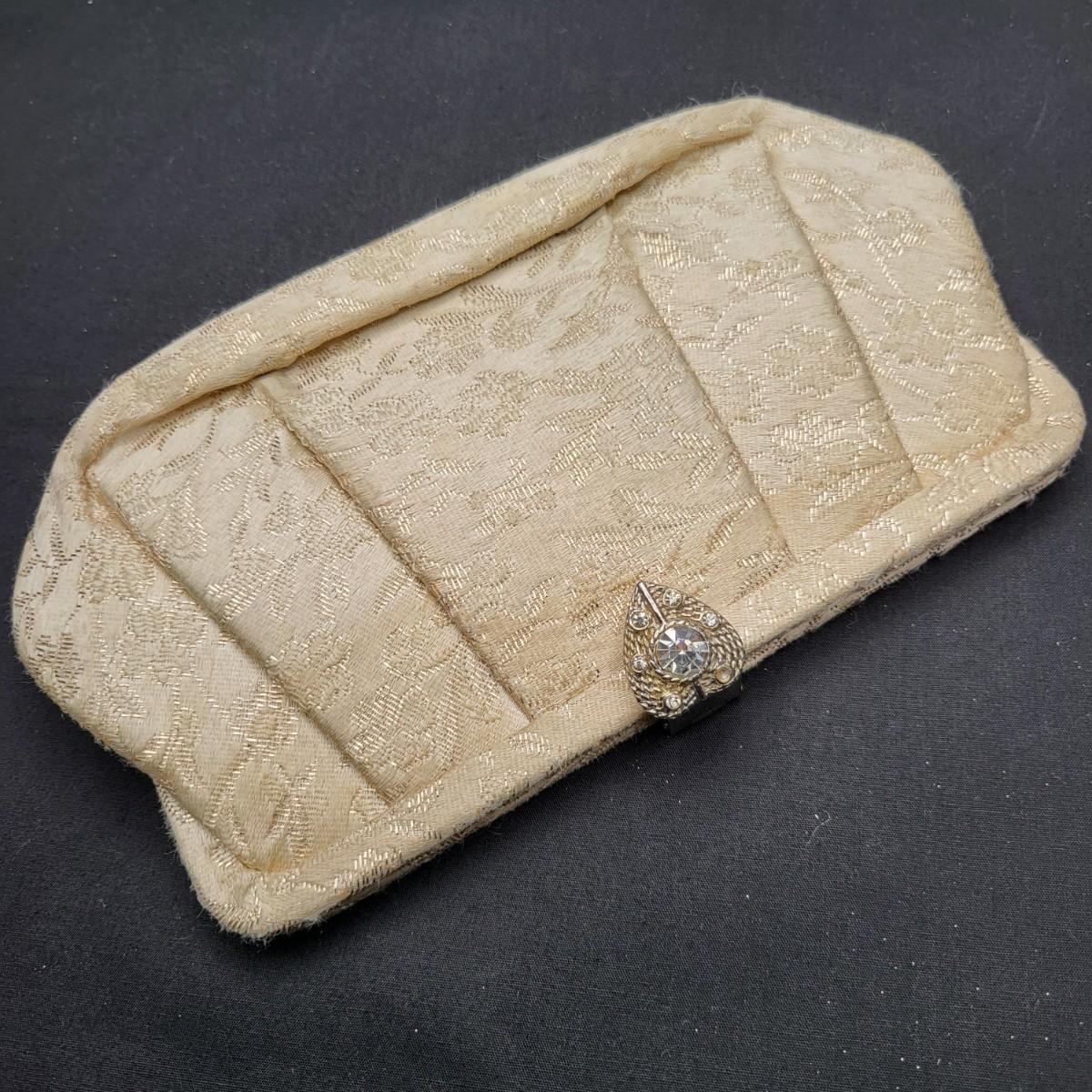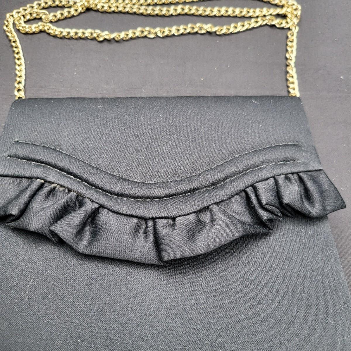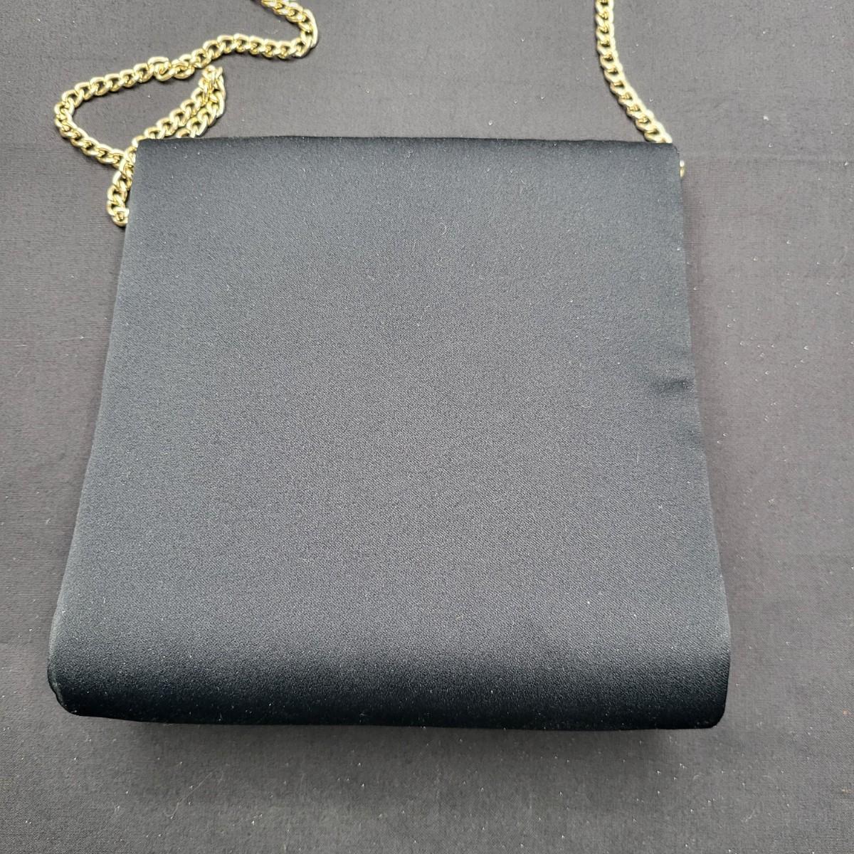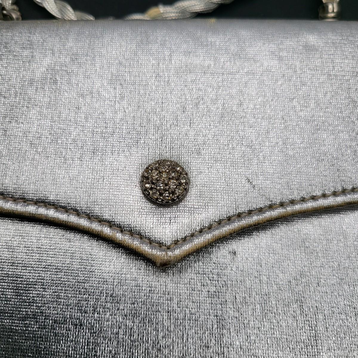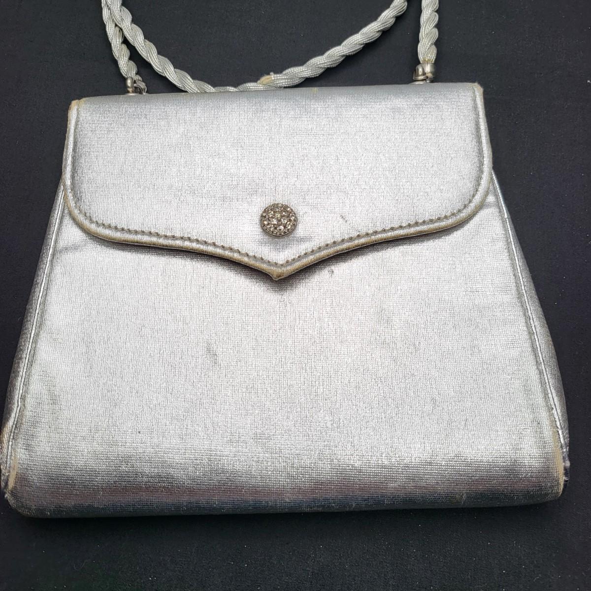 Four small, vintage clutch style Purses. Yellow/gold seed bead & sequin with kiss clasp, 8" x 4.5". Ivory color with silk embroidered flowers and heart shape clasp with rhinestones (one missing), 8" x 4.5". Silver Shimmer HL USA, purse with rhinestone snap closure and twist strap, 6.5"x6" with 14" srap length. Hand made in Hong Kong, black satin with ruffle front, snap closure, 6"x6". Goldtone chain strap 13"