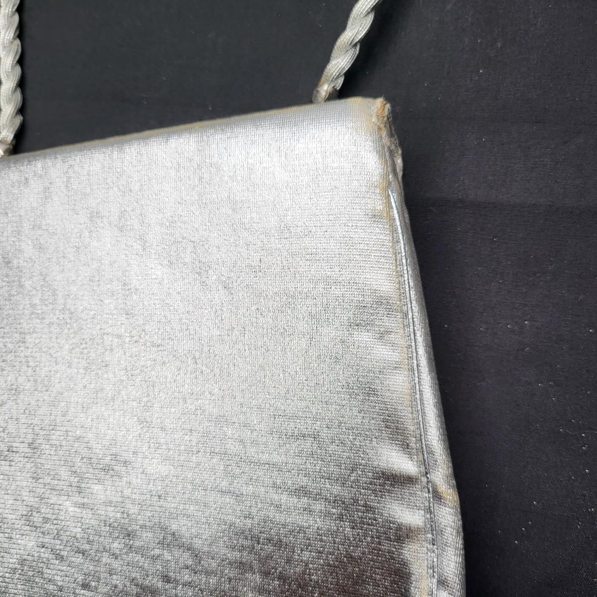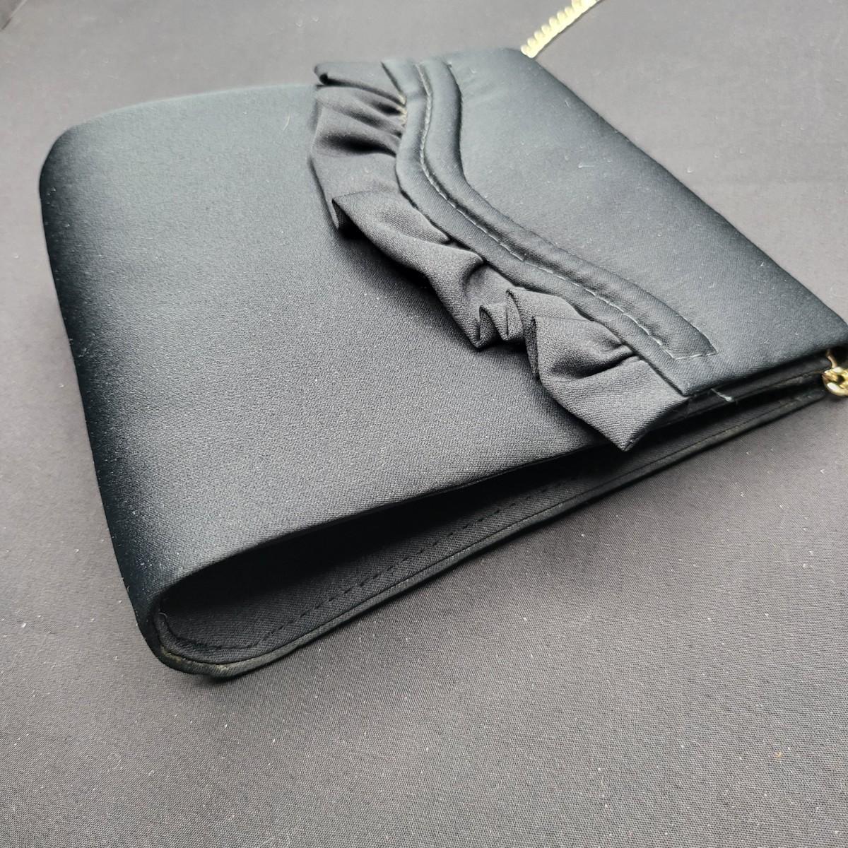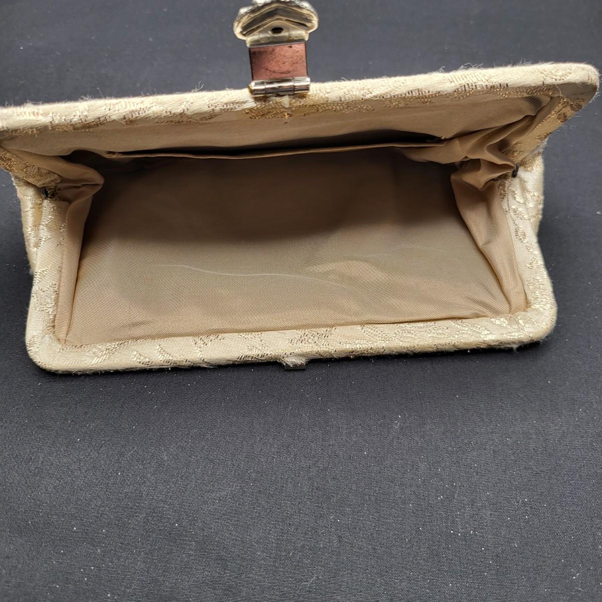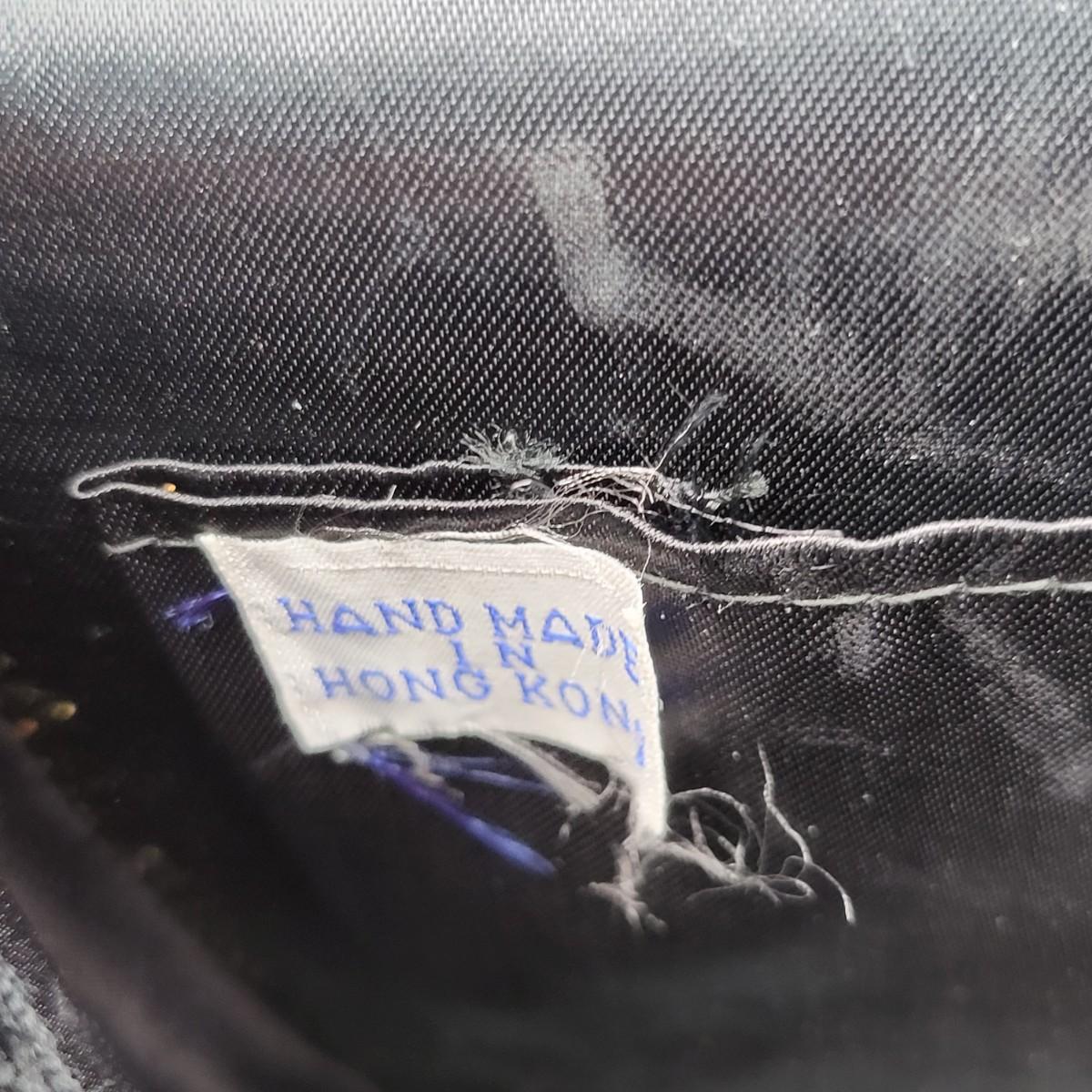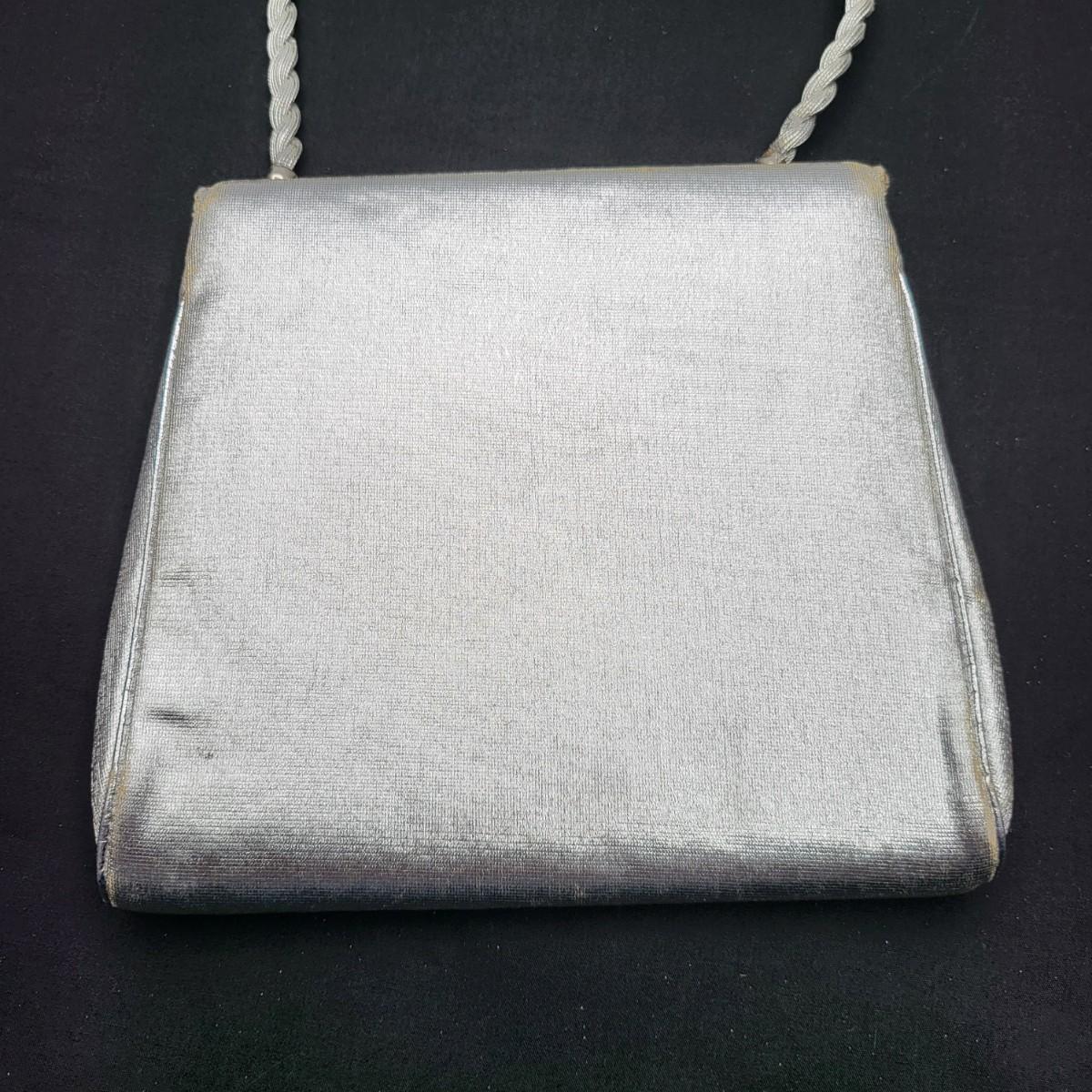 Four small, vintage clutch style Purses. Yellow/gold seed bead & sequin with kiss clasp, 8" x 4.5". Ivory color with silk embroidered flowers and heart shape clasp with rhinestones (one missing), 8" x 4.5". Silver Shimmer HL USA, purse with rhinestone snap closure and twist strap, 6.5"x6" with 14" srap length. Hand made in Hong Kong, black satin with ruffle front, snap closure, 6"x6". Goldtone chain strap 13"