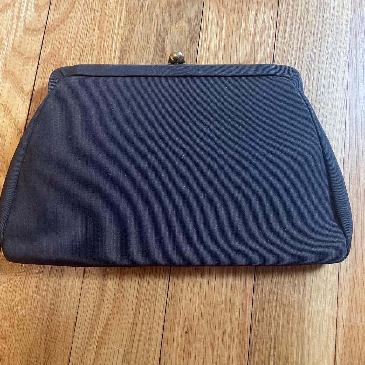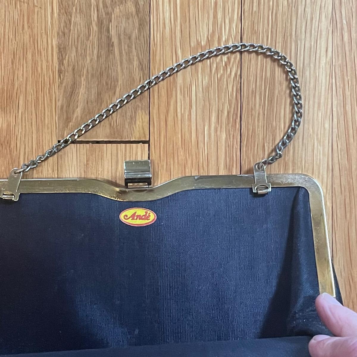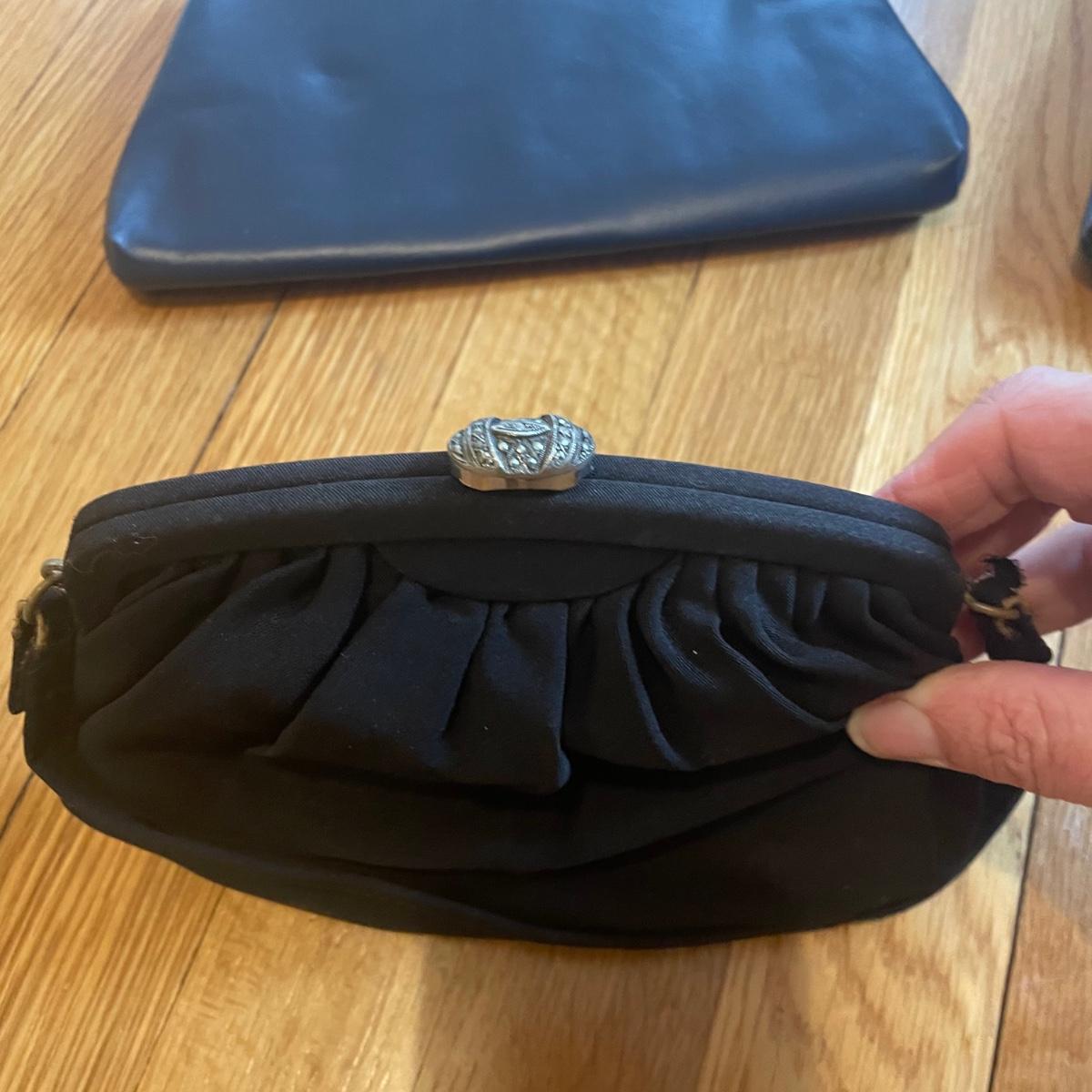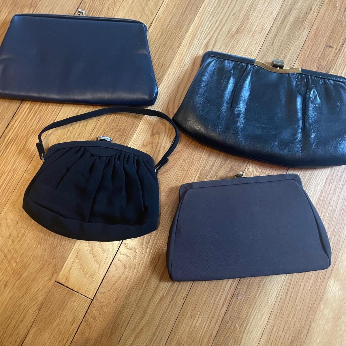 These four purses are in excellent condition. The largest black purse is the only one with a brand name, Ande. The brown silk purse has a matching coin purse with original elasticated rope intact, name on purse is worn and indecipherable. The smallest purse is a black chiffon-like material and the larger blue and black purses appear to be leather.