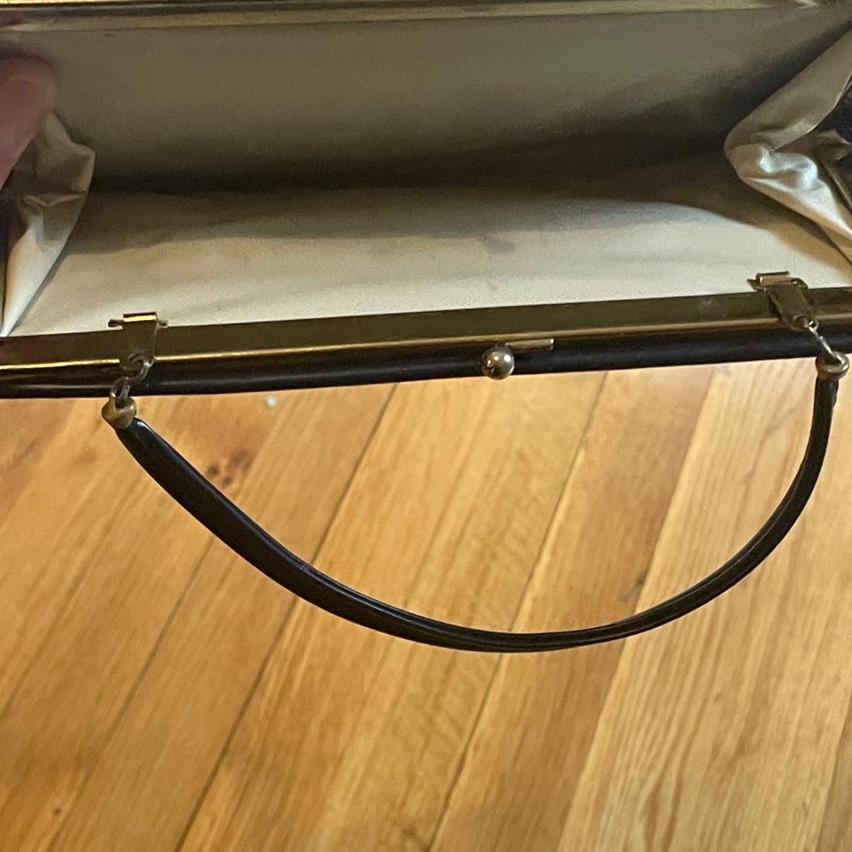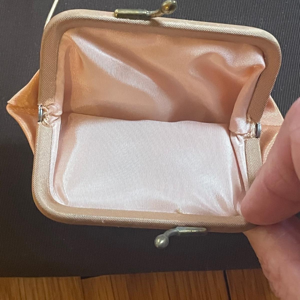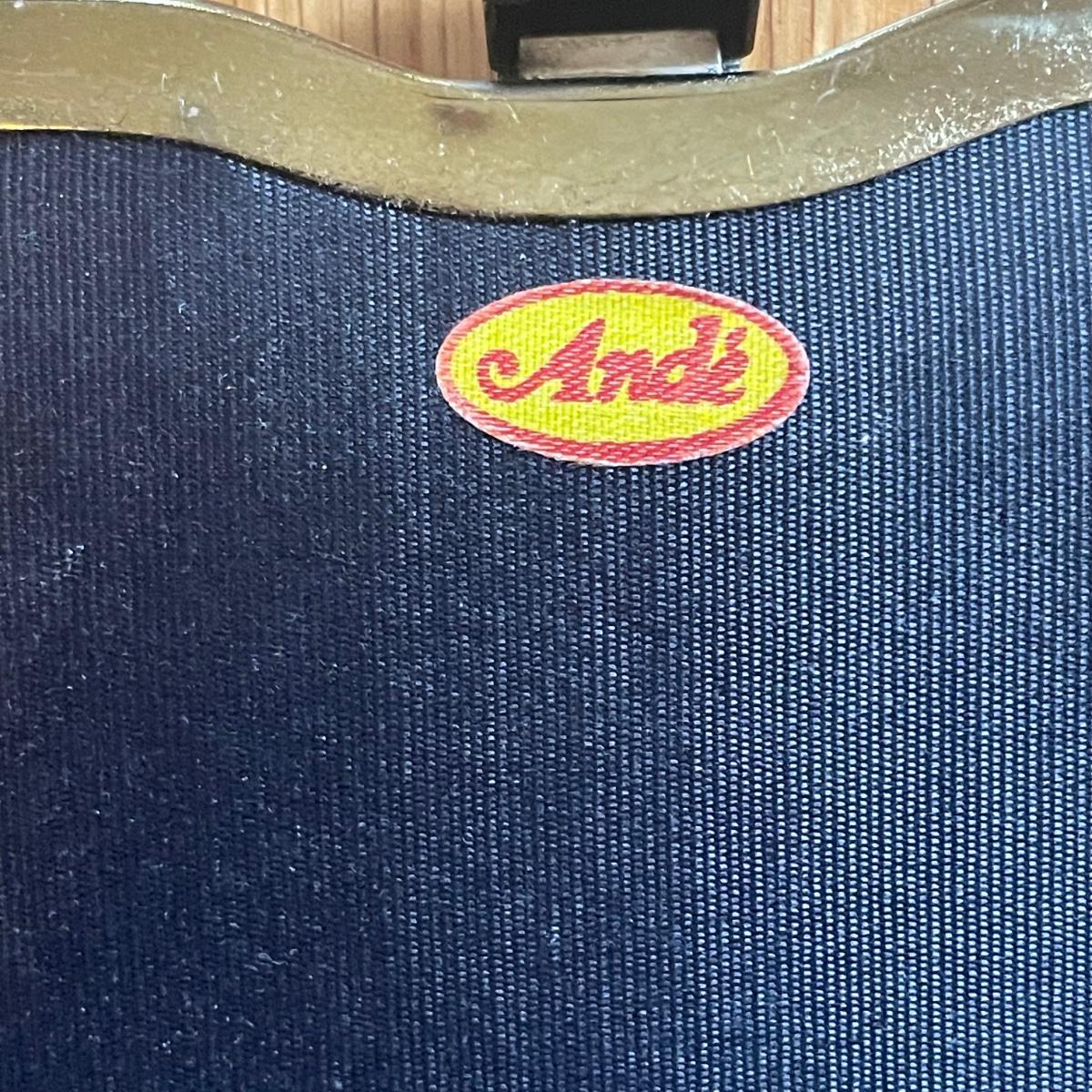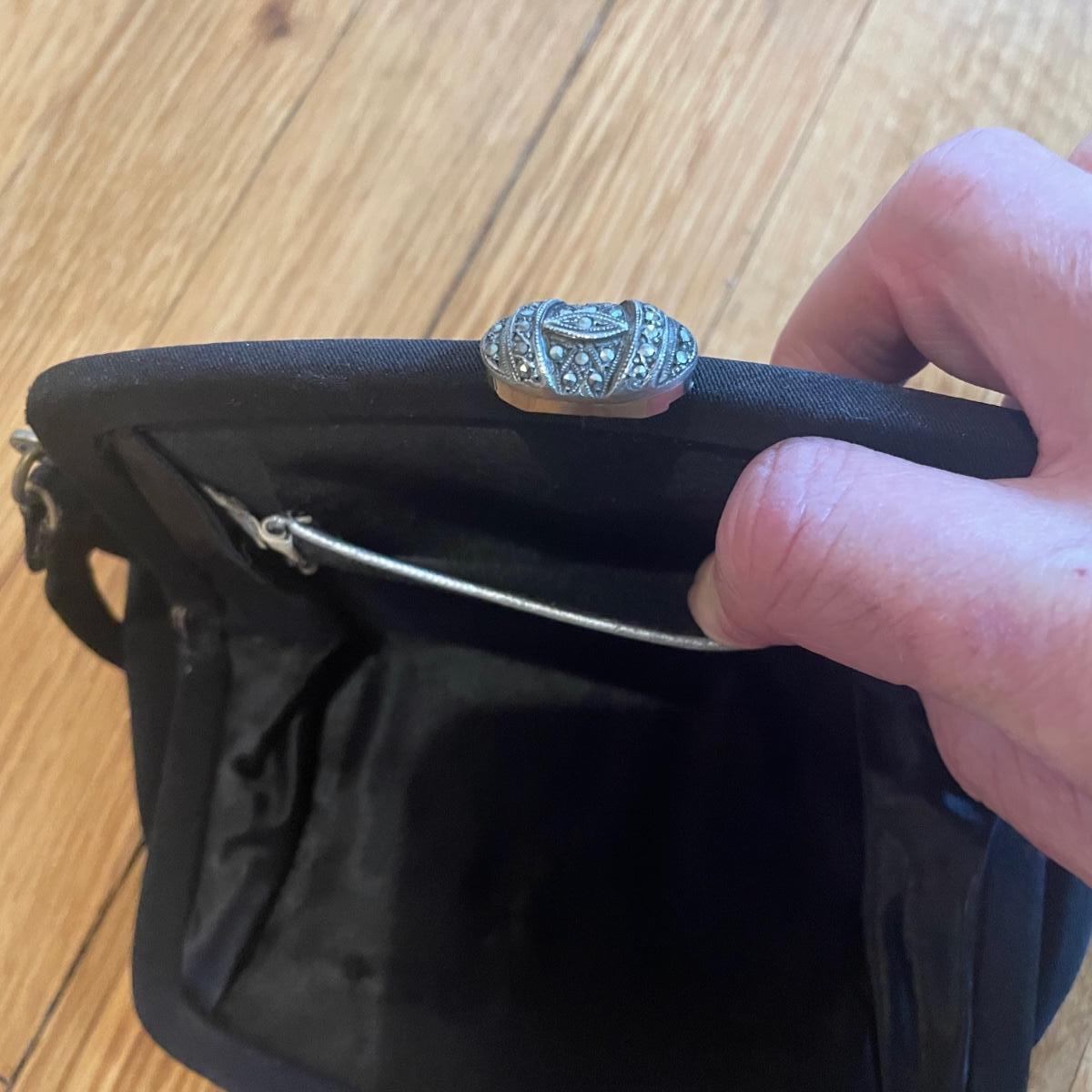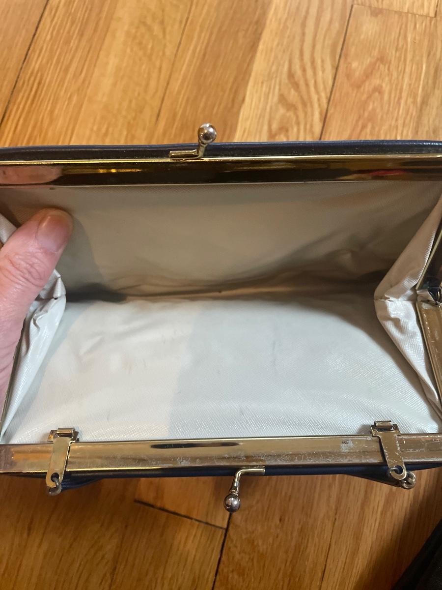 These four purses are in excellent condition. The largest black purse is the only one with a brand name, Ande. The brown silk purse has a matching coin purse with original elasticated rope intact, name on purse is worn and indecipherable. The smallest purse is a black chiffon-like material and the larger blue and black purses appear to be leather.