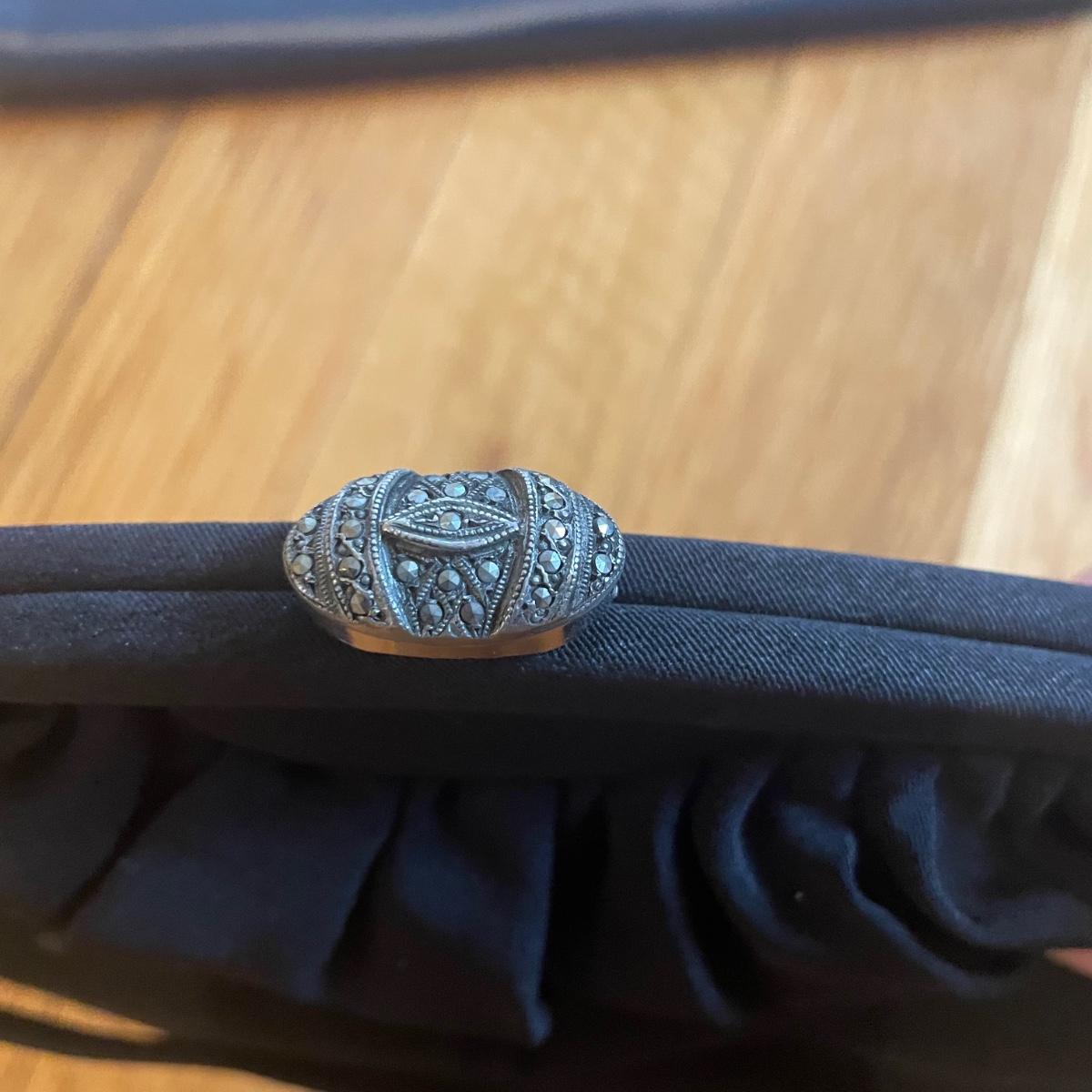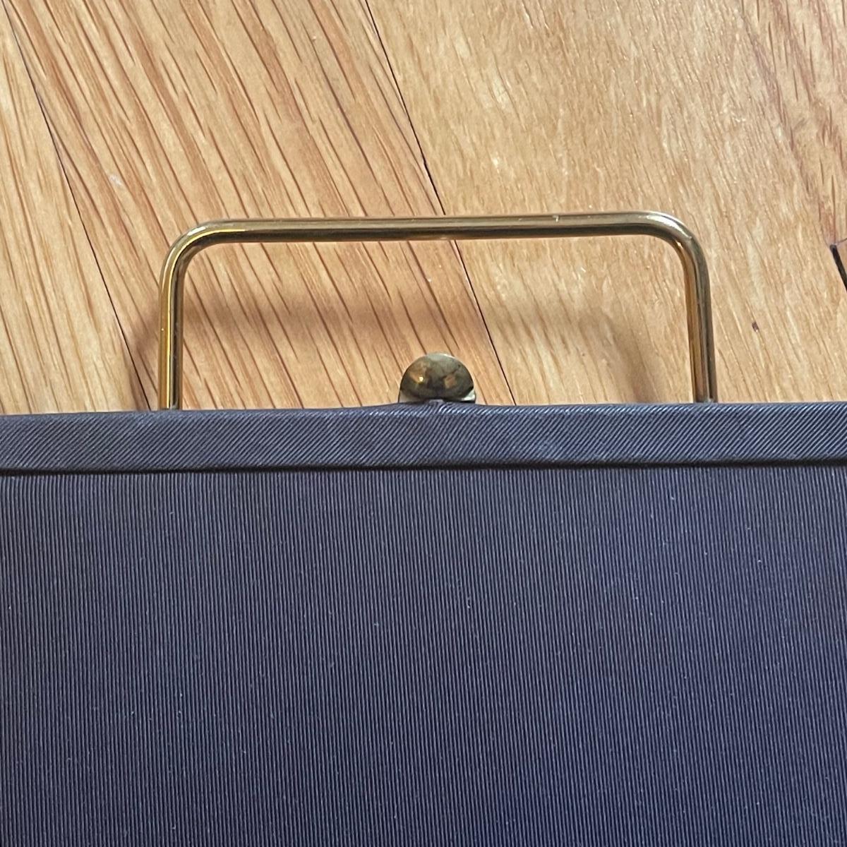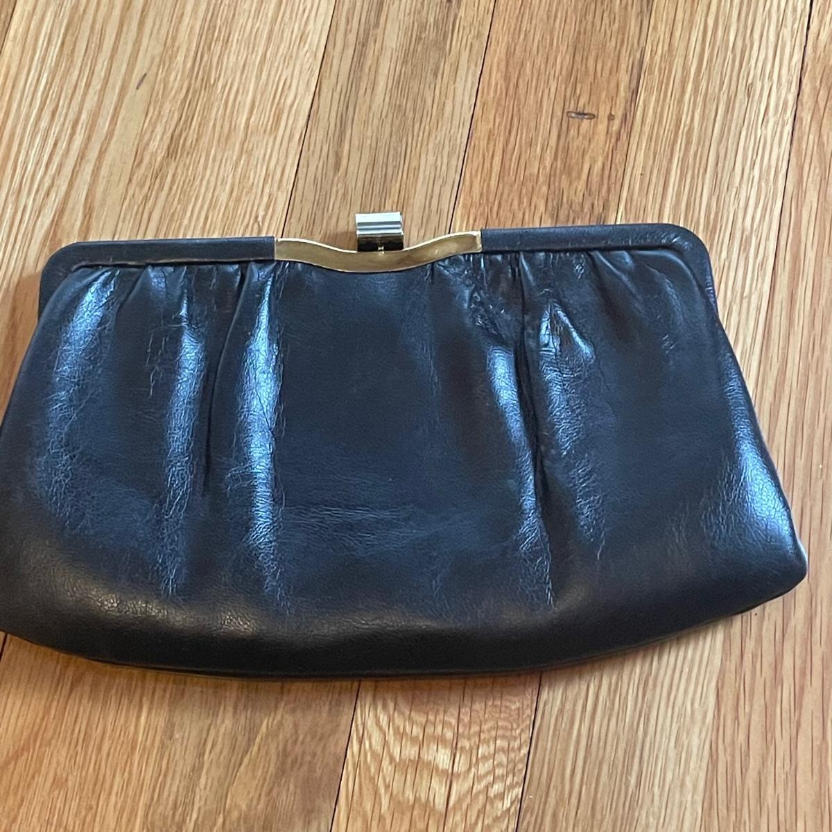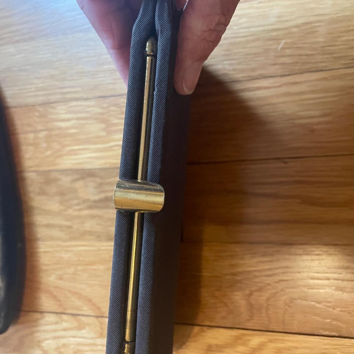 These four purses are in excellent condition. The largest black purse is the only one with a brand name, Ande. The brown silk purse has a matching coin purse with original elasticated rope intact, name on purse is worn and indecipherable. The smallest purse is a black chiffon-like material and the larger blue and black purses appear to be leather.