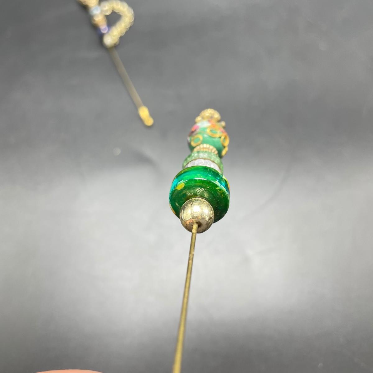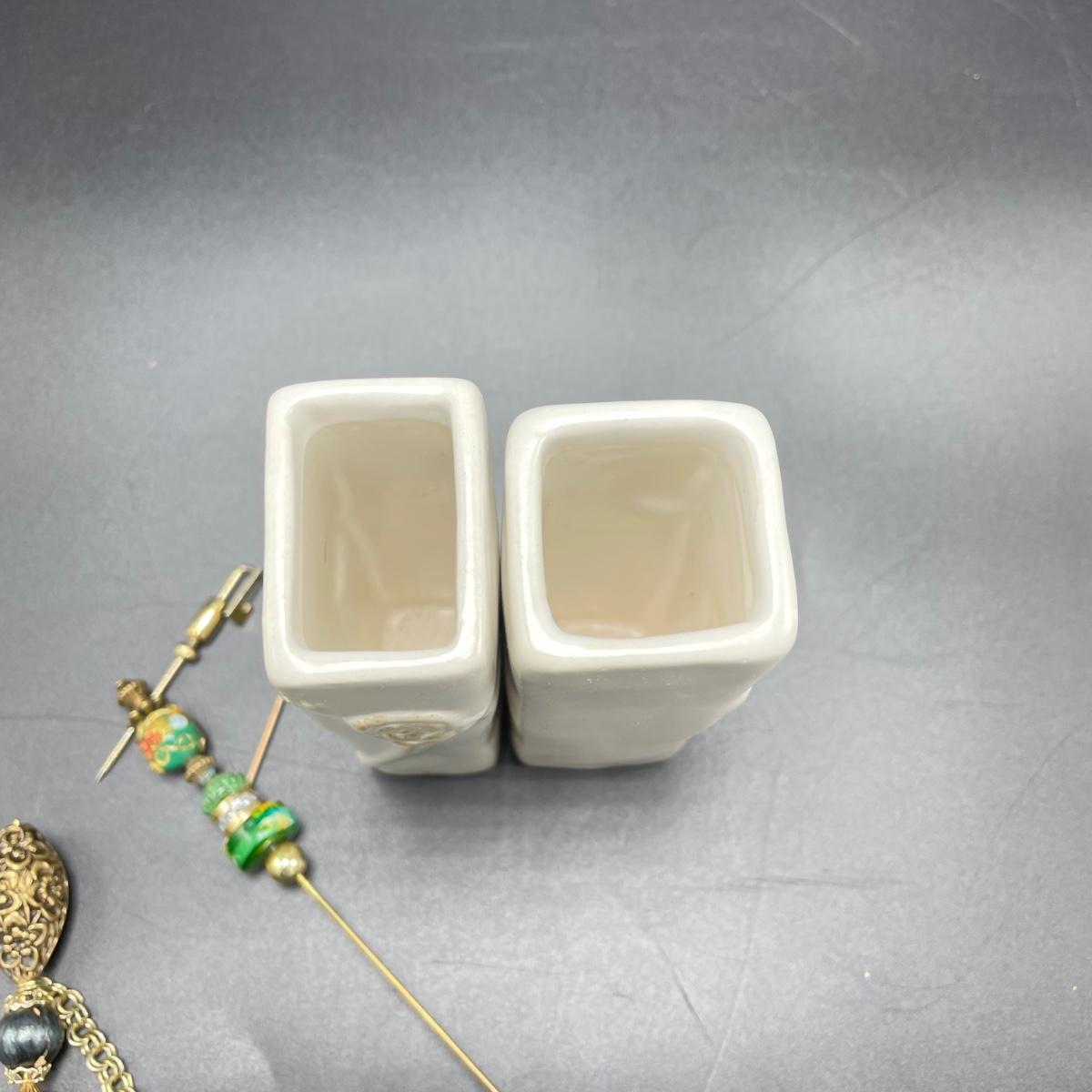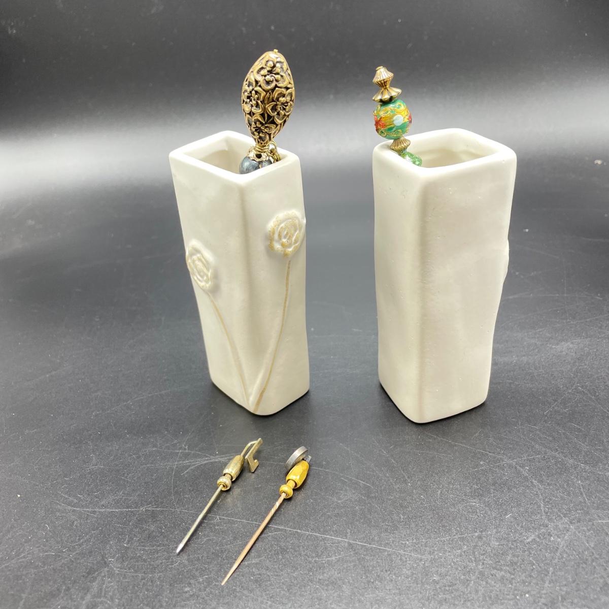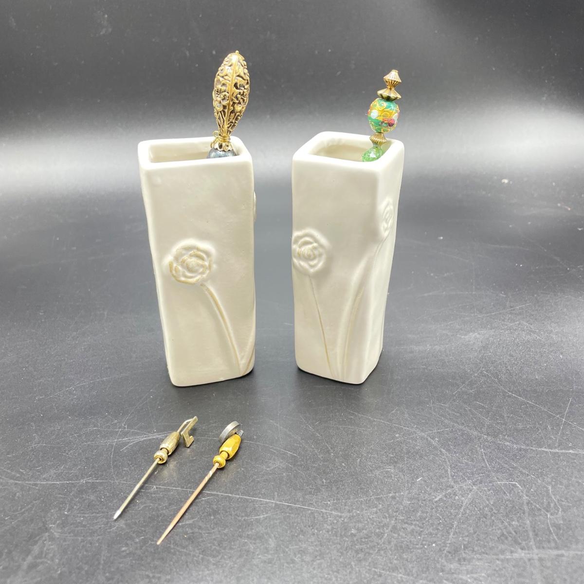 Four vintage hat pins with porcelain hat pin holders. Two hat pins have layered beads and appear to be a mix of materials including wood and plastic, very lightweight. The smaller two are metal one with tiny pearl colored beads inset in metal. The matching hat pin holders are just over 4” tall, one is square and the other rectangle. See images. Shipping available.