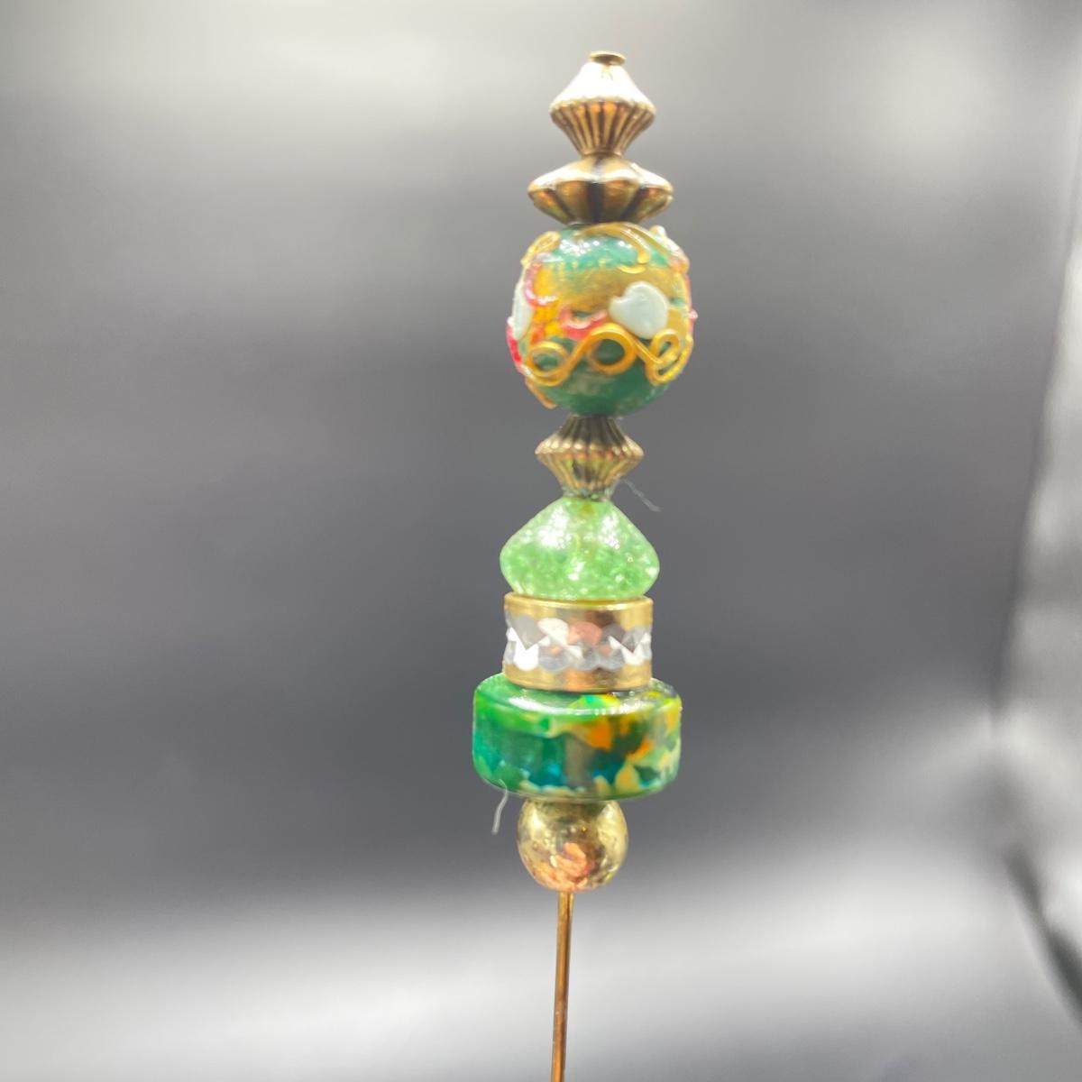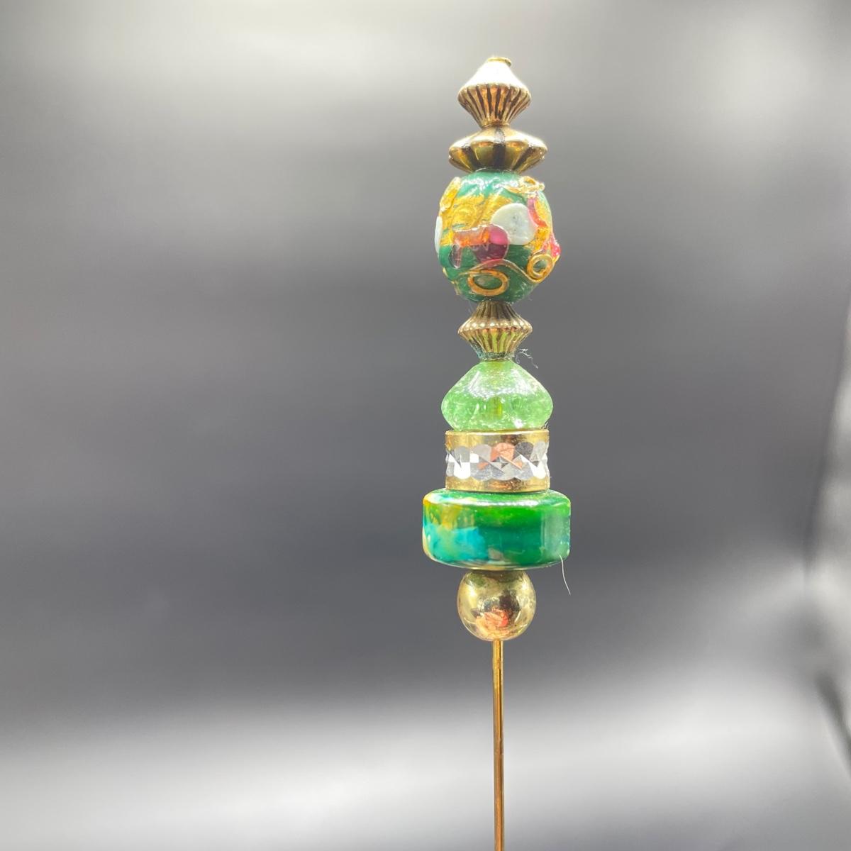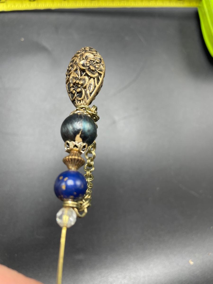 Four vintage hat pins with porcelain hat pin holders. Two hat pins have layered beads and appear to be a mix of materials including wood and plastic, very lightweight. The smaller two are metal one with tiny pearl colored beads inset in metal. The matching hat pin holders are just over 4” tall, one is square and the other rectangle. See images. Shipping available.