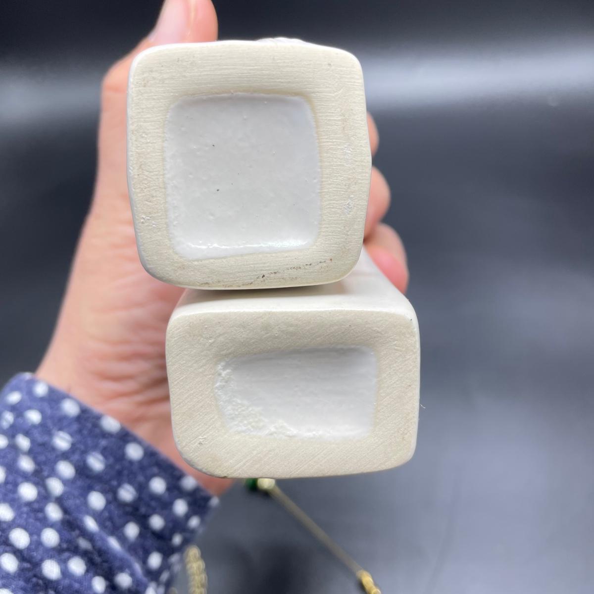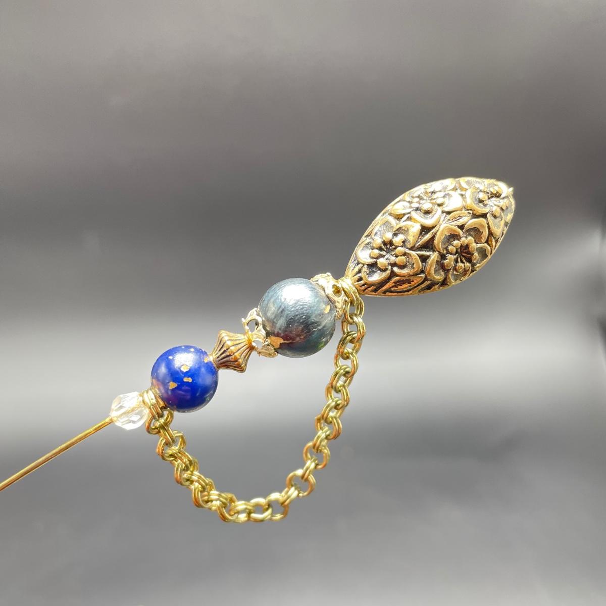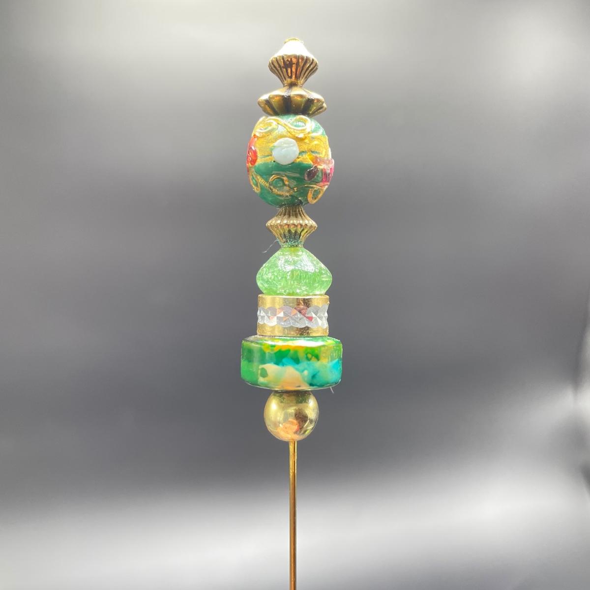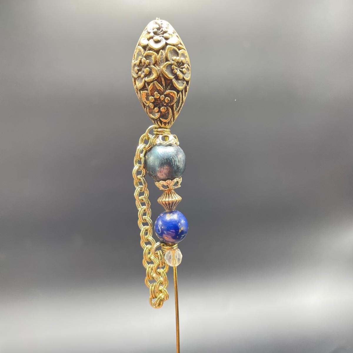 Four vintage hat pins with porcelain hat pin holders. Two hat pins have layered beads and appear to be a mix of materials including wood and plastic, very lightweight. The smaller two are metal one with tiny pearl colored beads inset in metal. The matching hat pin holders are just over 4” tall, one is square and the other rectangle. See images. Shipping available.