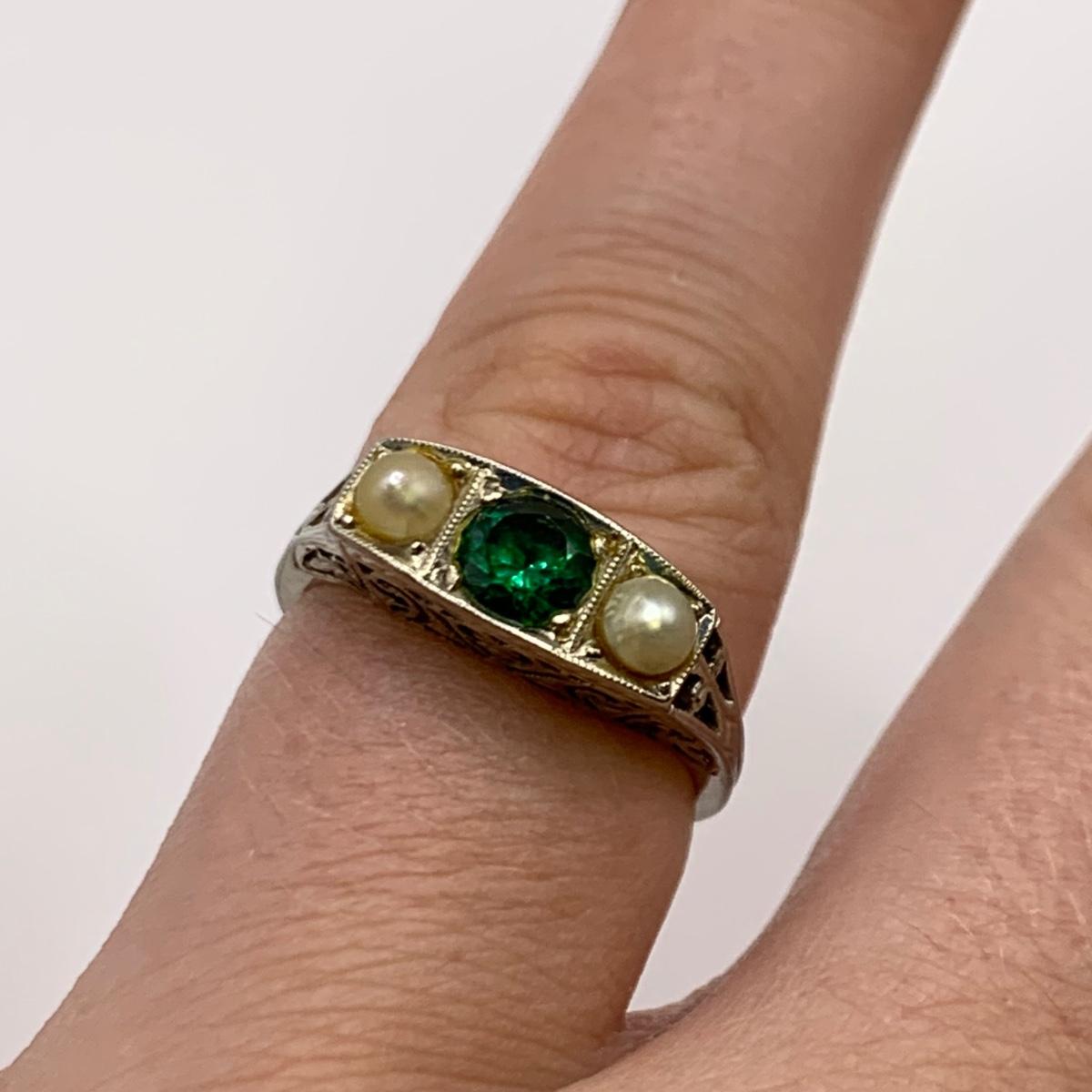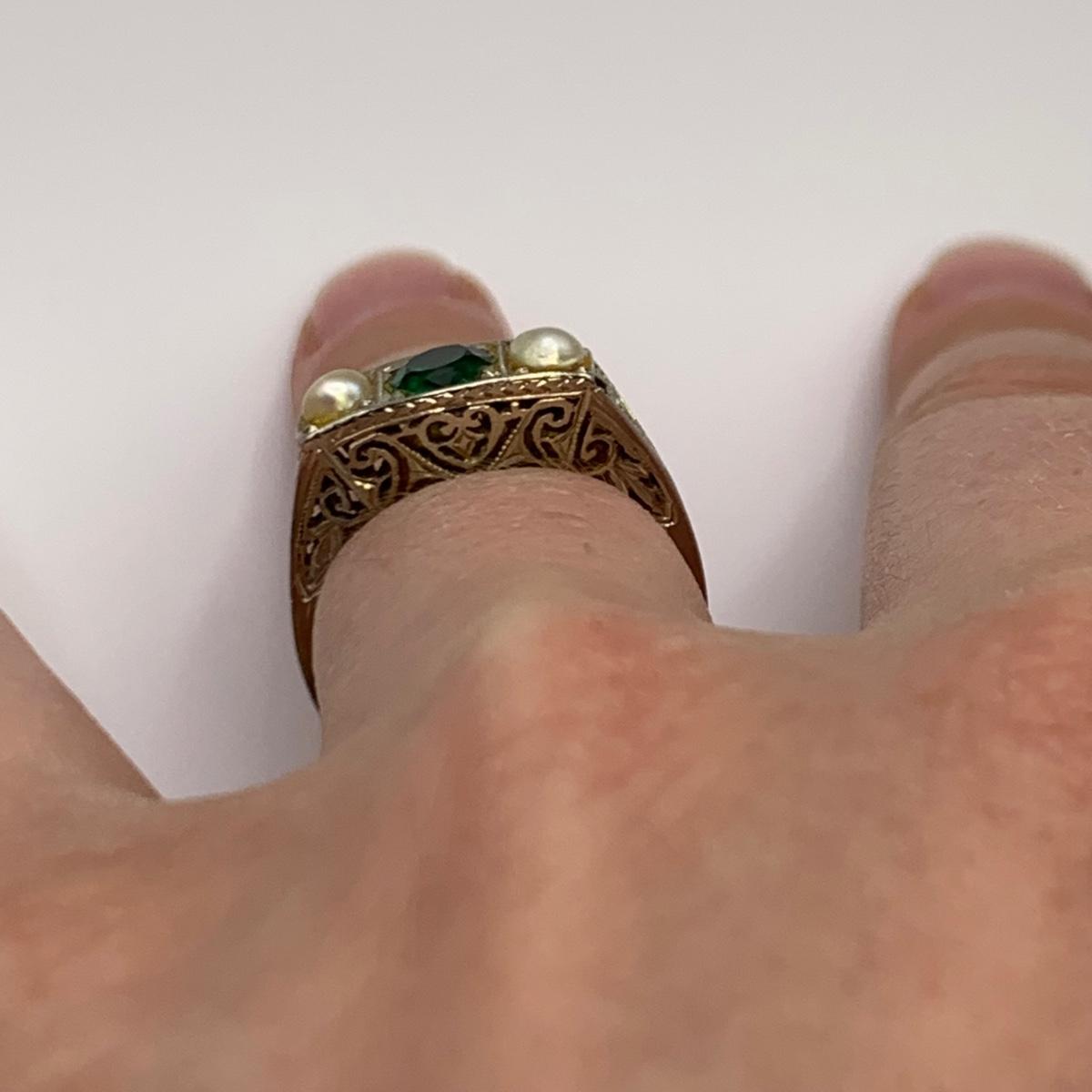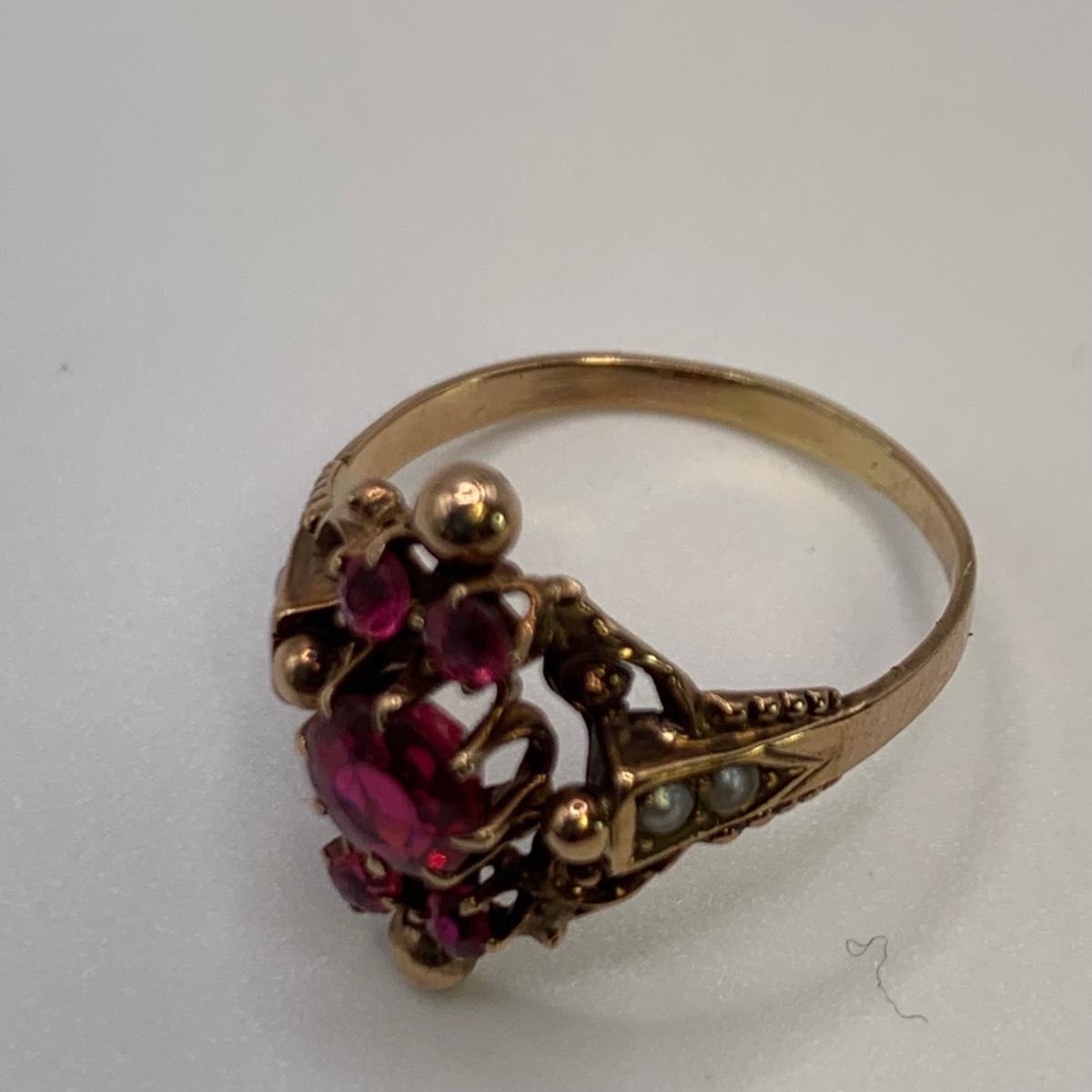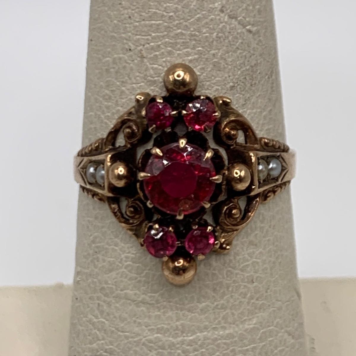 This lot features four unique vintage style rings and one brooch with pearl-like beads. One ring has a rose gold colored band with five ruby colored gemstones and four tint pearl-like gemstones set in the band. One ring has an ornate silver band and holds a green gemstone with two pearl-like stones on the side. One ring is quite small and has a sparkly rhinestone in the center. The final ring has a rose gold colored band with a garnet colored gemstone and one that looks like a frosted glass ball. It has an illegible mark inside the band. The brooch is about 1.5”D and is marked “˜Winard 12K GF’. It has a small green oxidation spot. All sales are final. No returns or refunds. Please bid accordingly.