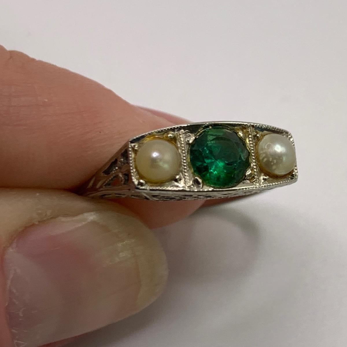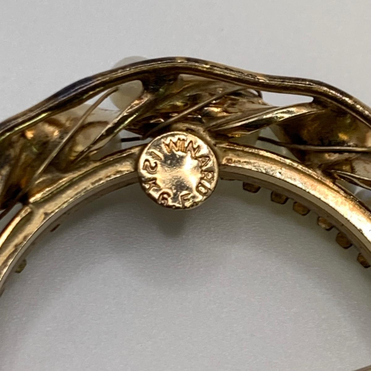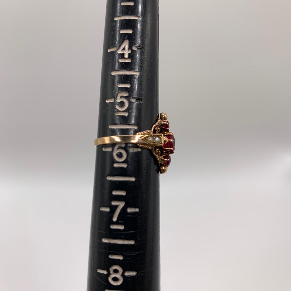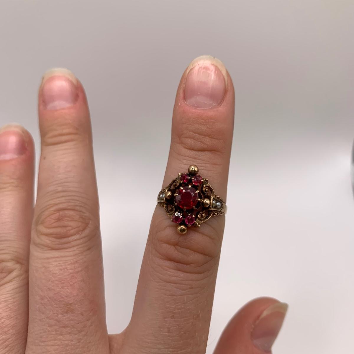 This lot features four unique vintage style rings and one brooch with pearl-like beads. One ring has a rose gold colored band with five ruby colored gemstones and four tint pearl-like gemstones set in the band. One ring has an ornate silver band and holds a green gemstone with two pearl-like stones on the side. One ring is quite small and has a sparkly rhinestone in the center. The final ring has a rose gold colored band with a garnet colored gemstone and one that looks like a frosted glass ball. It has an illegible mark inside the band. The brooch is about 1.5”D and is marked “˜Winard 12K GF’. It has a small green oxidation spot. All sales are final. No returns or refunds. Please bid accordingly.