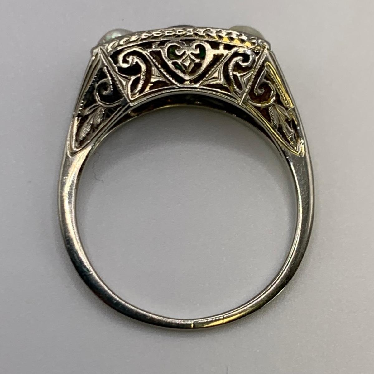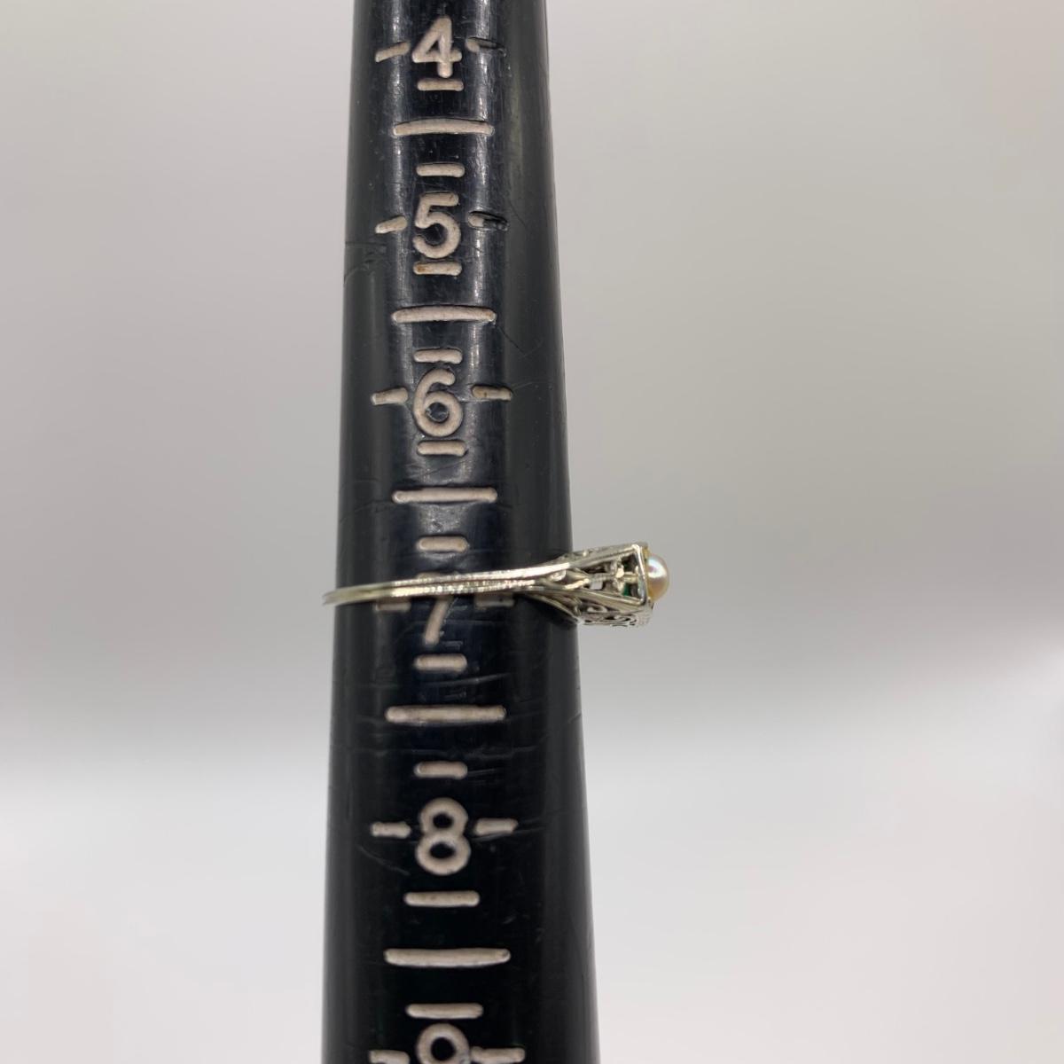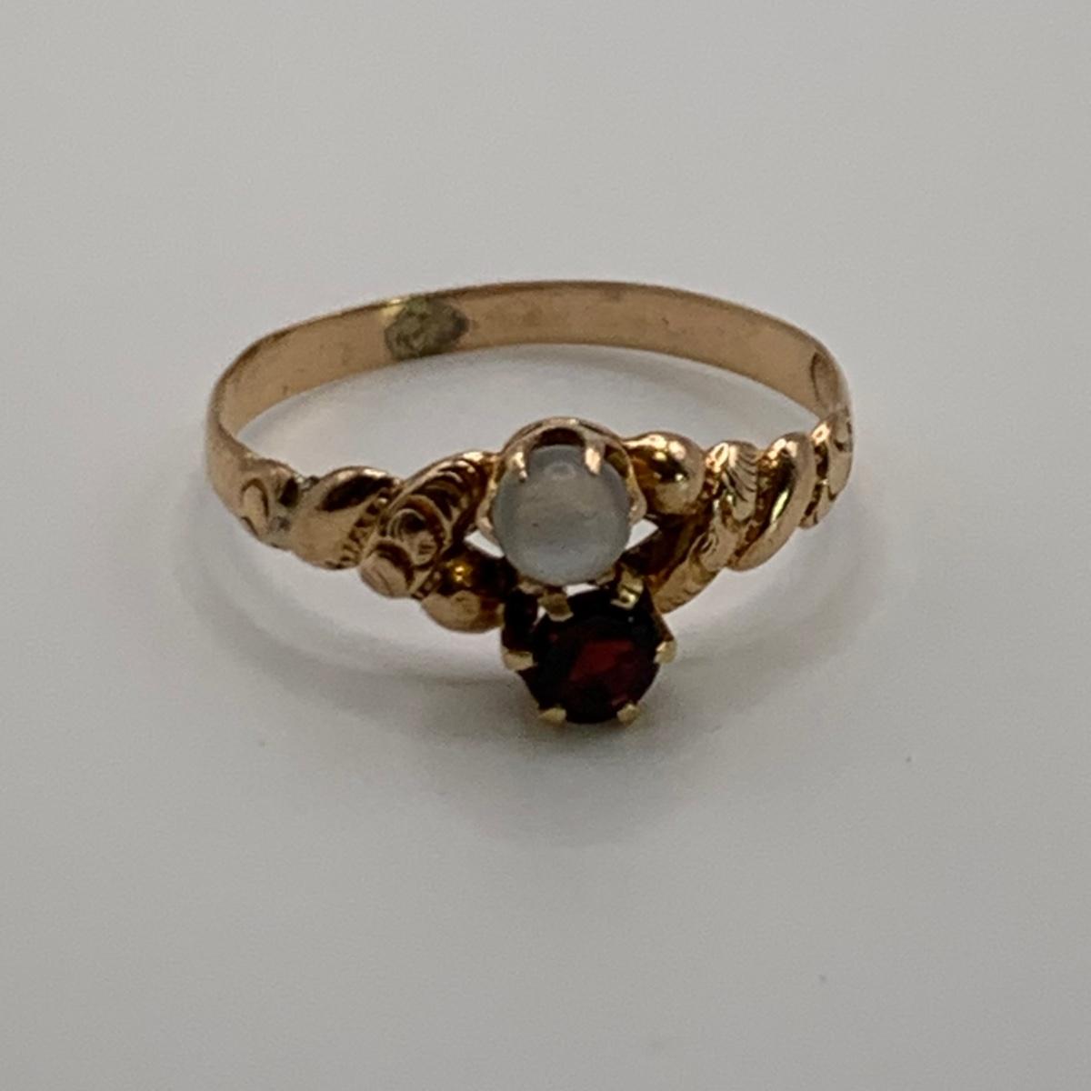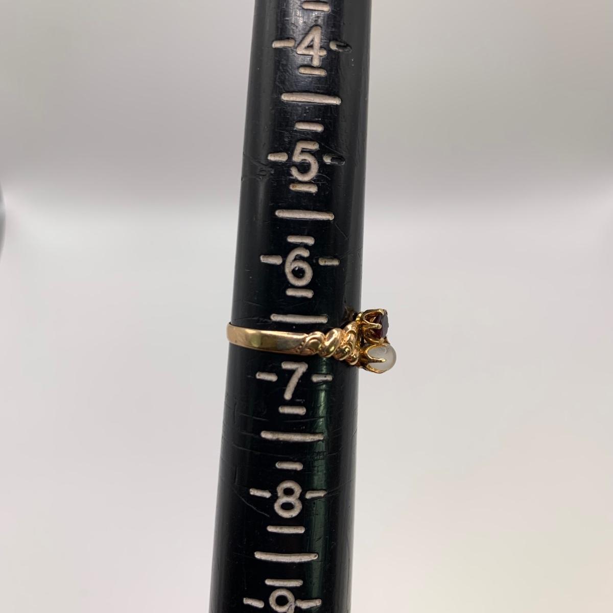 This lot features four unique vintage style rings and one brooch with pearl-like beads. One ring has a rose gold colored band with five ruby colored gemstones and four tint pearl-like gemstones set in the band. One ring has an ornate silver band and holds a green gemstone with two pearl-like stones on the side. One ring is quite small and has a sparkly rhinestone in the center. The final ring has a rose gold colored band with a garnet colored gemstone and one that looks like a frosted glass ball. It has an illegible mark inside the band. The brooch is about 1.5”D and is marked “˜Winard 12K GF’. It has a small green oxidation spot. All sales are final. No returns or refunds. Please bid accordingly.