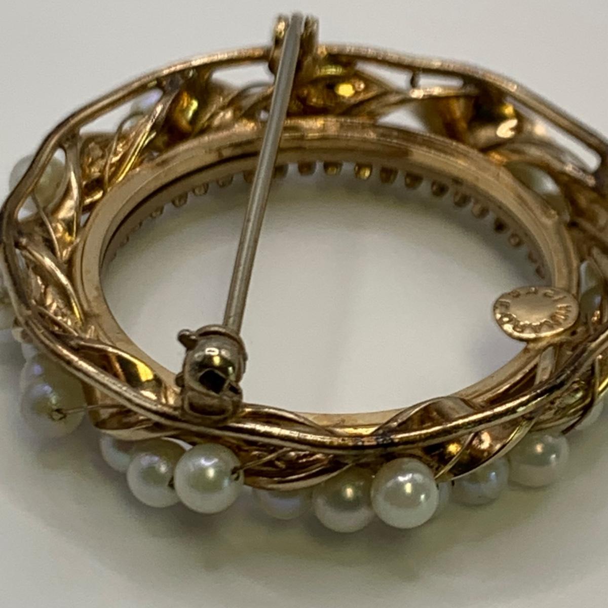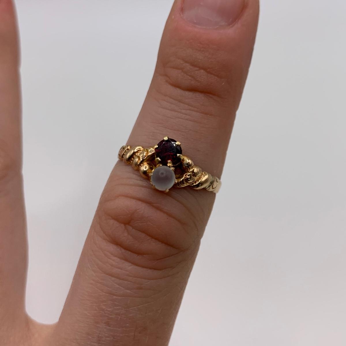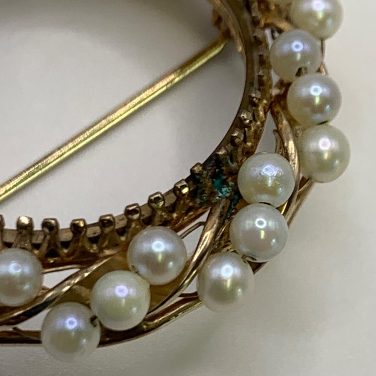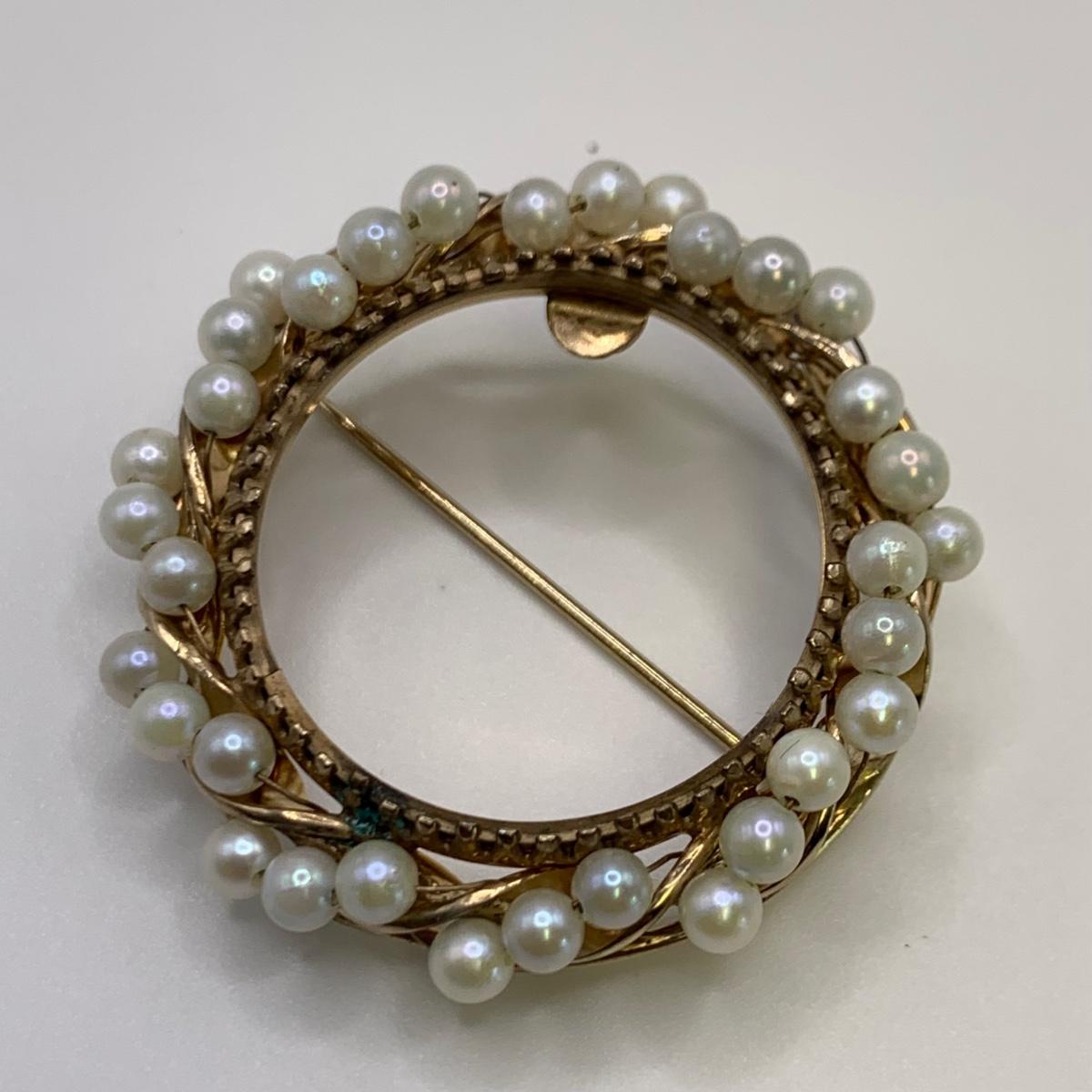 This lot features four unique vintage style rings and one brooch with pearl-like beads. One ring has a rose gold colored band with five ruby colored gemstones and four tint pearl-like gemstones set in the band. One ring has an ornate silver band and holds a green gemstone with two pearl-like stones on the side. One ring is quite small and has a sparkly rhinestone in the center. The final ring has a rose gold colored band with a garnet colored gemstone and one that looks like a frosted glass ball. It has an illegible mark inside the band. The brooch is about 1.5”D and is marked “˜Winard 12K GF’. It has a small green oxidation spot. All sales are final. No returns or refunds. Please bid accordingly.
