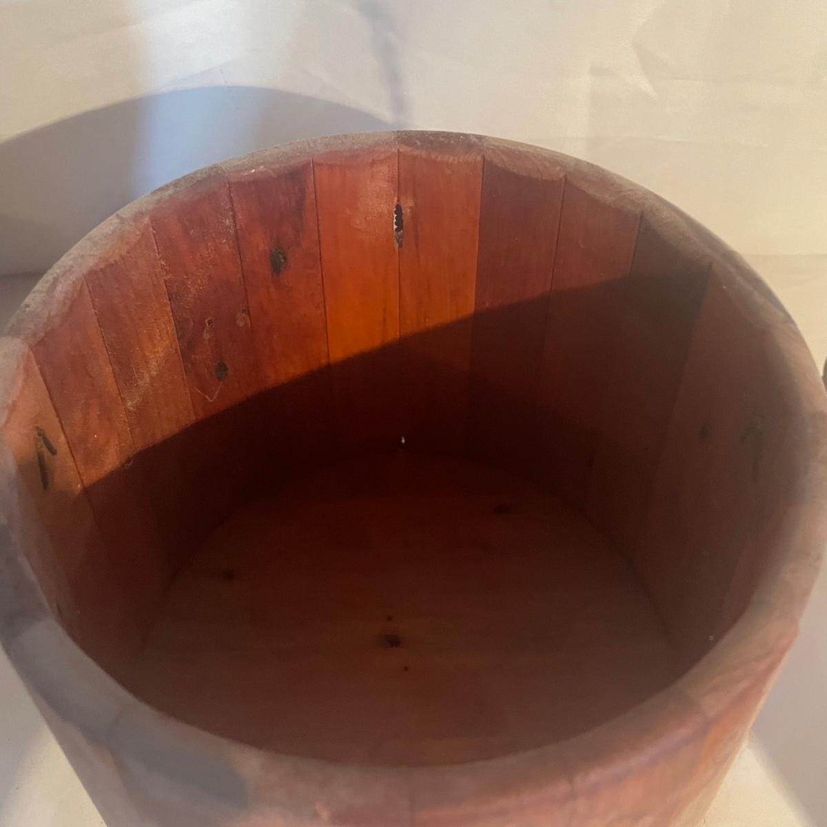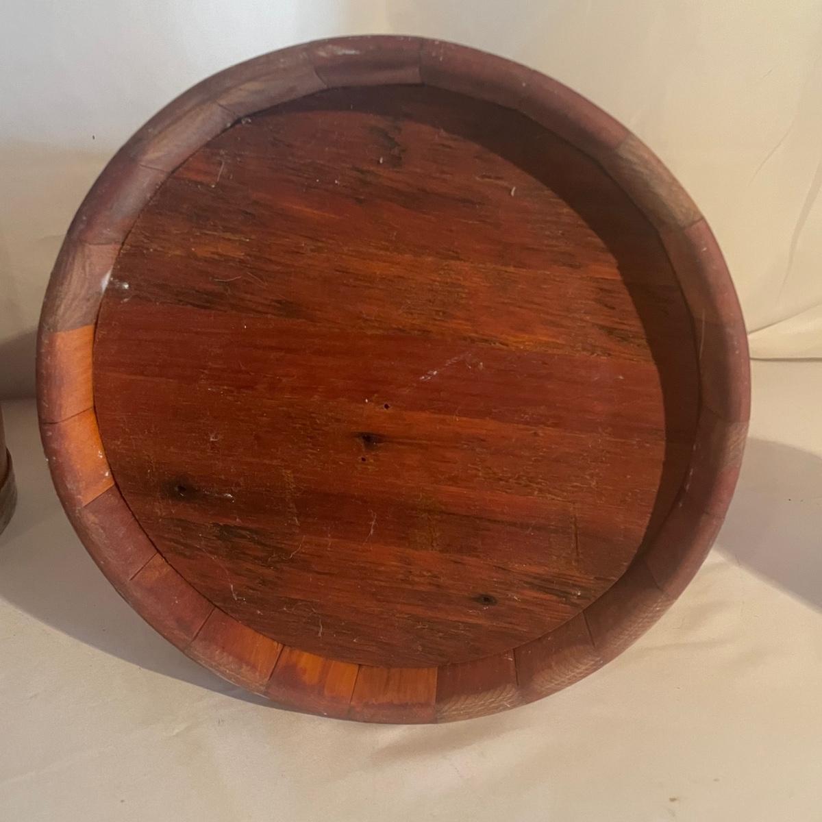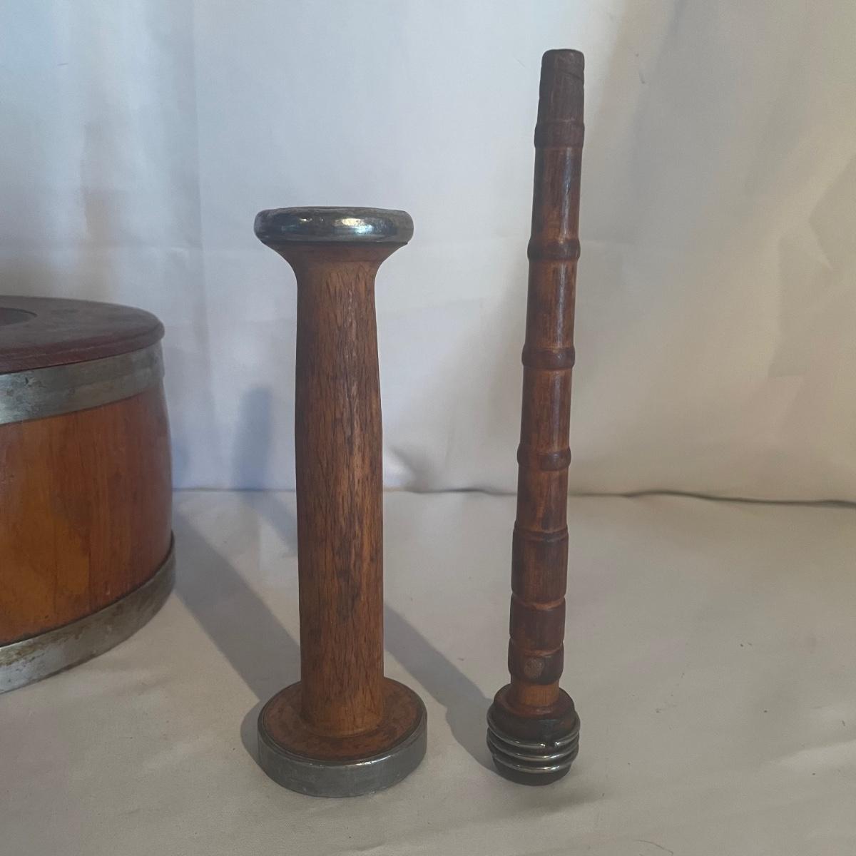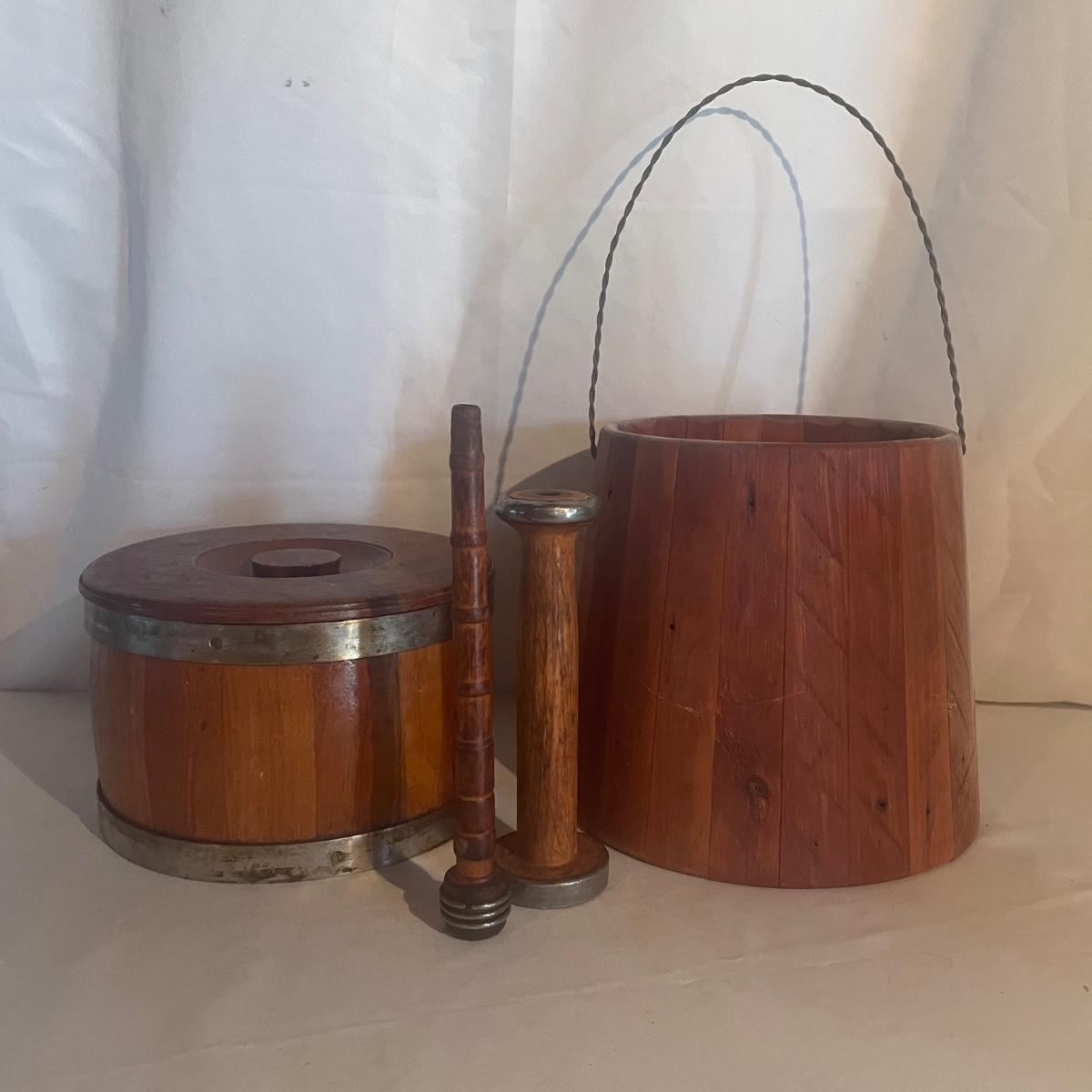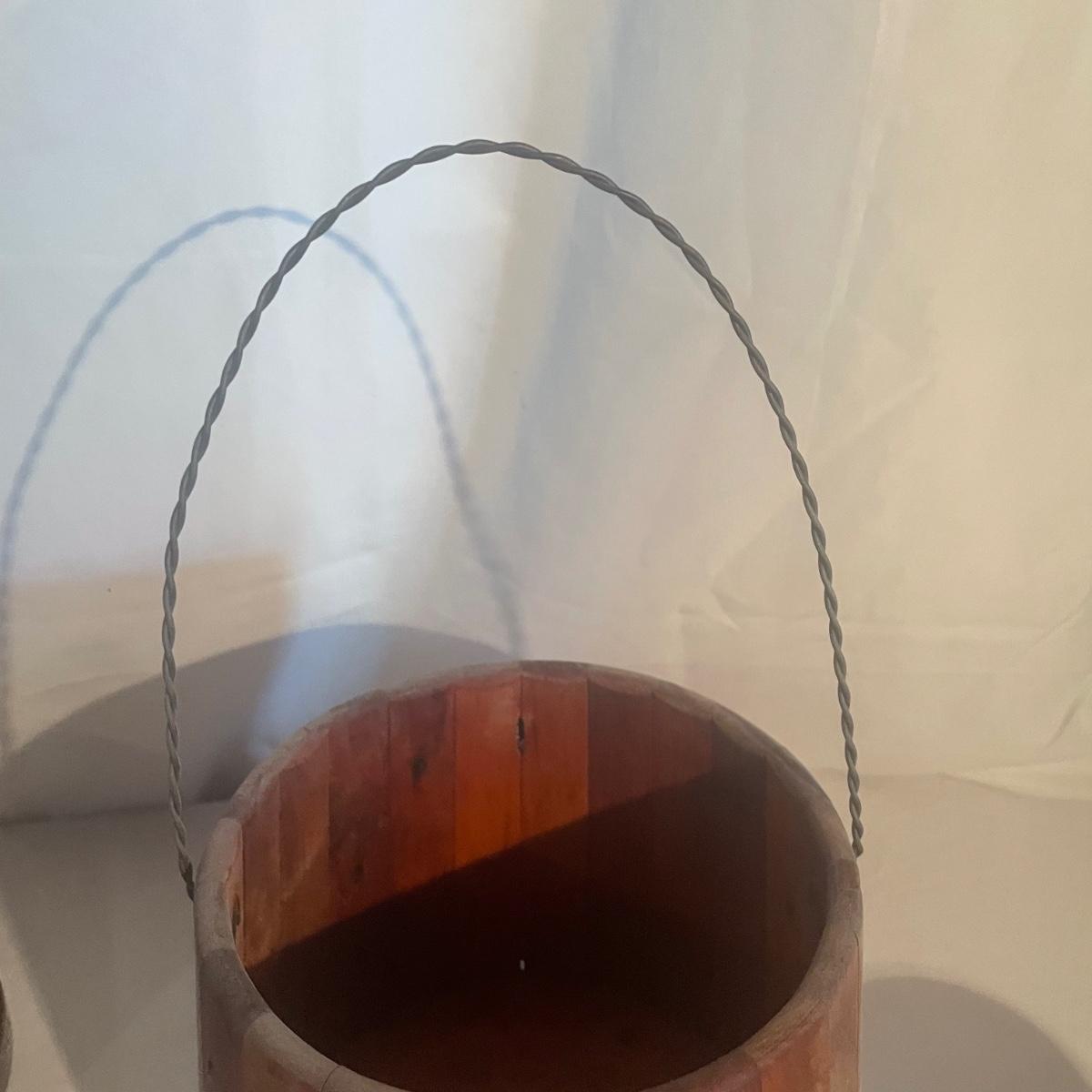 This lidded wooden box measures 8” d x 5” tall. The taller bucket is made of wood and has two strands of twisted wire for a handle. Lastly there are two wood and metal spools.