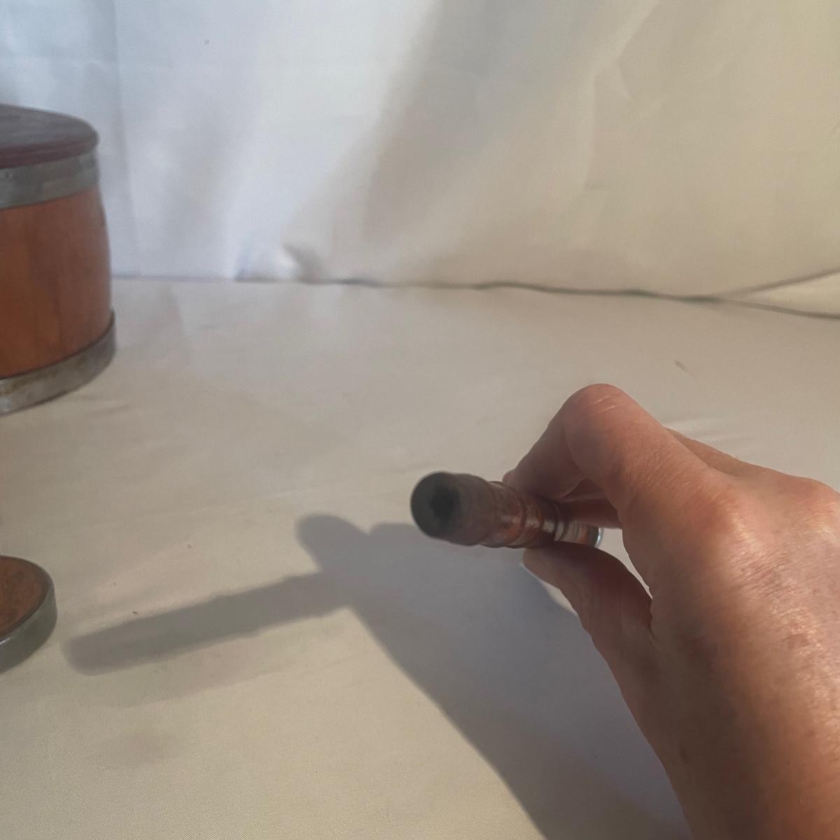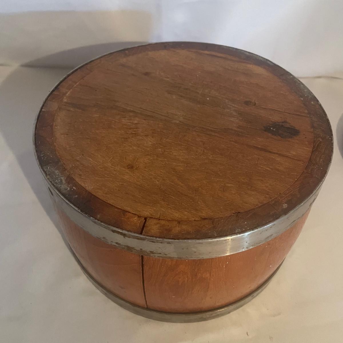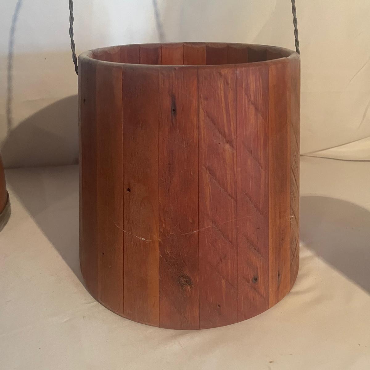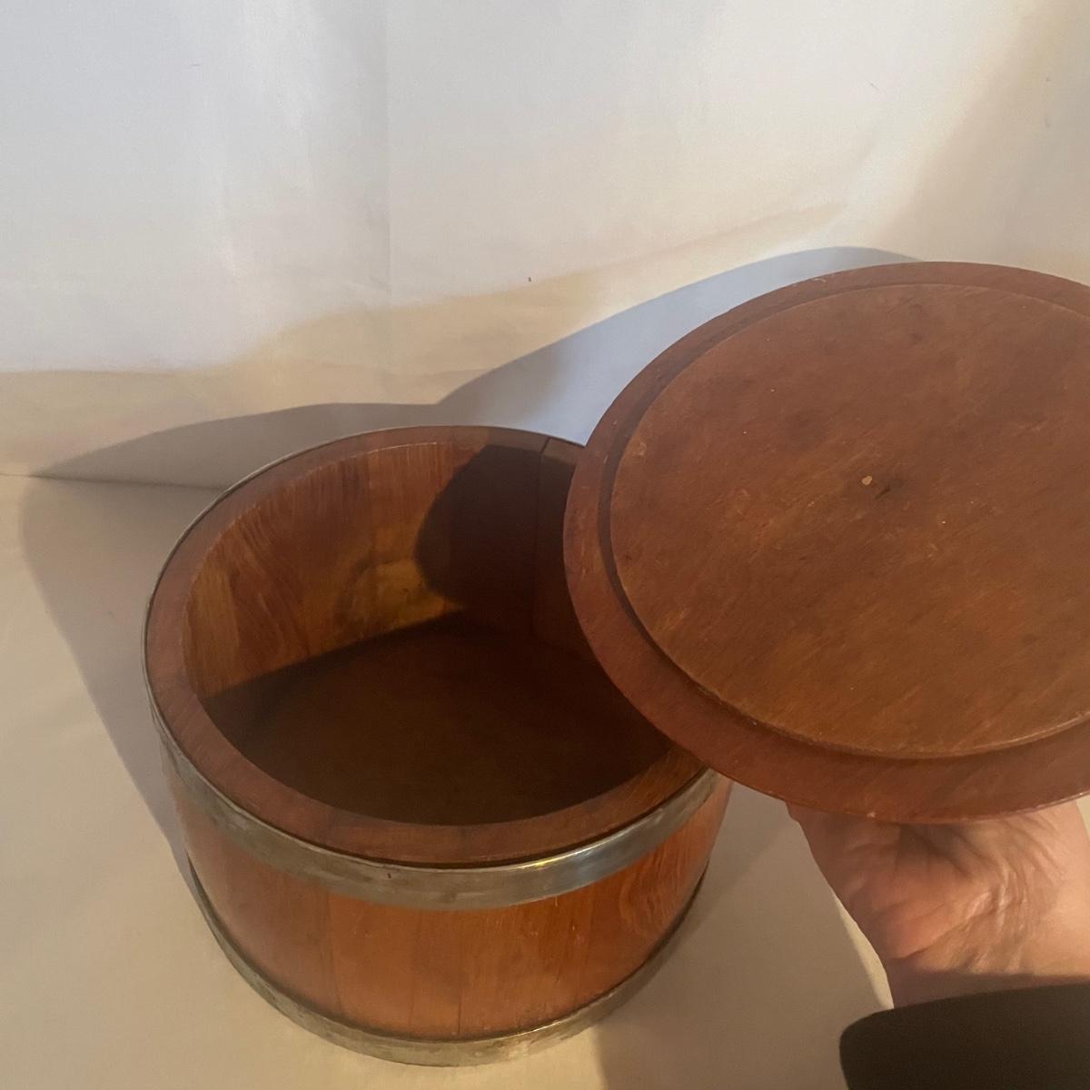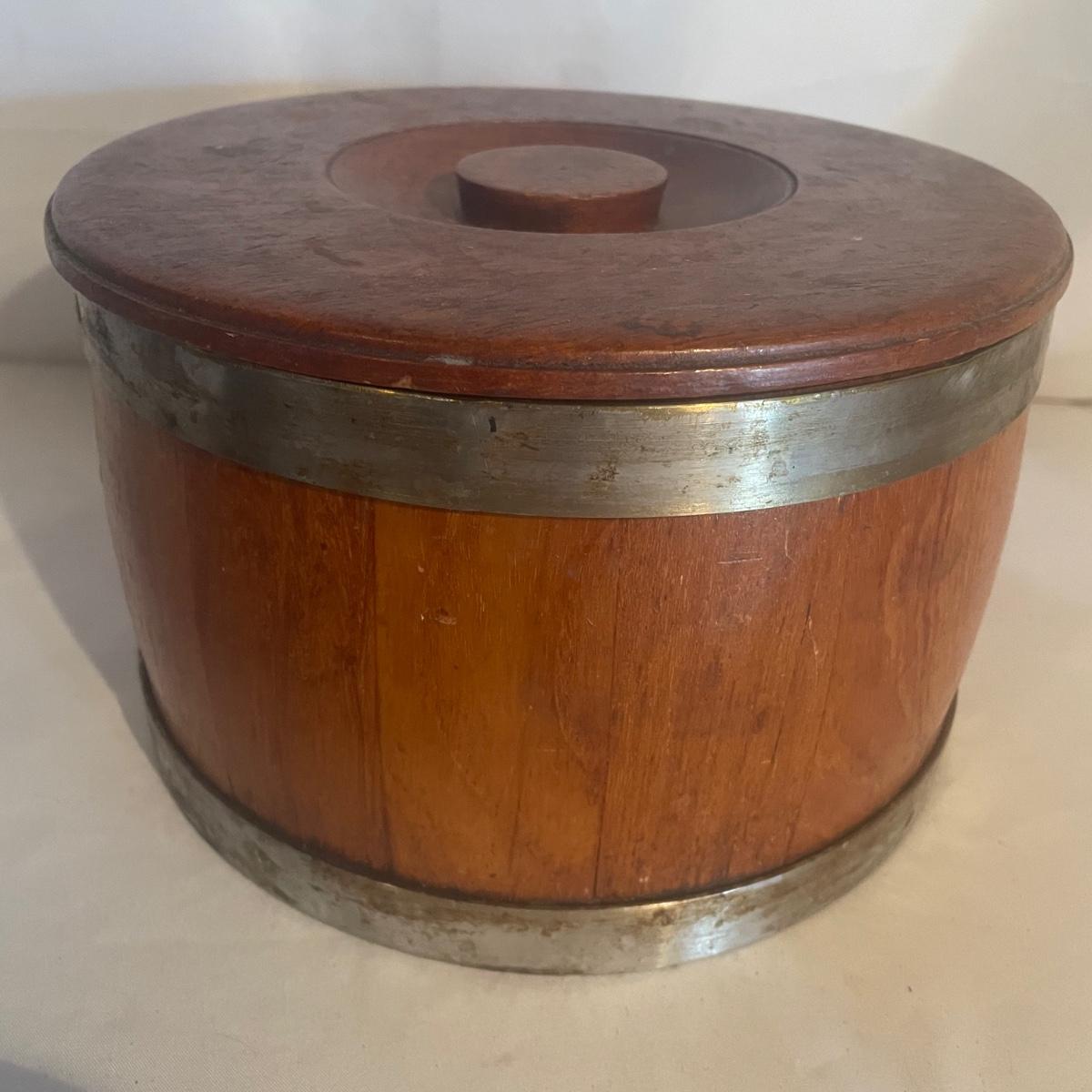 This lidded wooden box measures 8” d x 5” tall. The taller bucket is made of wood and has two strands of twisted wire for a handle. Lastly there are two wood and metal spools.