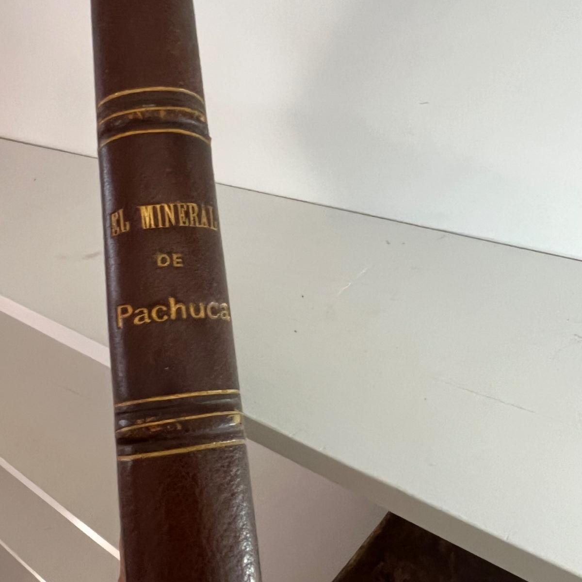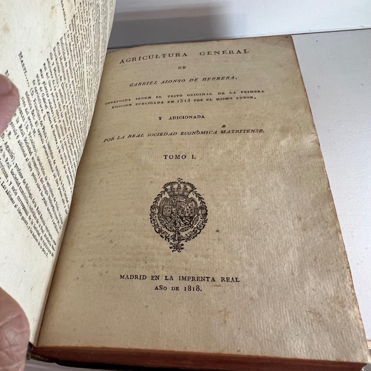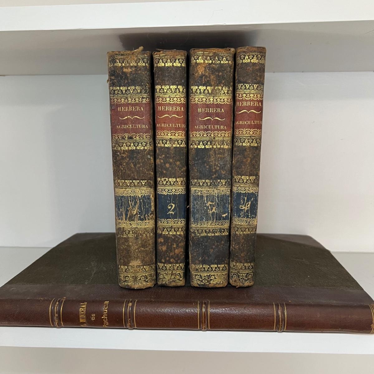 Five antique books includes a four book set titled Agricultura General by Gabriel Alonso de Herrera that are dated 1818. A large leather bound book 'El Mineral de Pachuca' from Mexico is dated 1897. All are in reasonable but delicate condition which is to be expected due to their age.