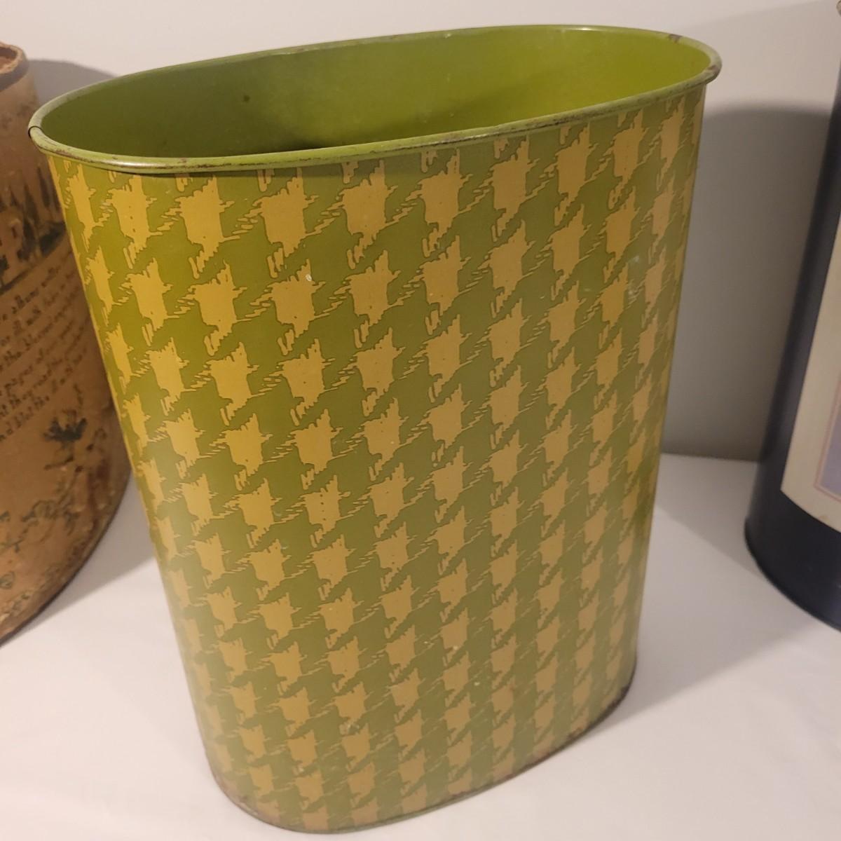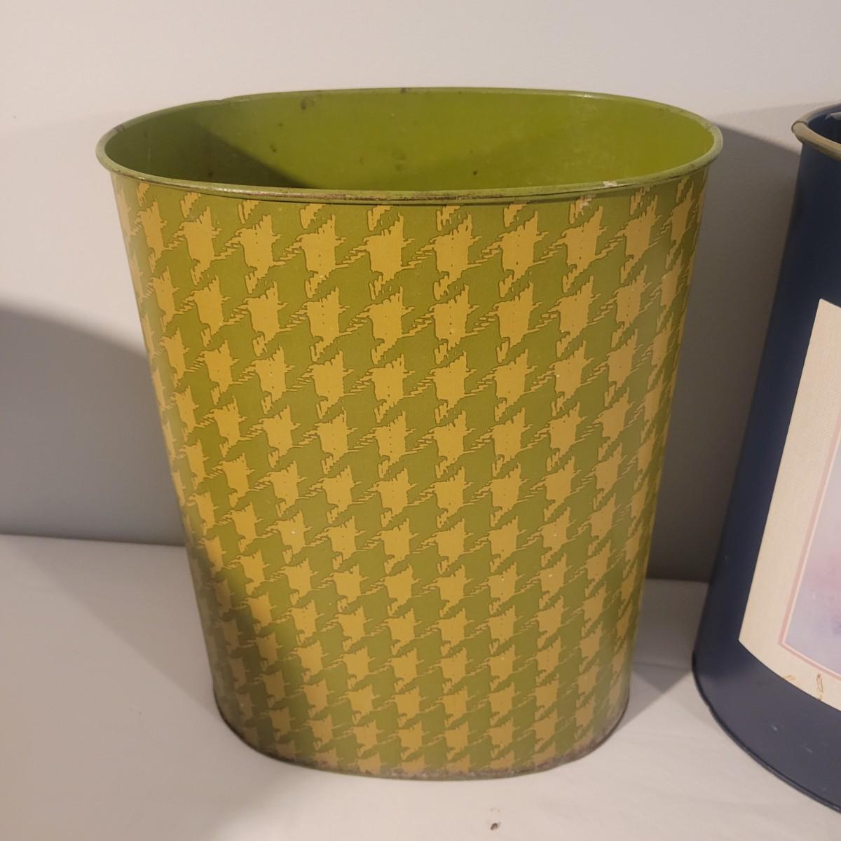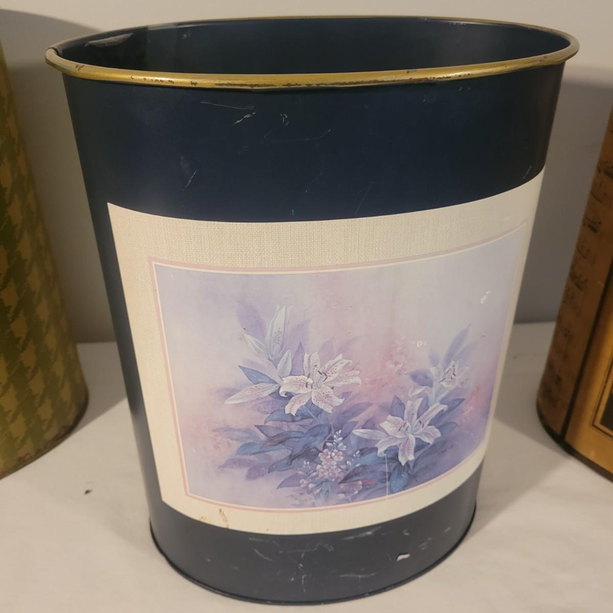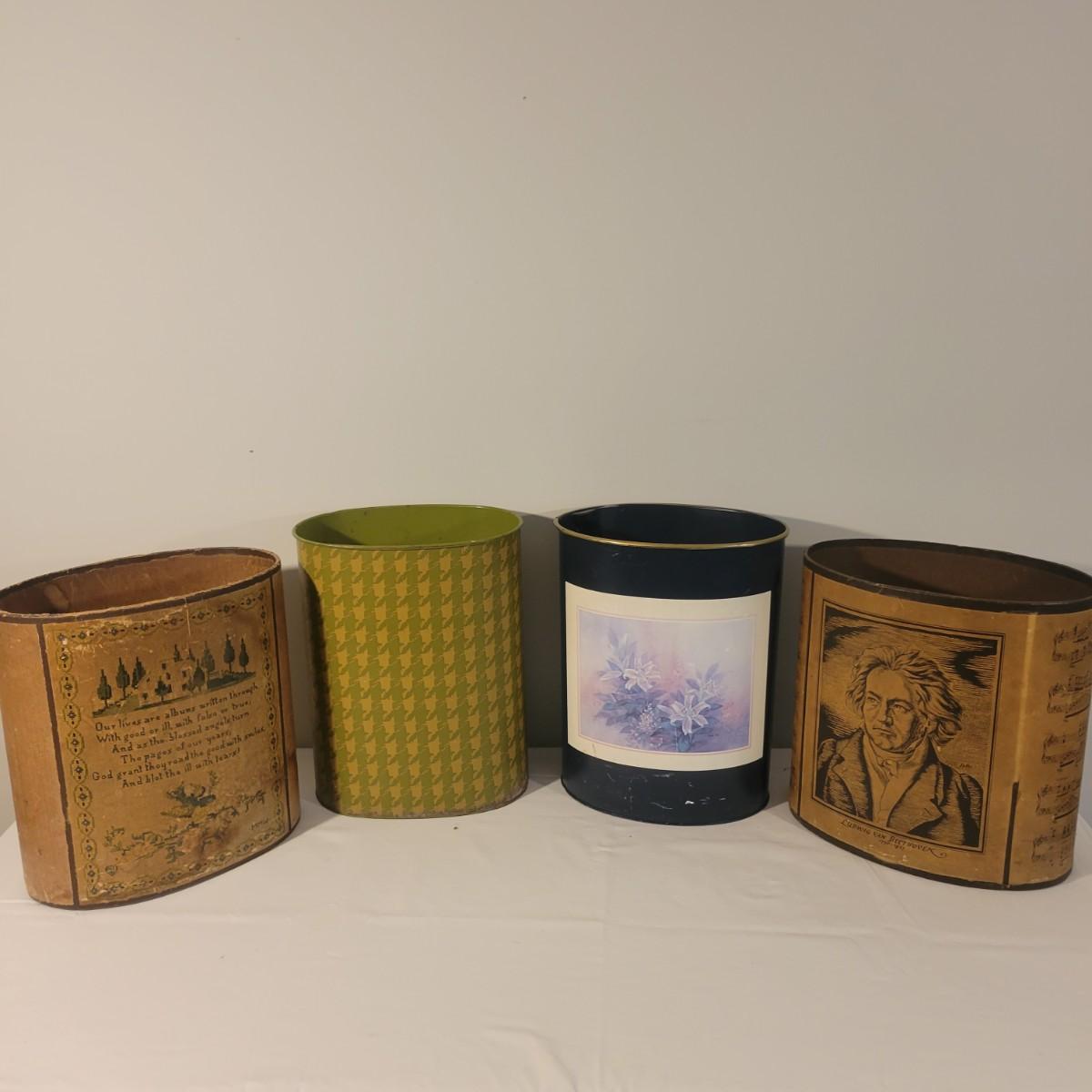 Four vintage waste bins that have seen varying amounts of use, but are still functional. The Beethoven and needlepoint bins are made of a heavy paper and the other two are made of metal. The metal bins do have some scratches and the floral one has a small dent. The average size is approximately 12" x 7" x 12". Local pickup only