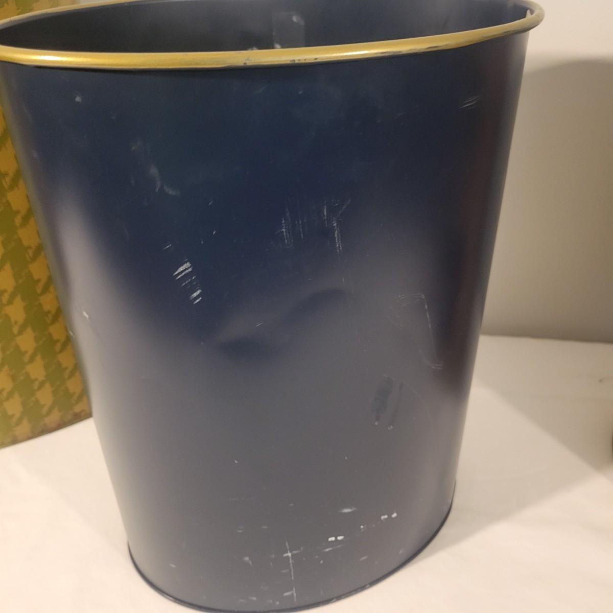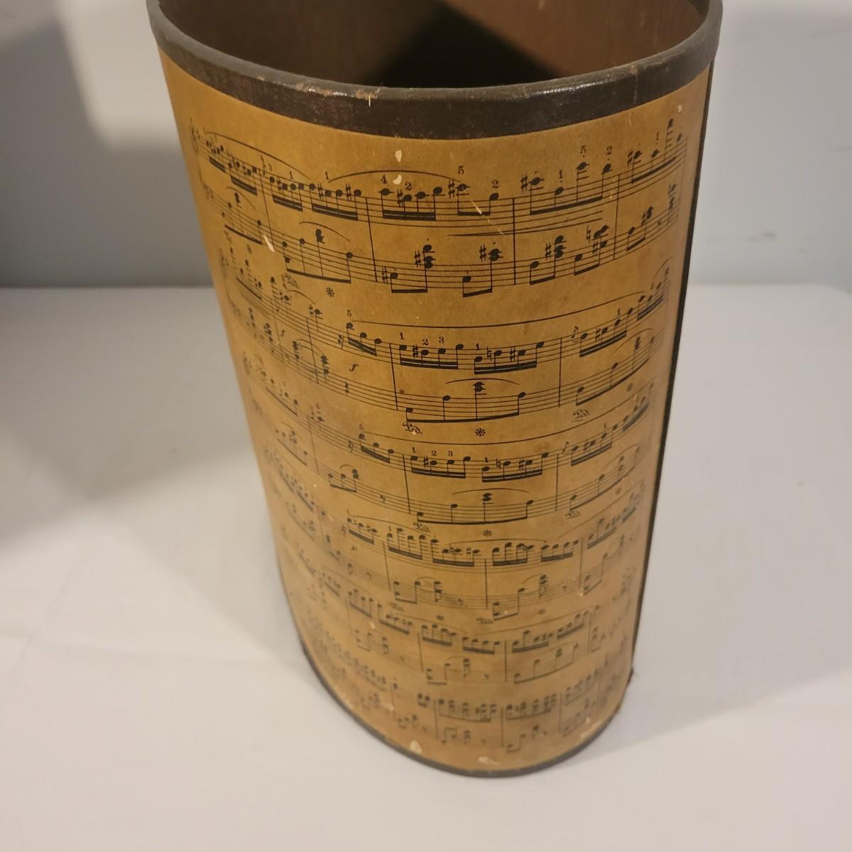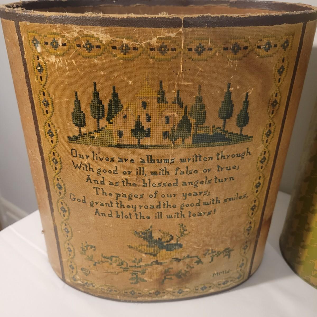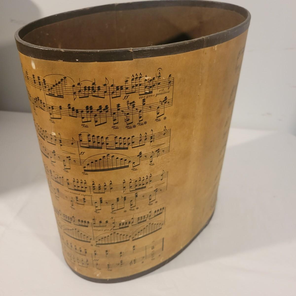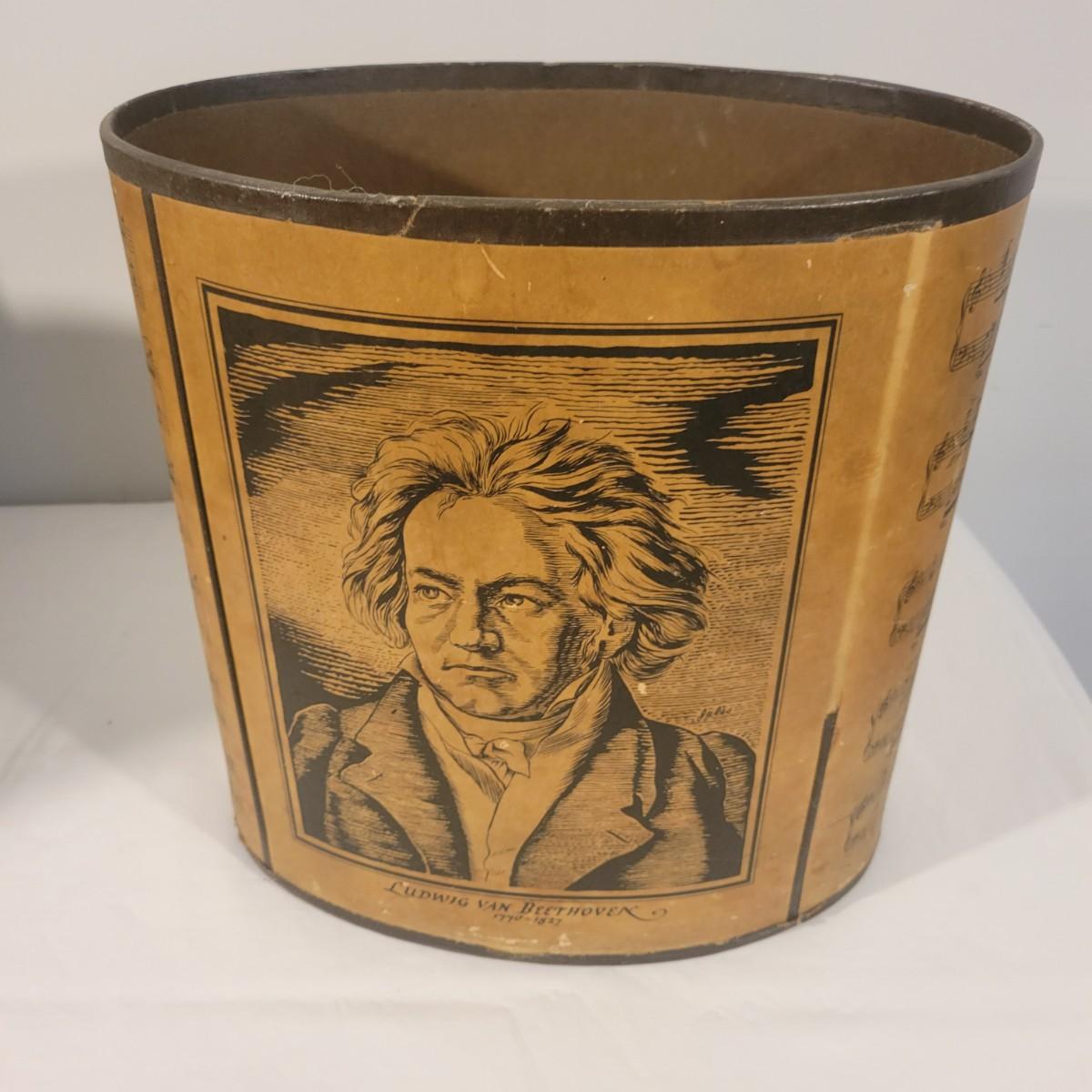 Four vintage waste bins that have seen varying amounts of use, but are still functional. The Beethoven and needlepoint bins are made of a heavy paper and the other two are made of metal. The metal bins do have some scratches and the floral one has a small dent. The average size is approximately 12" x 7" x 12". Local pickup only