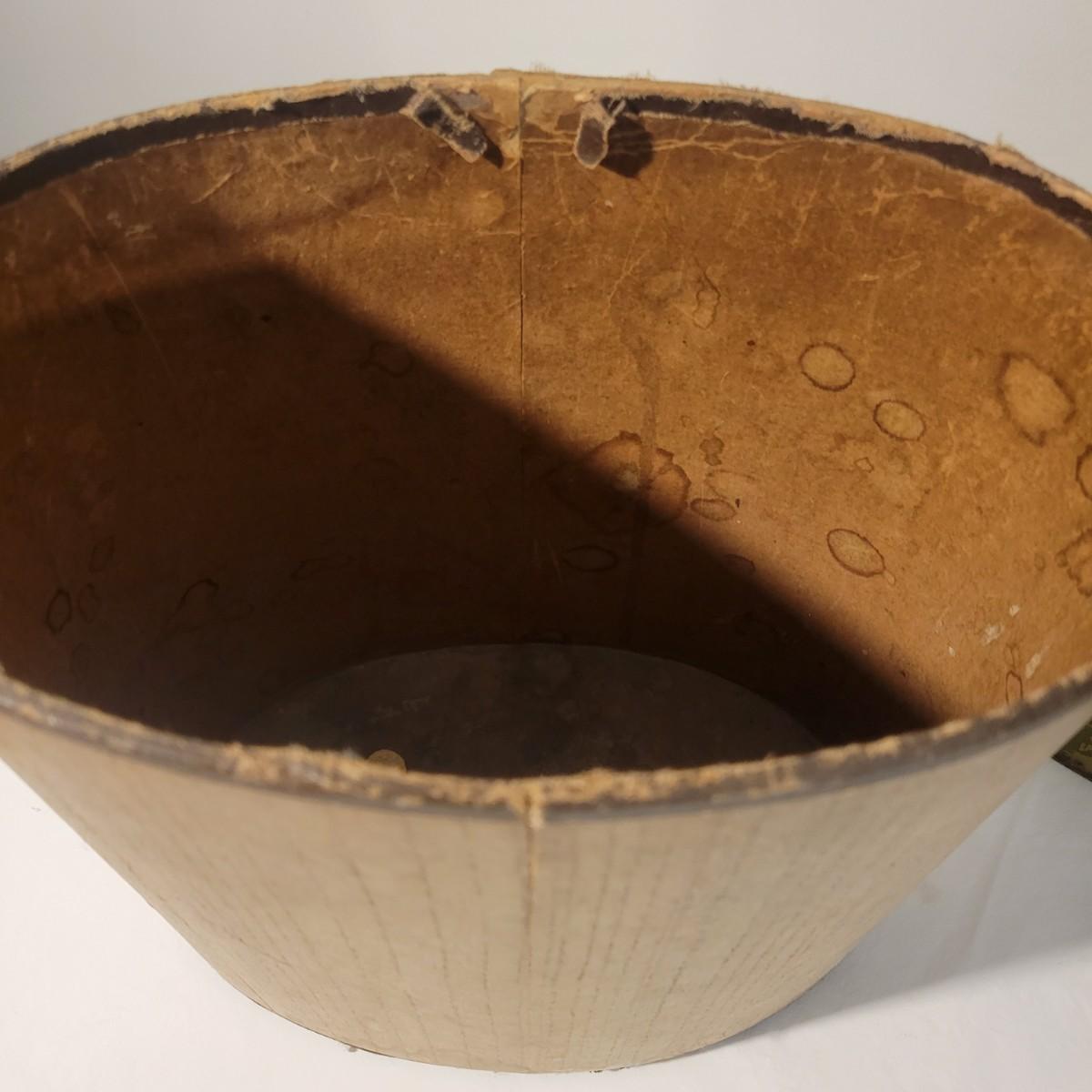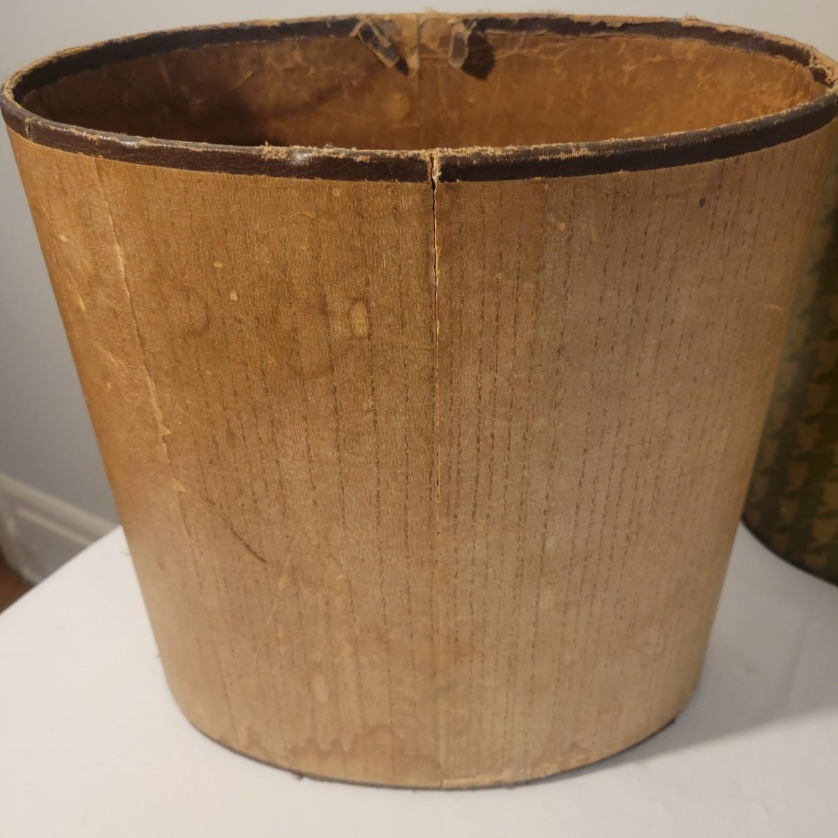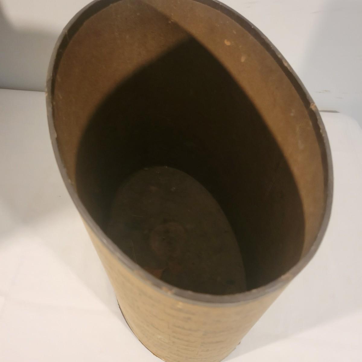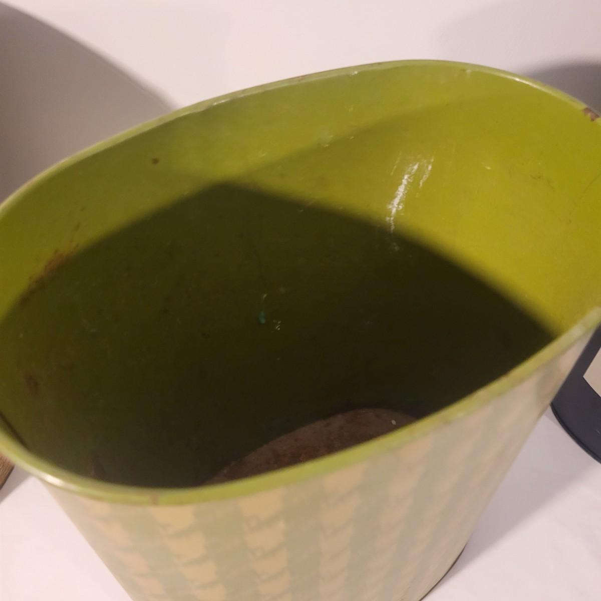 Four vintage waste bins that have seen varying amounts of use, but are still functional. The Beethoven and needlepoint bins are made of a heavy paper and the other two are made of metal. The metal bins do have some scratches and the floral one has a small dent. The average size is approximately 12" x 7" x 12". Local pickup only