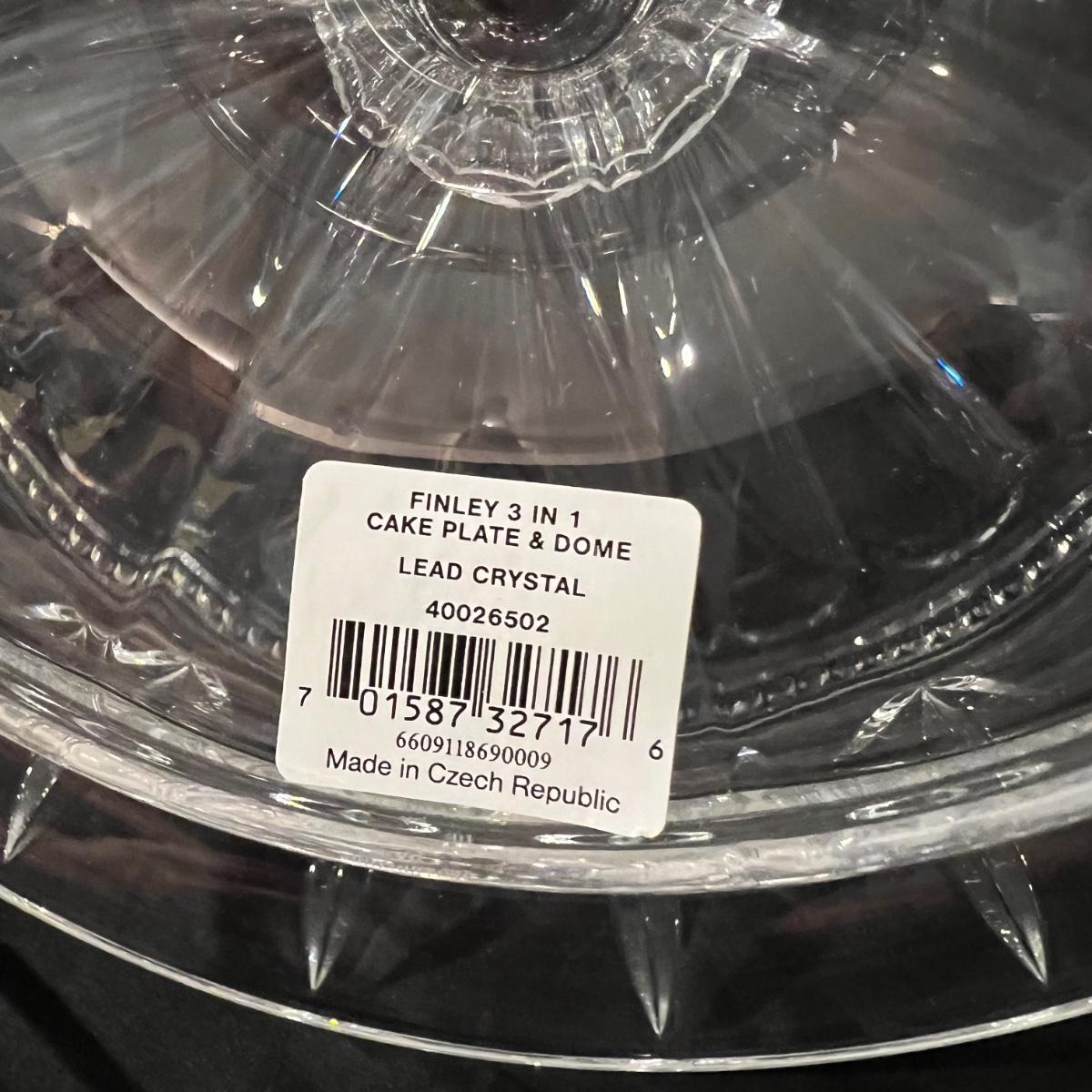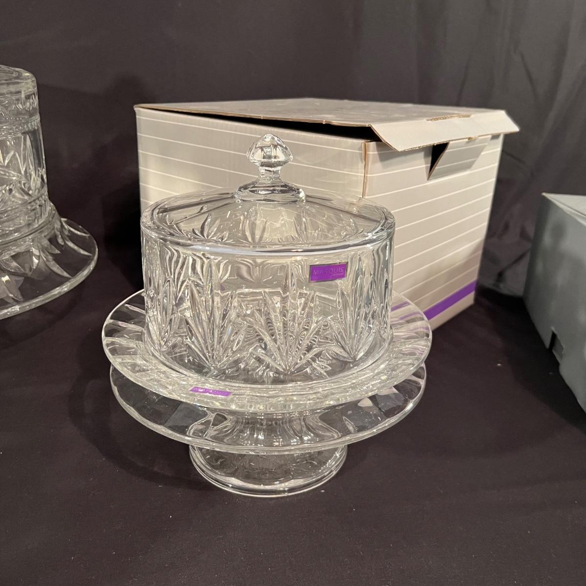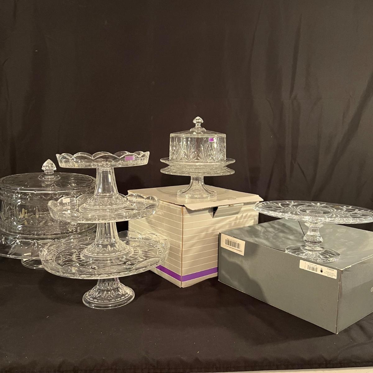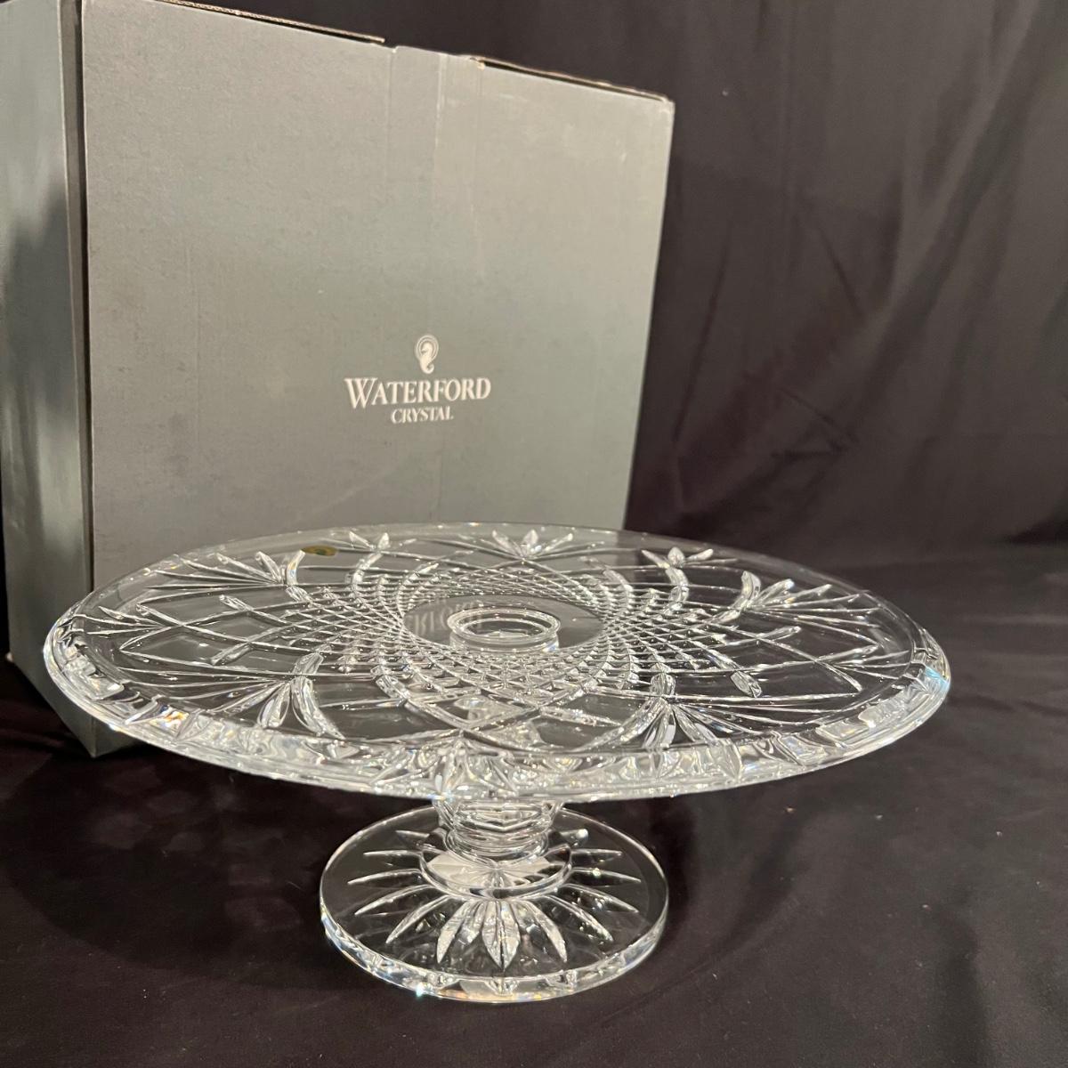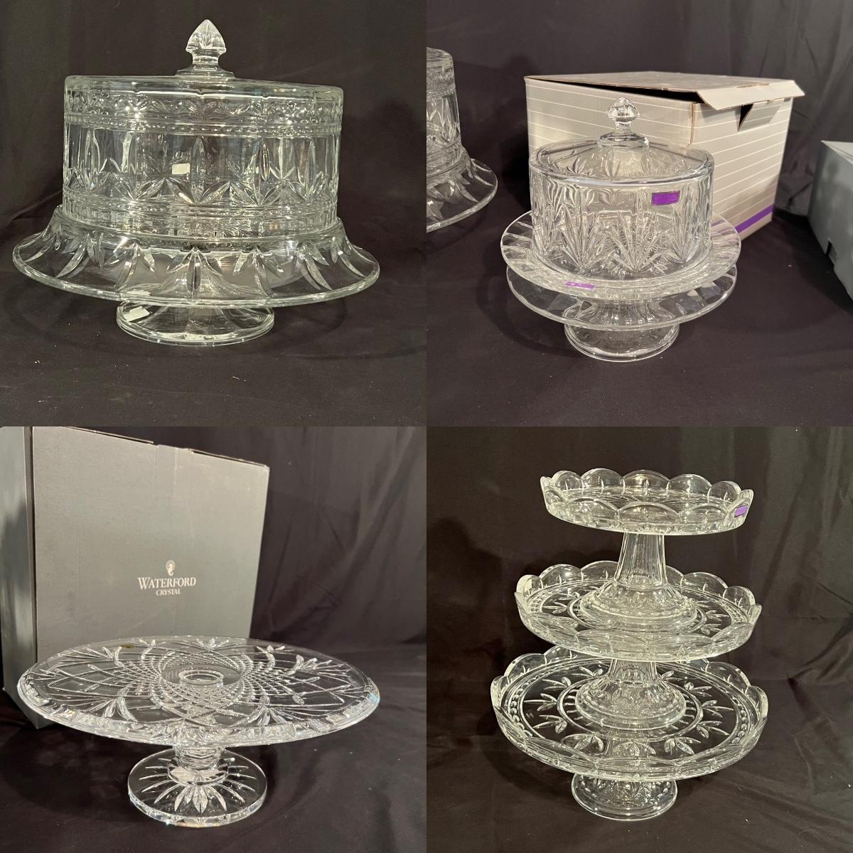 All four of these Waterford cake stands appear to be new in box. See images for full inventory. Largest cake stand measures 17”D x 14”H (this is to the top of the dome).