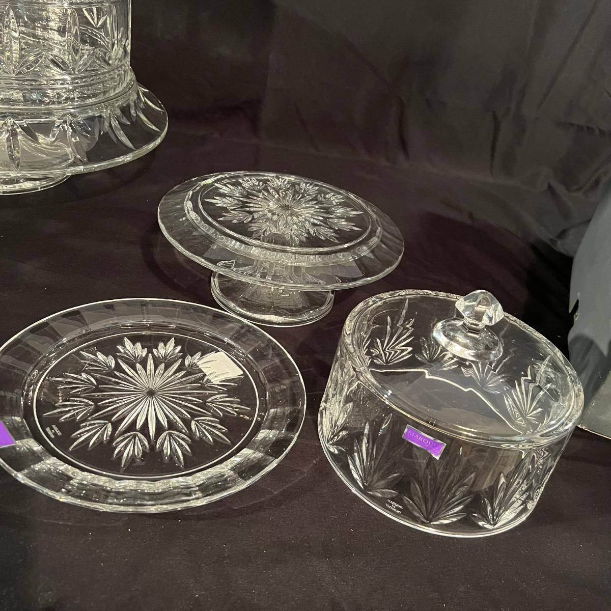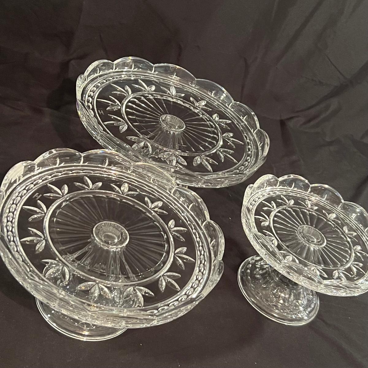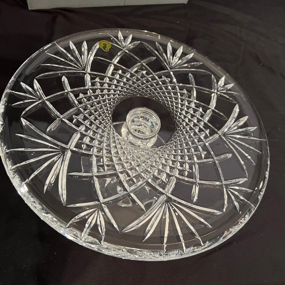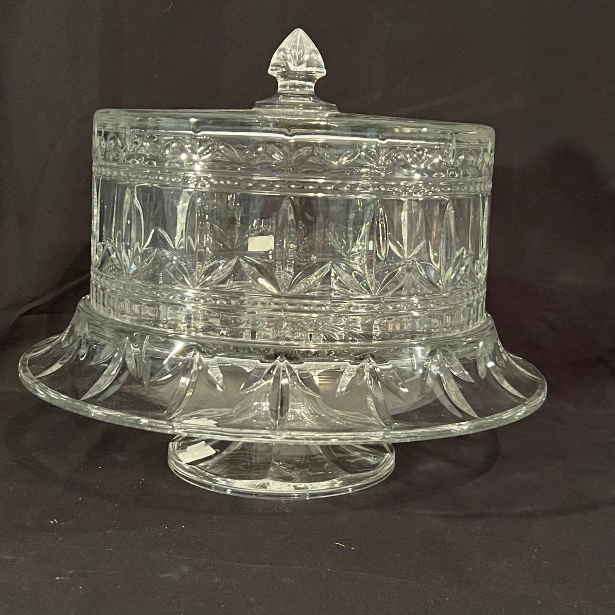 All four of these Waterford cake stands appear to be new in box. See images for full inventory. Largest cake stand measures 17”D x 14”H (this is to the top of the dome).