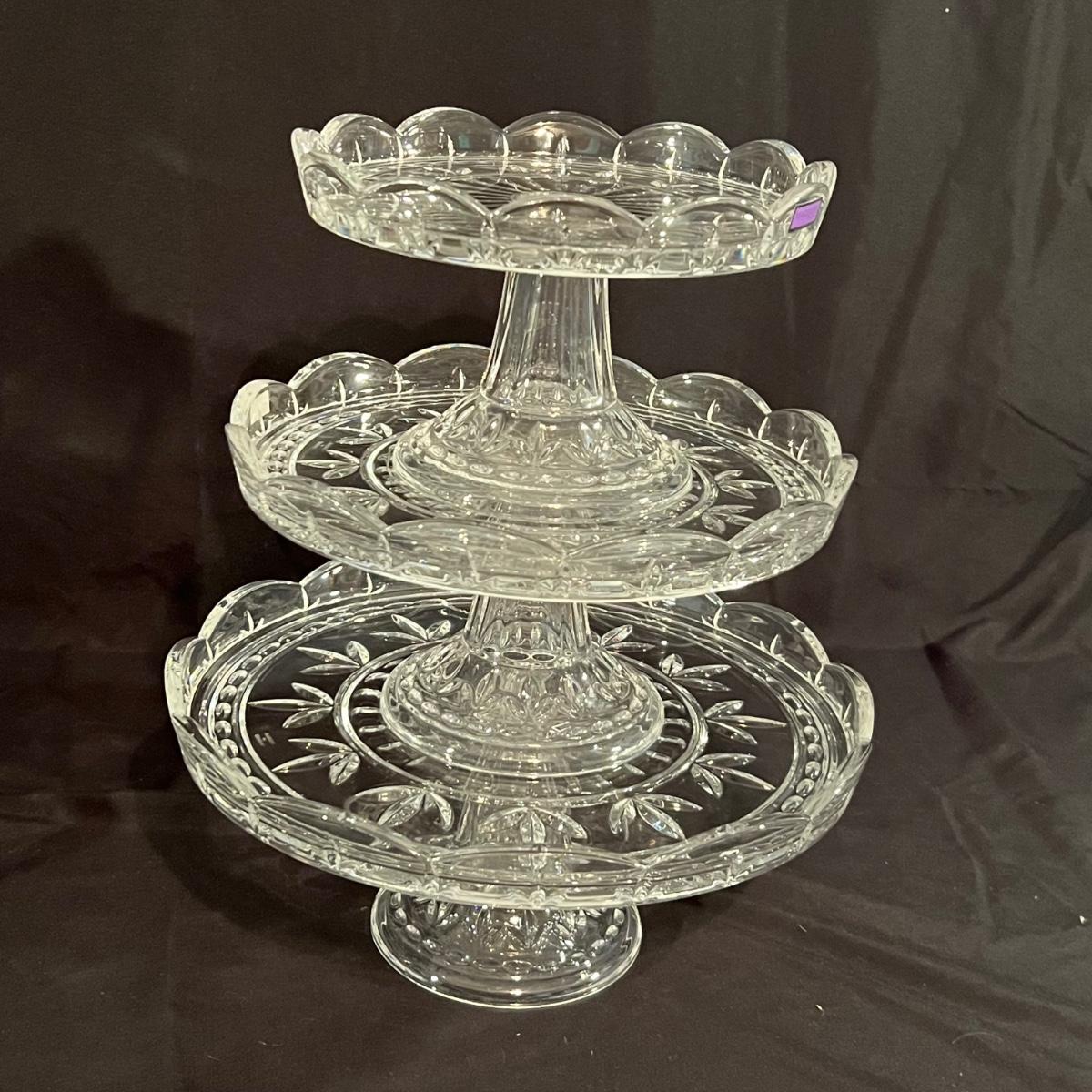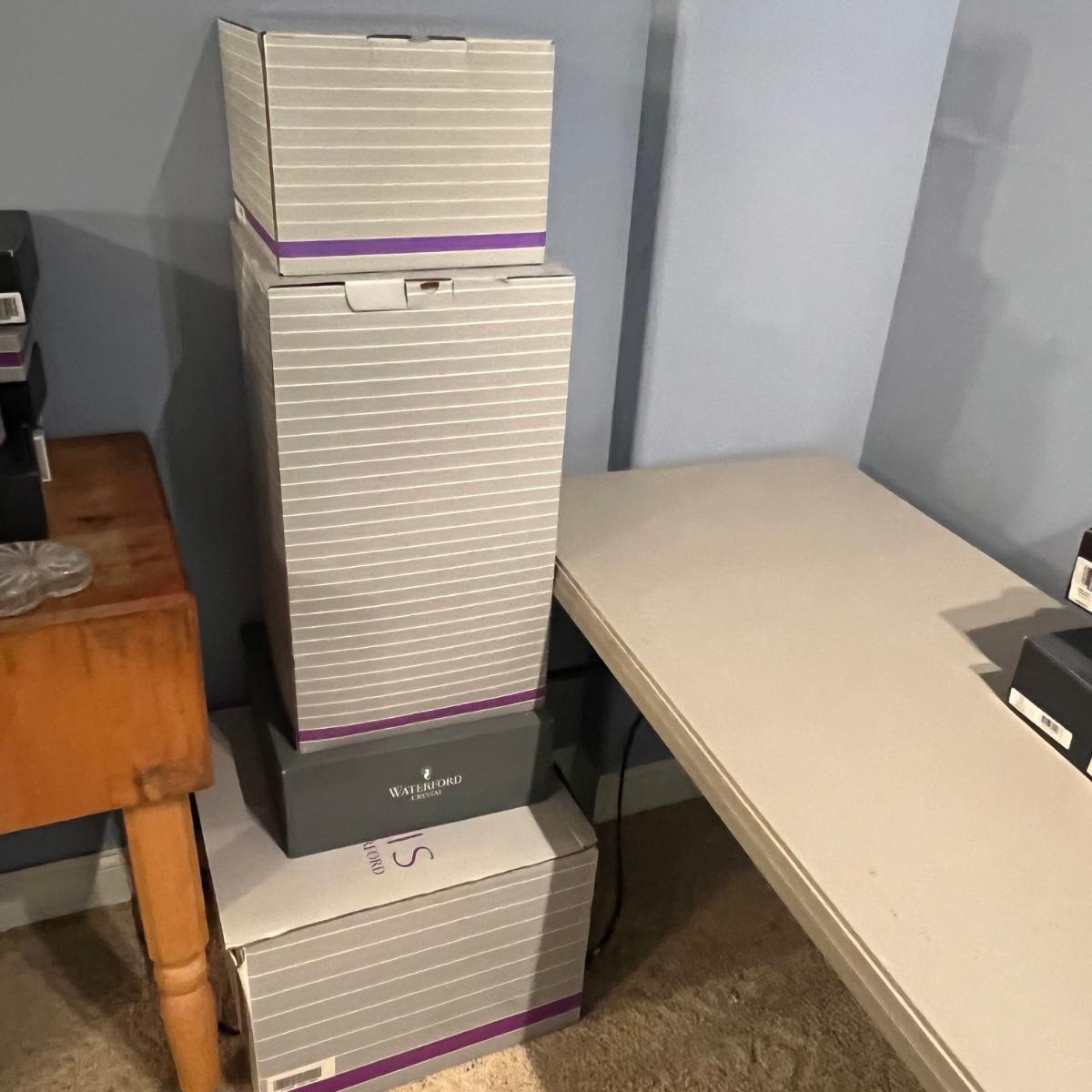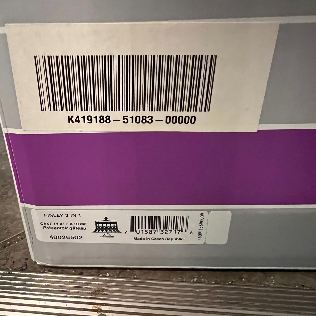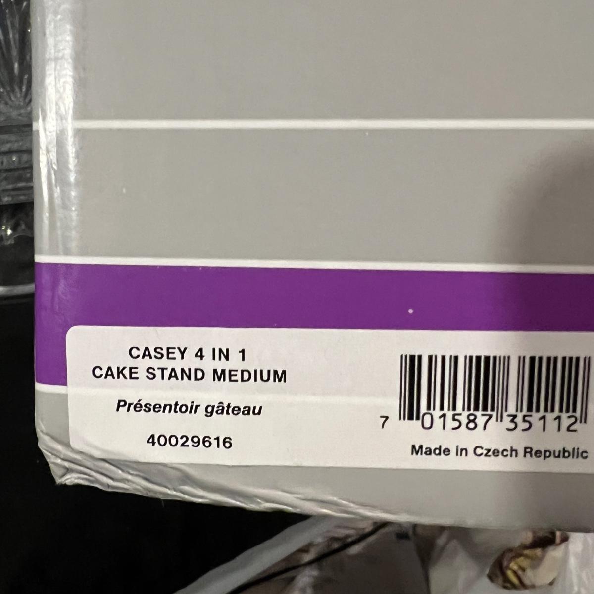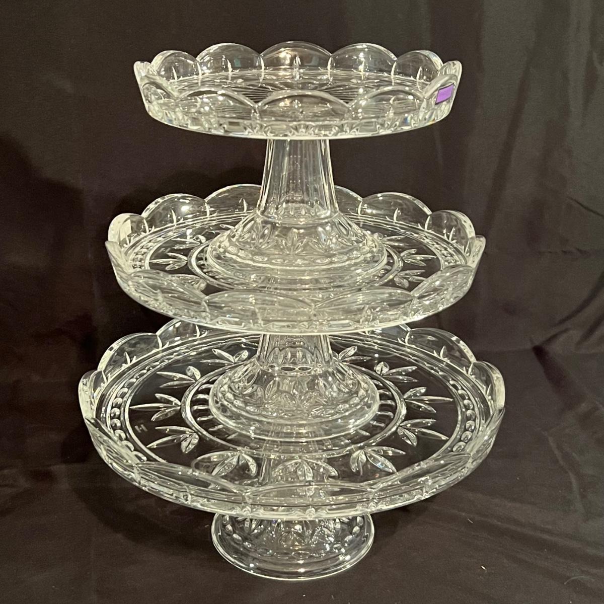All four of these Waterford cake stands appear to be new in box. See images for full inventory. Largest cake stand measures 17”D x 14”H (this is to the top of the dome).