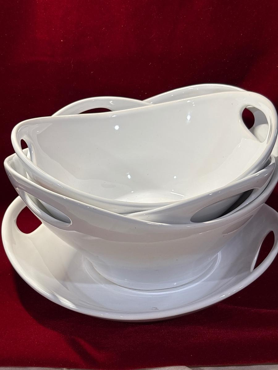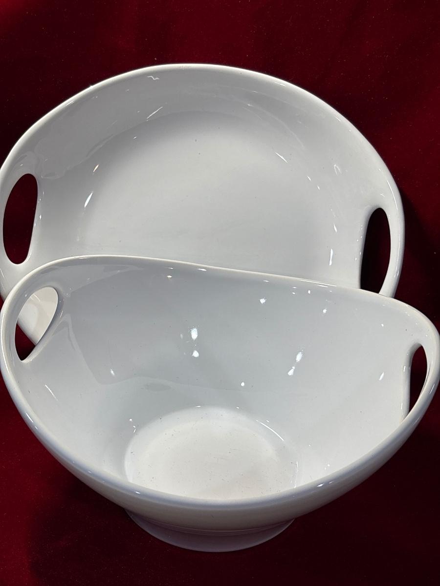 Four great white ceramic serveware pieces. Three bowels, one 12” across; two 10.5” across; one 12.5” platter type. Matceramic made In Portugal.