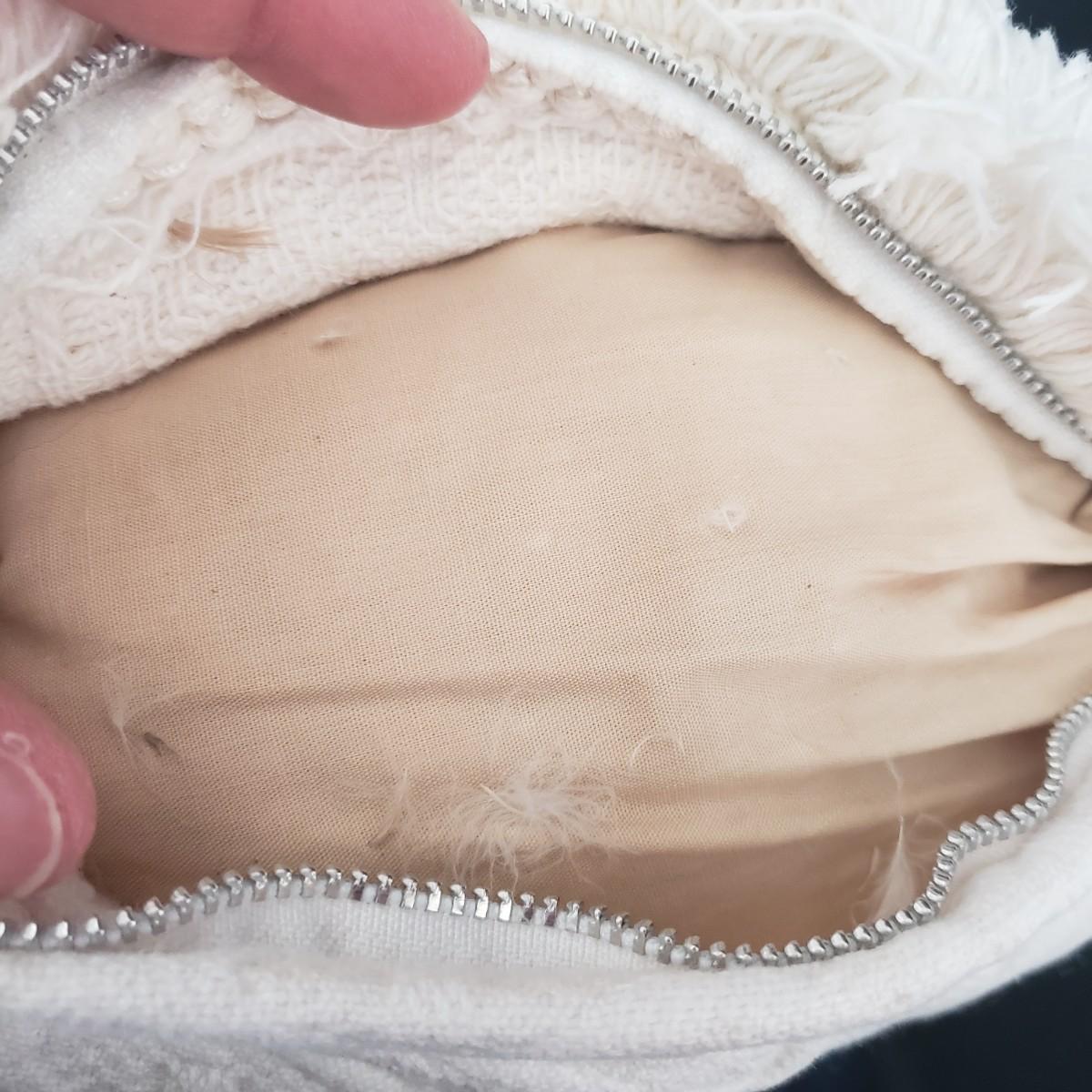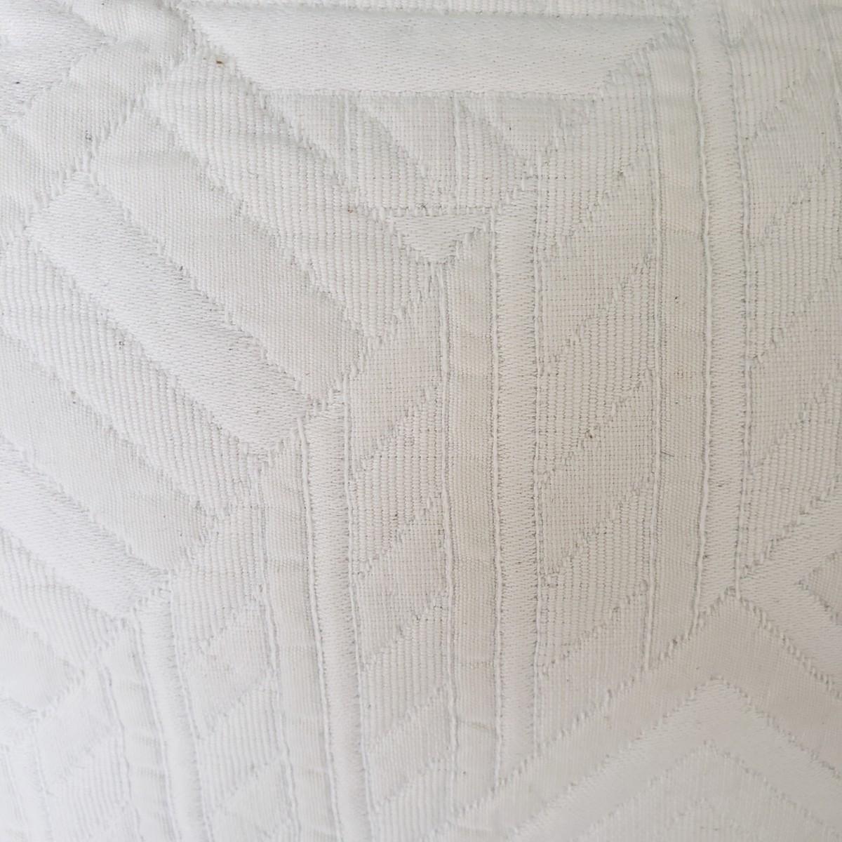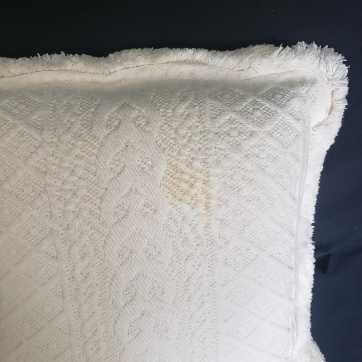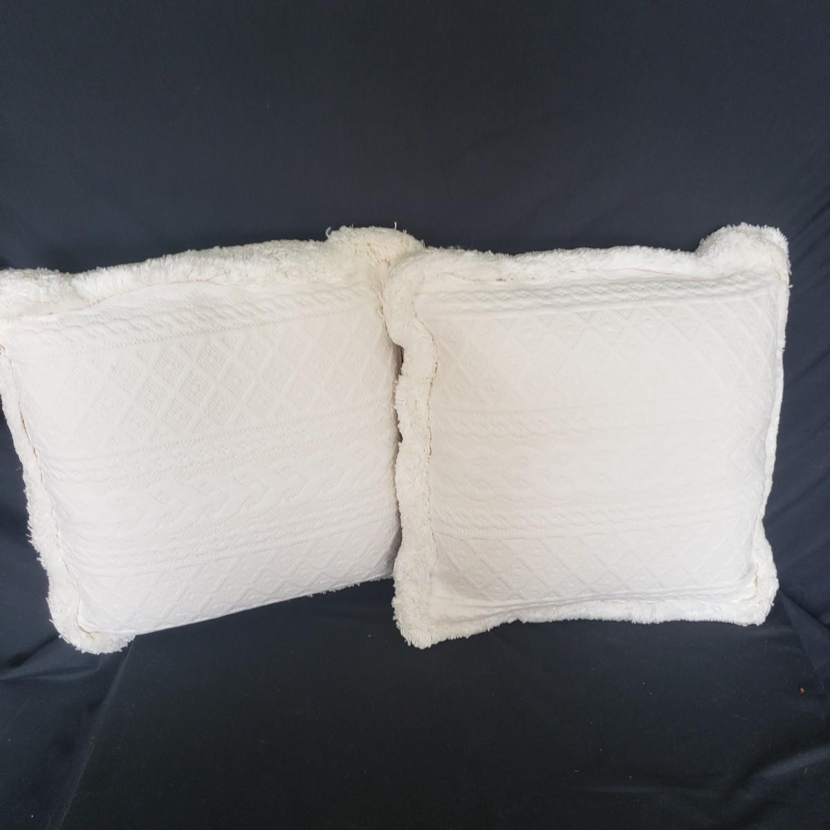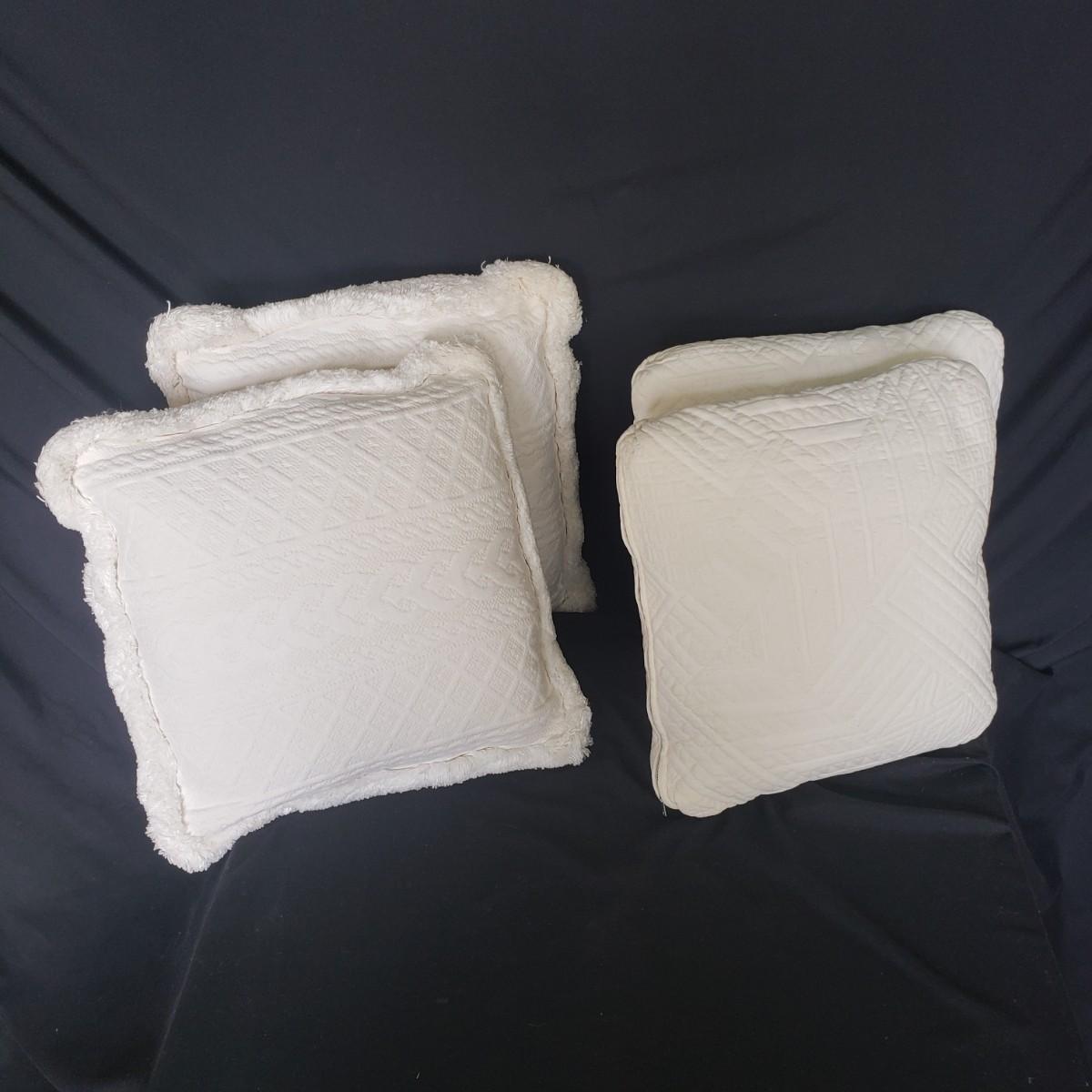 These four white pillows measure approximately 14" x 14". All four are the same color, lot contains two different patterned pairs. The pillows with the fringe are down filled. One has a stain, see pictures.