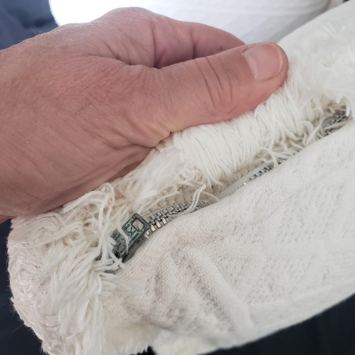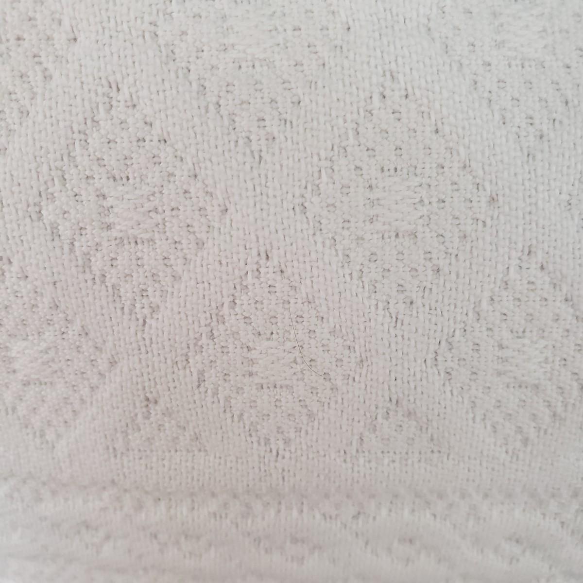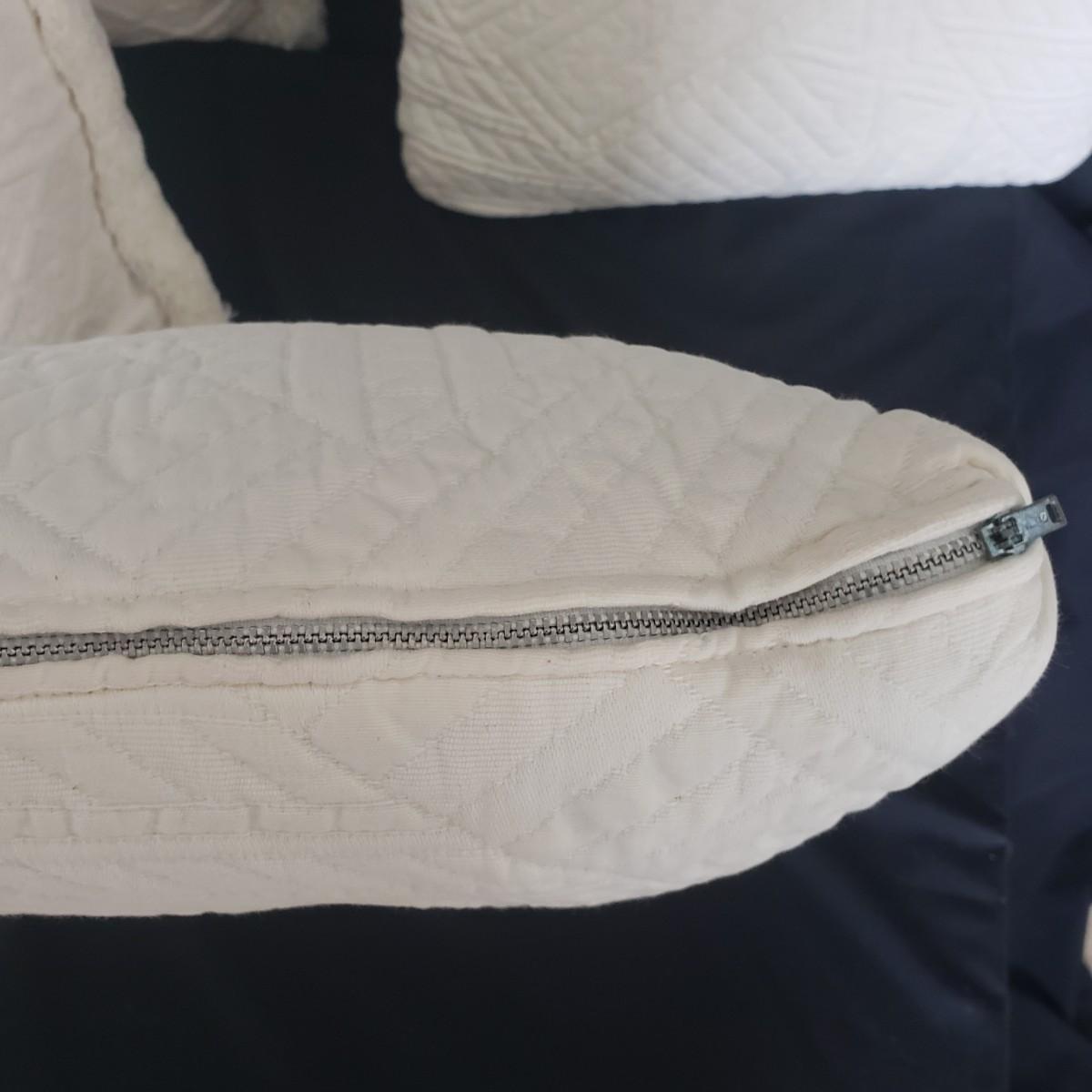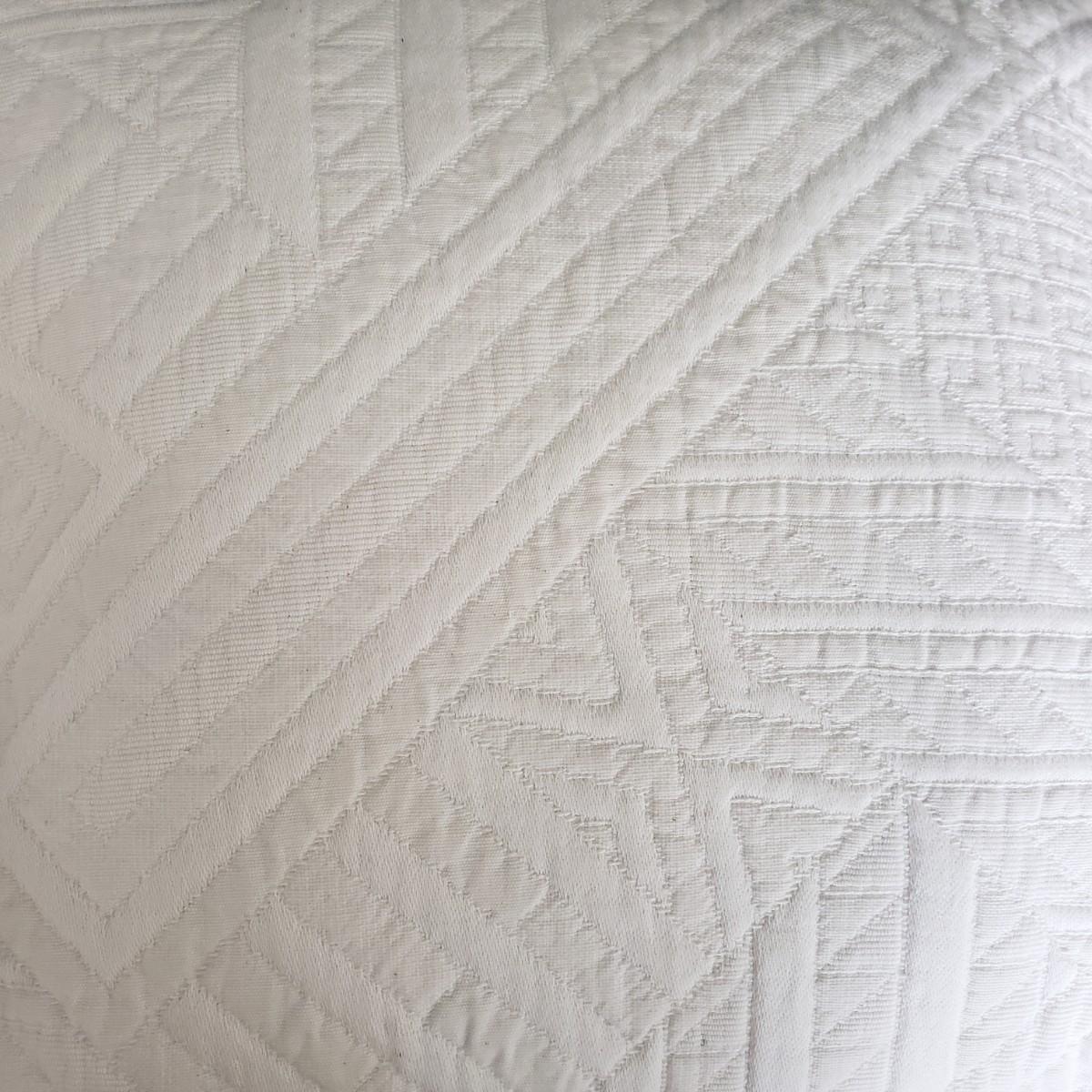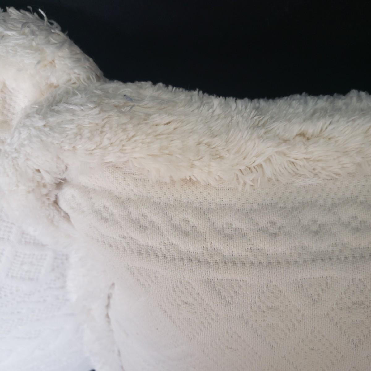 These four white pillows measure approximately 14" x 14". All four are the same color, lot contains two different patterned pairs. The pillows with the fringe are down filled. One has a stain, see pictures.