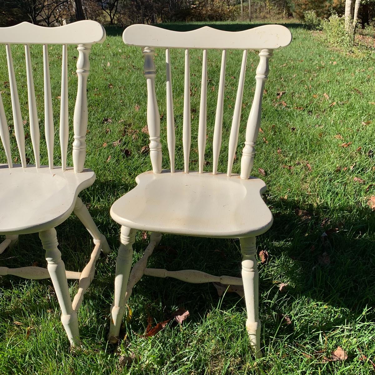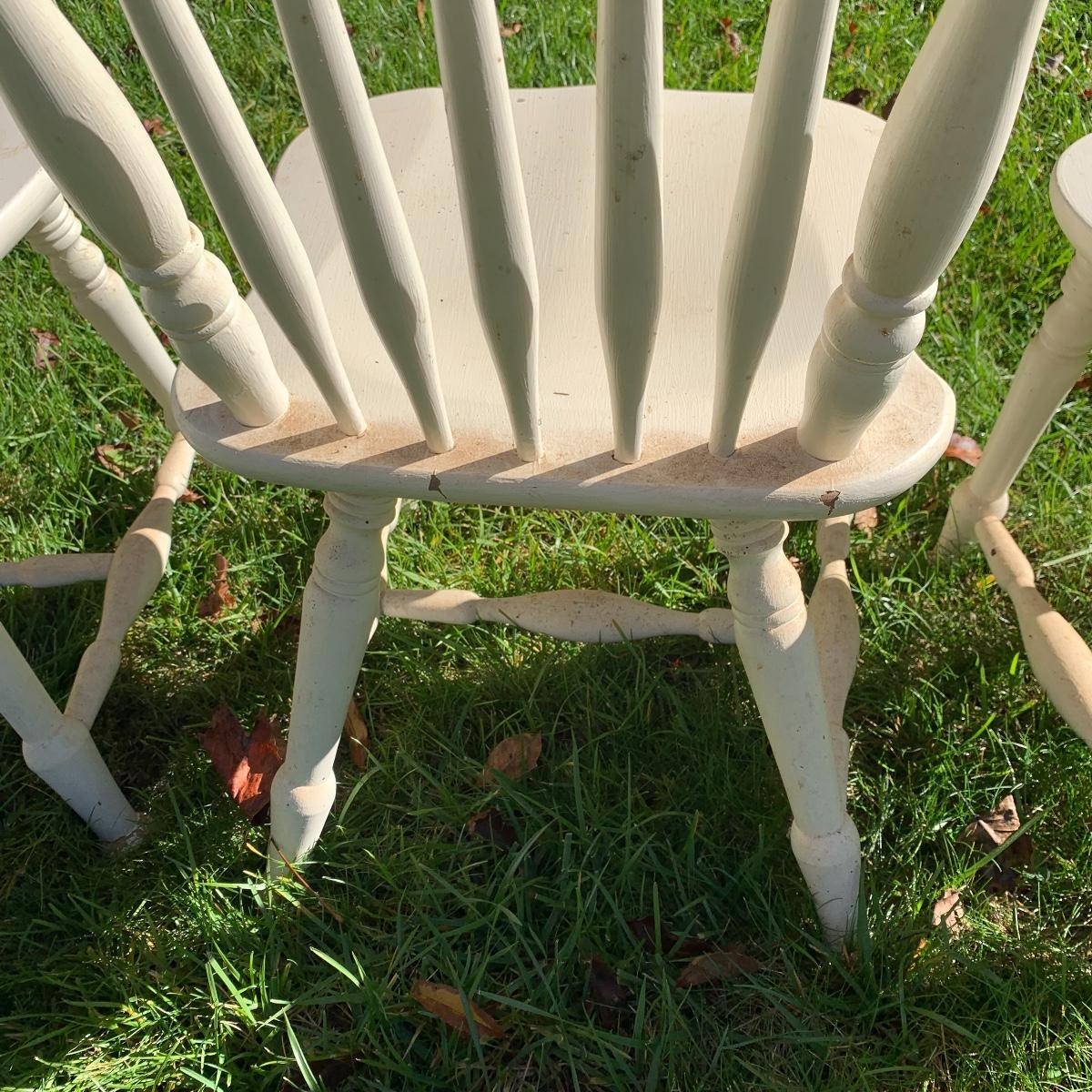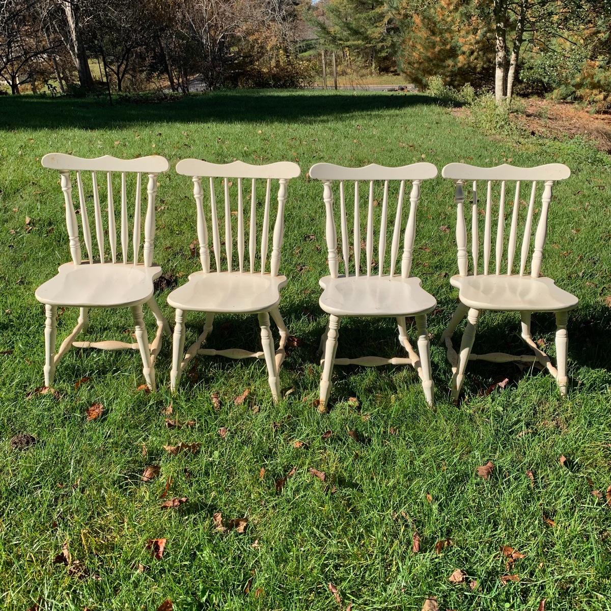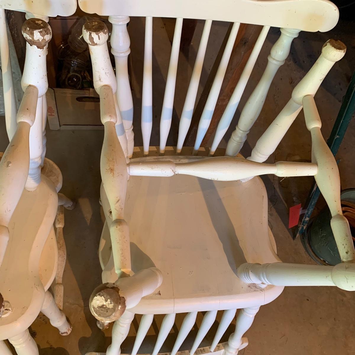 Four matching wooden chairs painted white. The paint is a bit chipped on all chairs, mostly on the feet, and are a bit dusty. The chairs are structurally in good condition. Chair dimensions are 17” x 18” x 34”. The seat height is 17”. Local Pickup Only