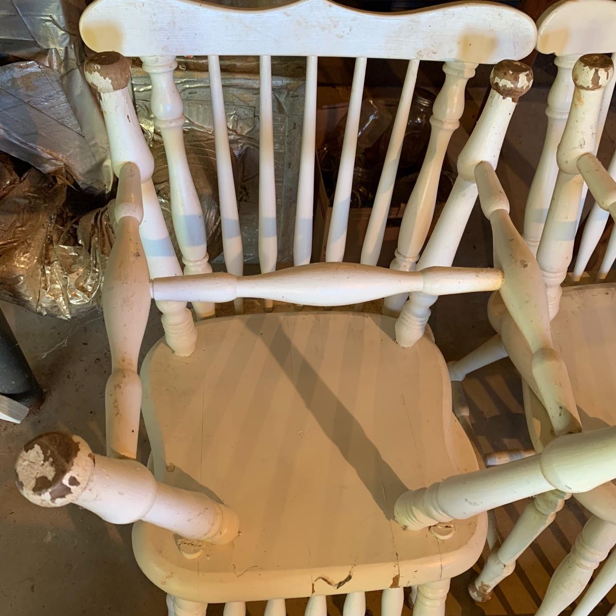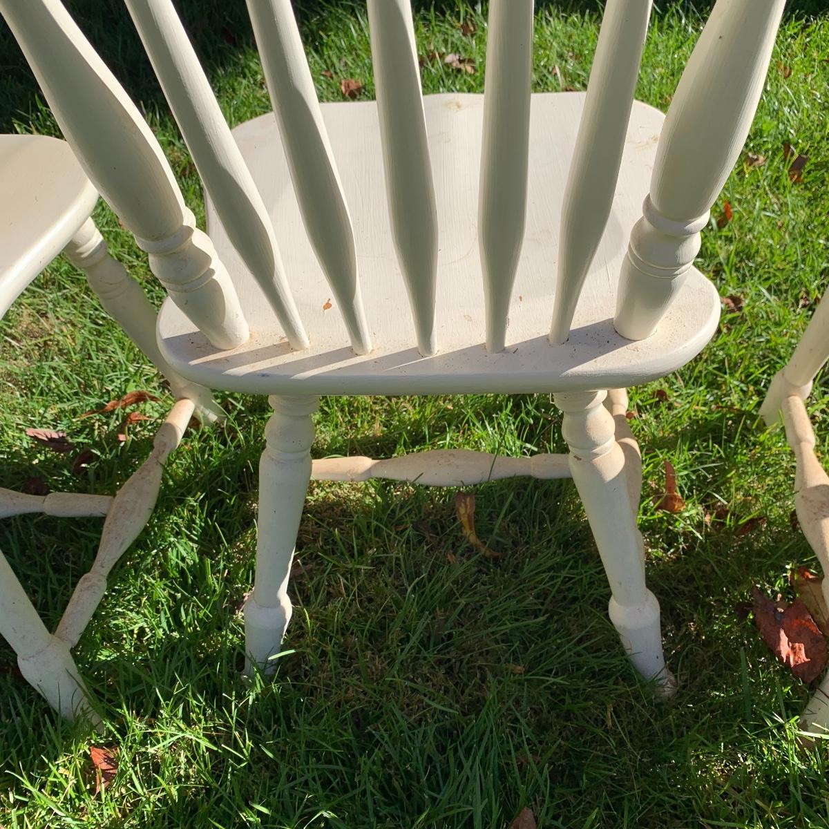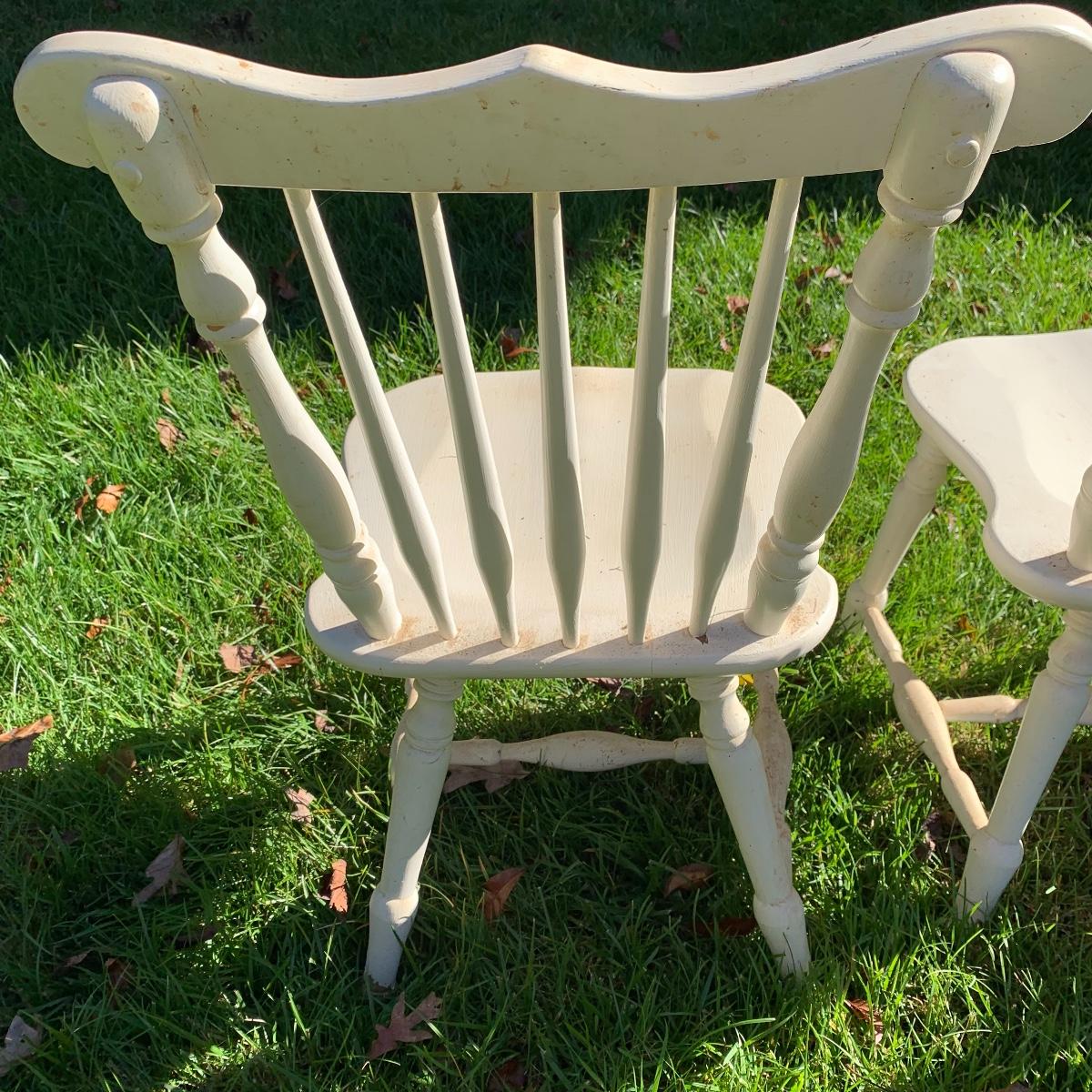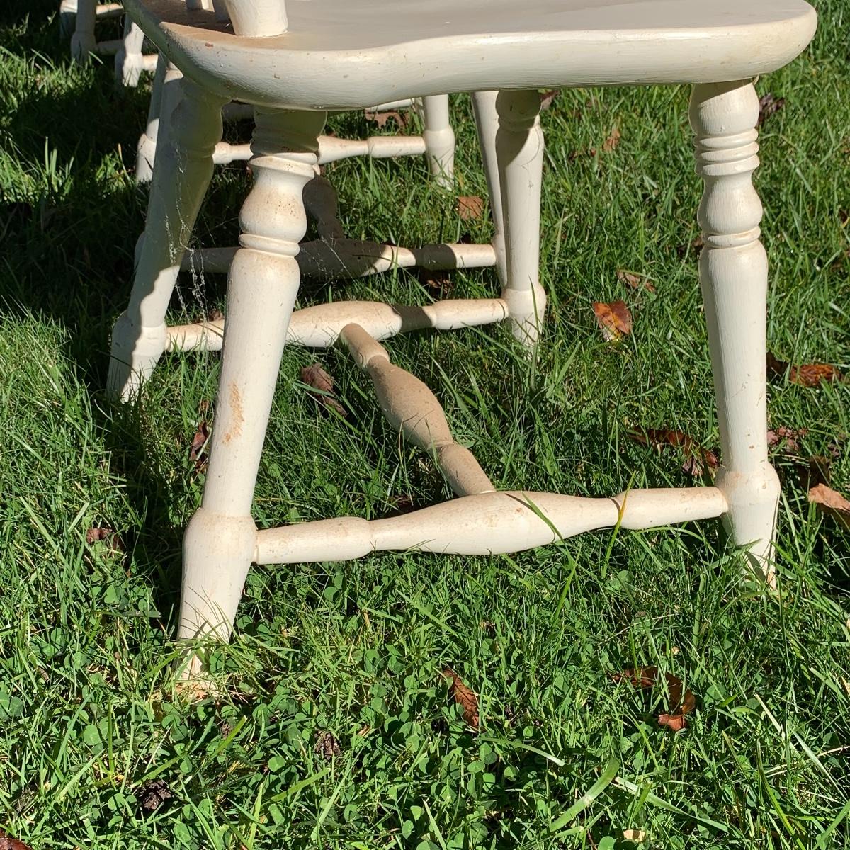 Four matching wooden chairs painted white. The paint is a bit chipped on all chairs, mostly on the feet, and are a bit dusty. The chairs are structurally in good condition. Chair dimensions are 17” x 18” x 34”. The seat height is 17”. Local Pickup Only