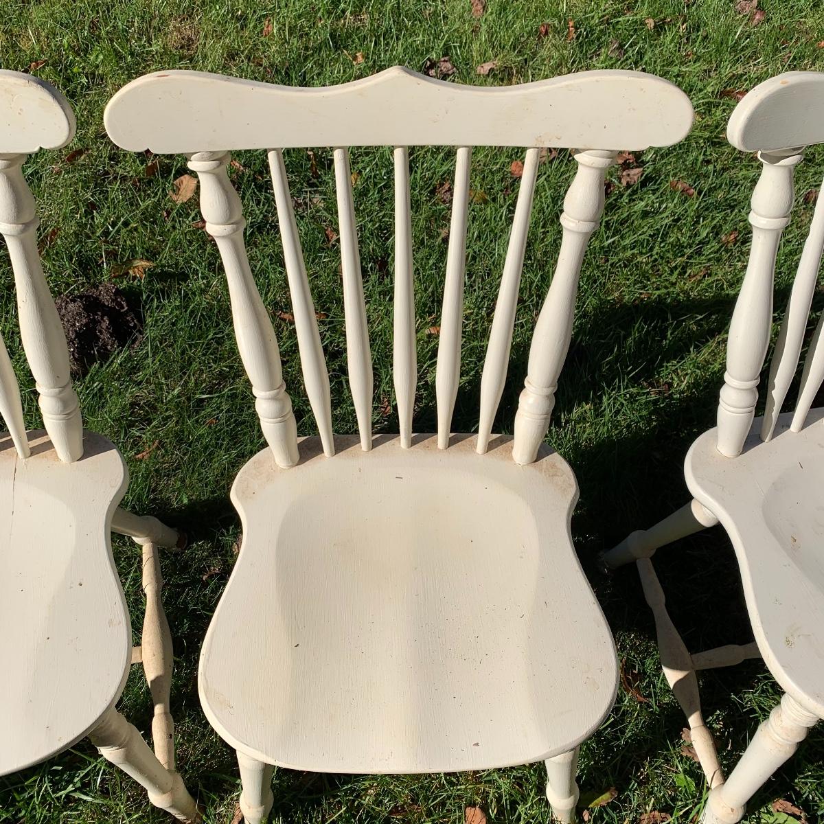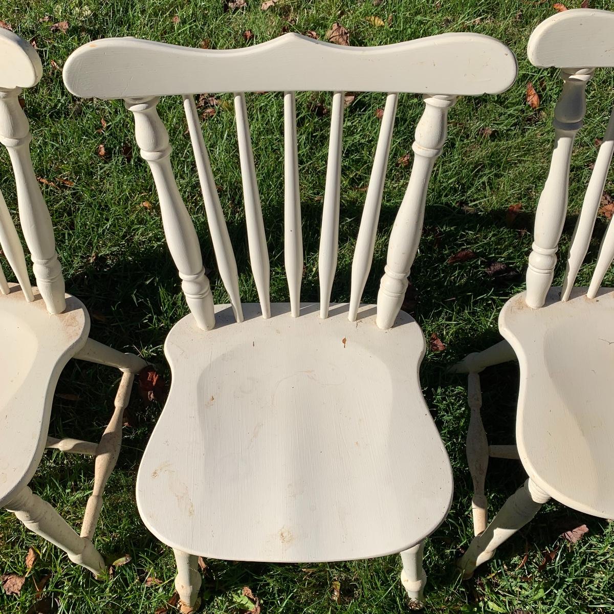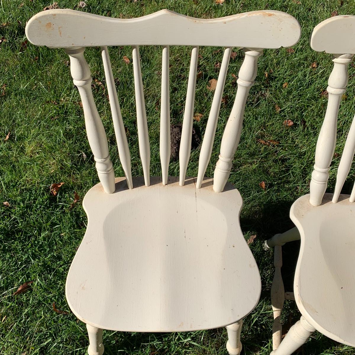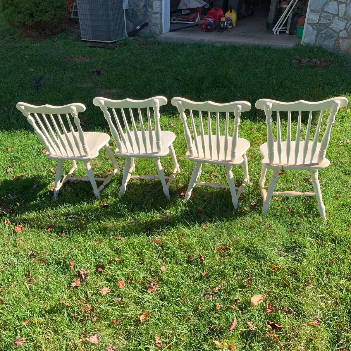 Four matching wooden chairs painted white. The paint is a bit chipped on all chairs, mostly on the feet, and are a bit dusty. The chairs are structurally in good condition. Chair dimensions are 17” x 18” x 34”. The seat height is 17”. Local Pickup Only