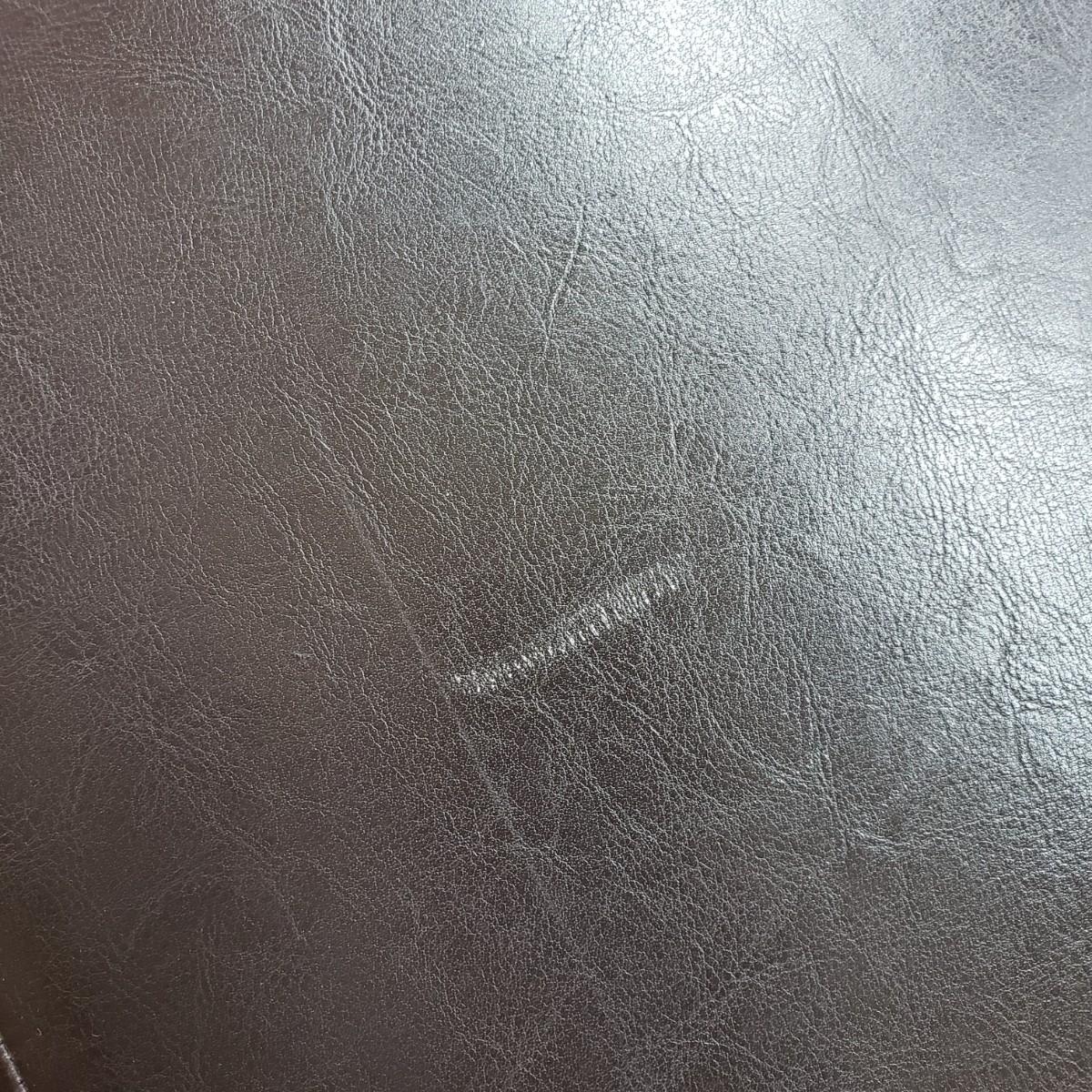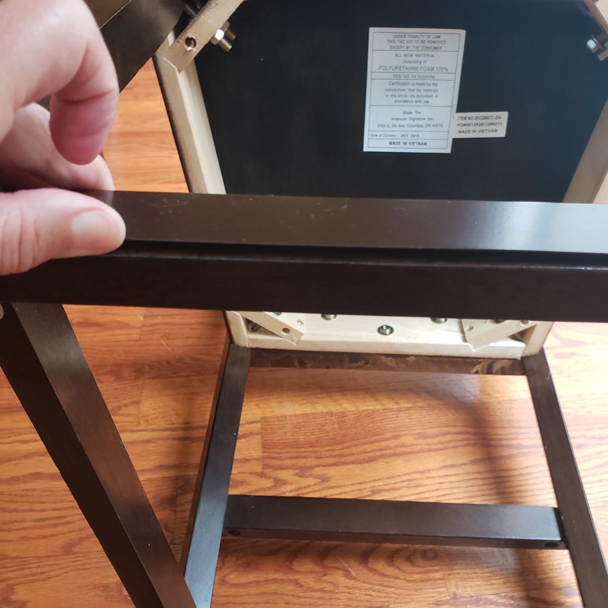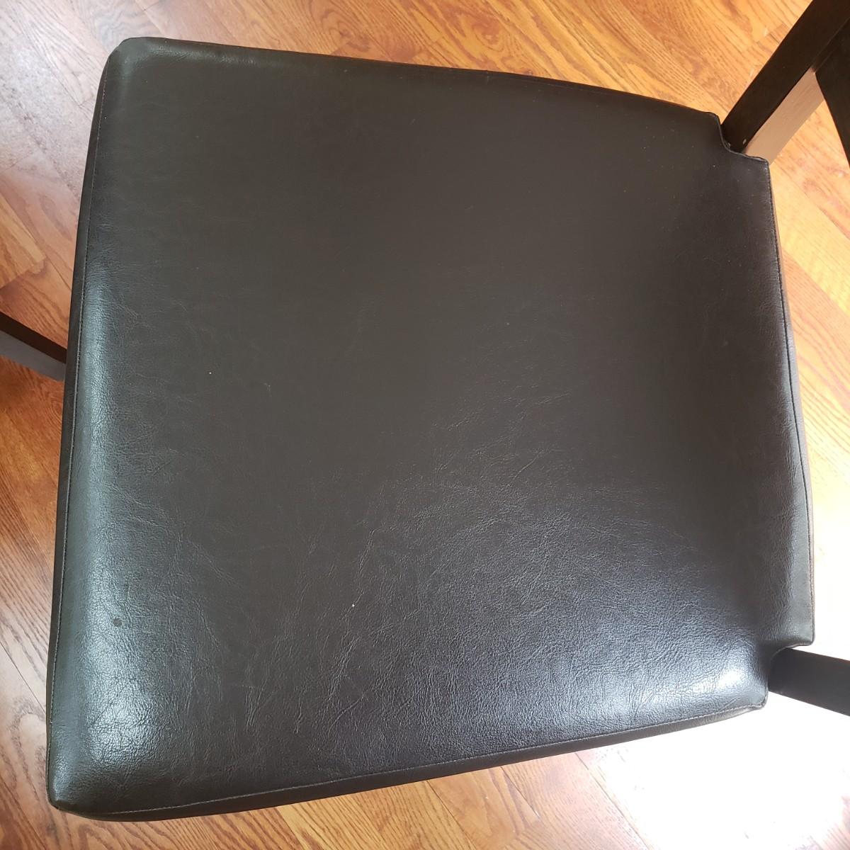 This lot features four matching wooden and leather-like bar stools from American Signature Furniture. The wood on the chair backs is patterned with a light and darker wood stain. There is some wear the the wood on the back parts, see pictures. The seats are covered in a leather-like material. One seat has a mark. The foot rests are covered in a metal sleeve, see picture. The stools measure 18" x 19" x 42"H and the seat height is 26".