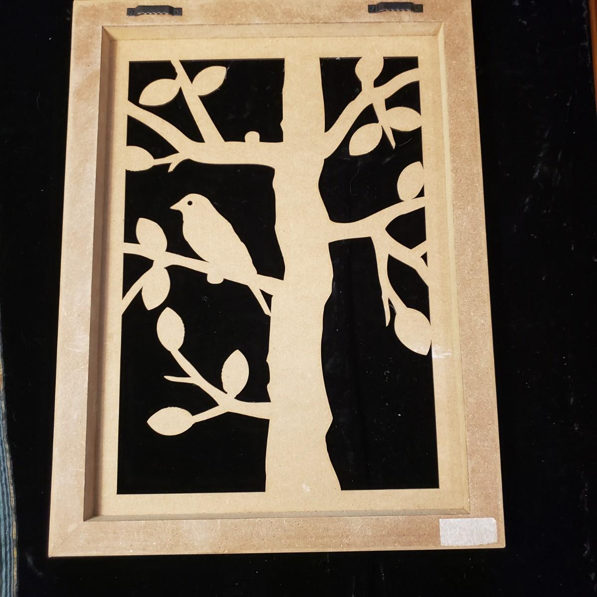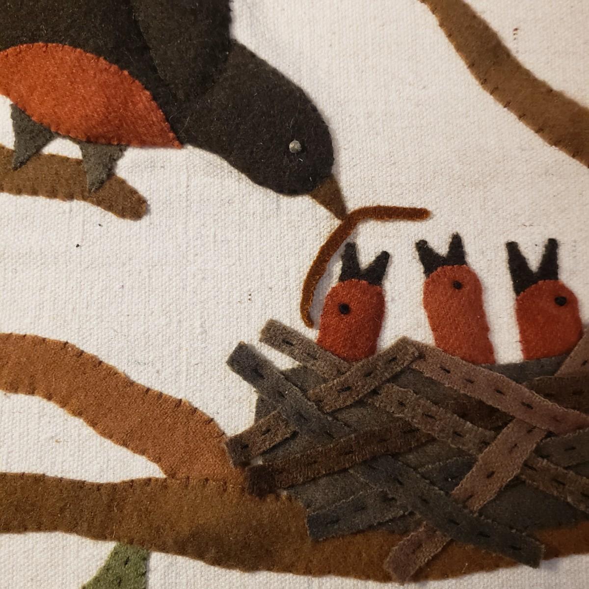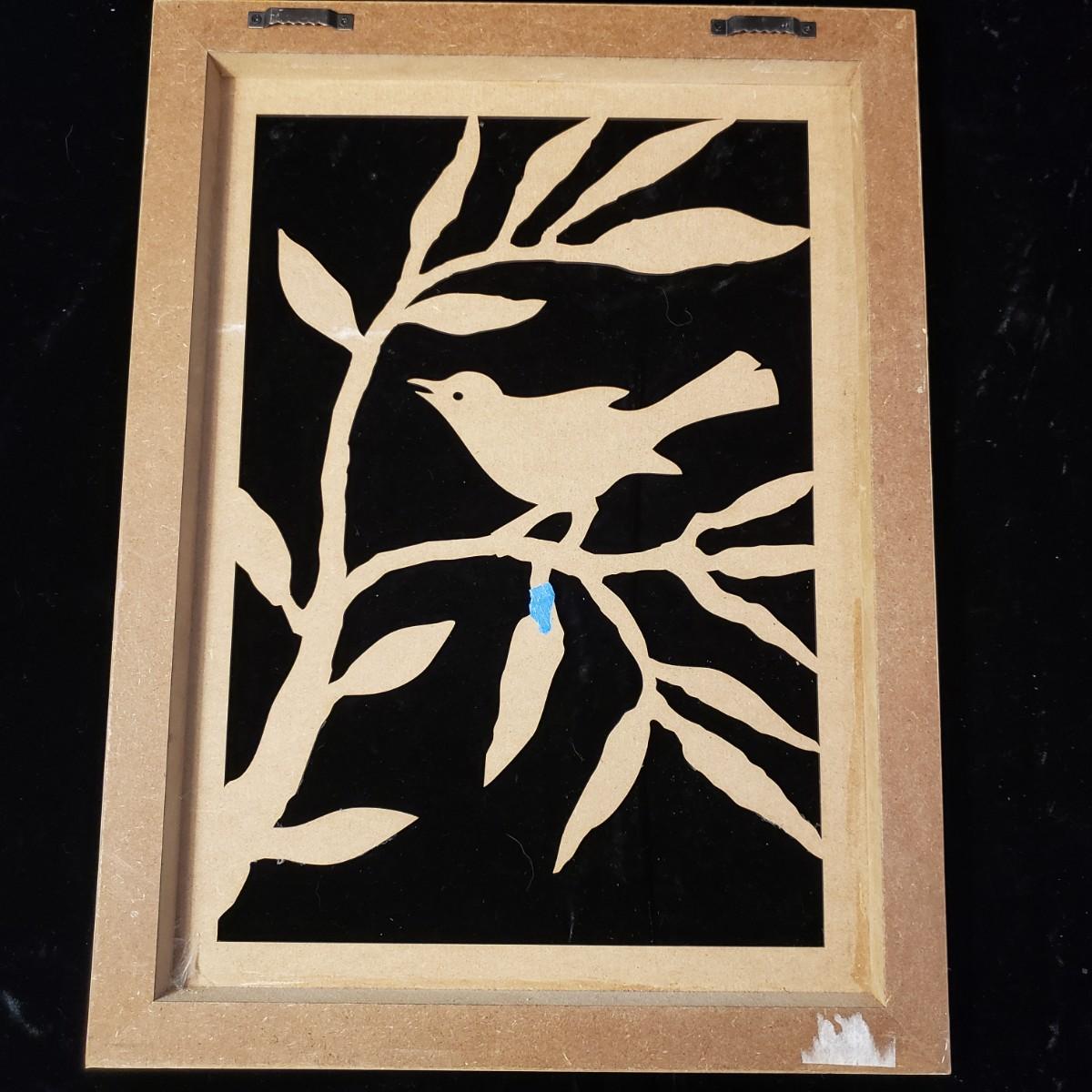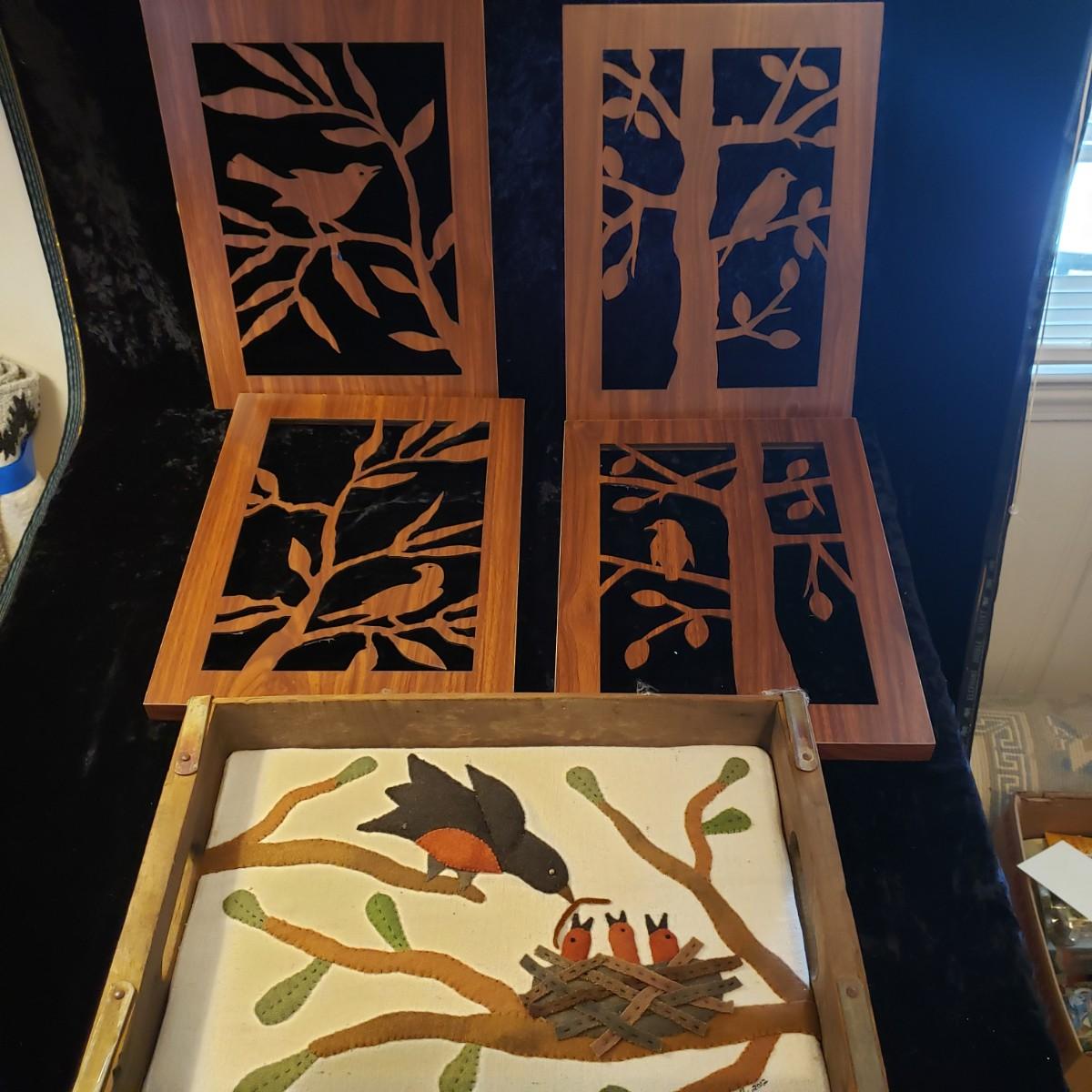 This bird lot features four frames with cut outs of birds in trees. The frames measure 12" x 16". There is one frame that has a leaf broken. We couldn't break up the birds, so we left this one in the lot. The felted mother bird feeding her babies is sewn onto a foam piece and inserted in an antique bottle box. It has a hanger on the back.