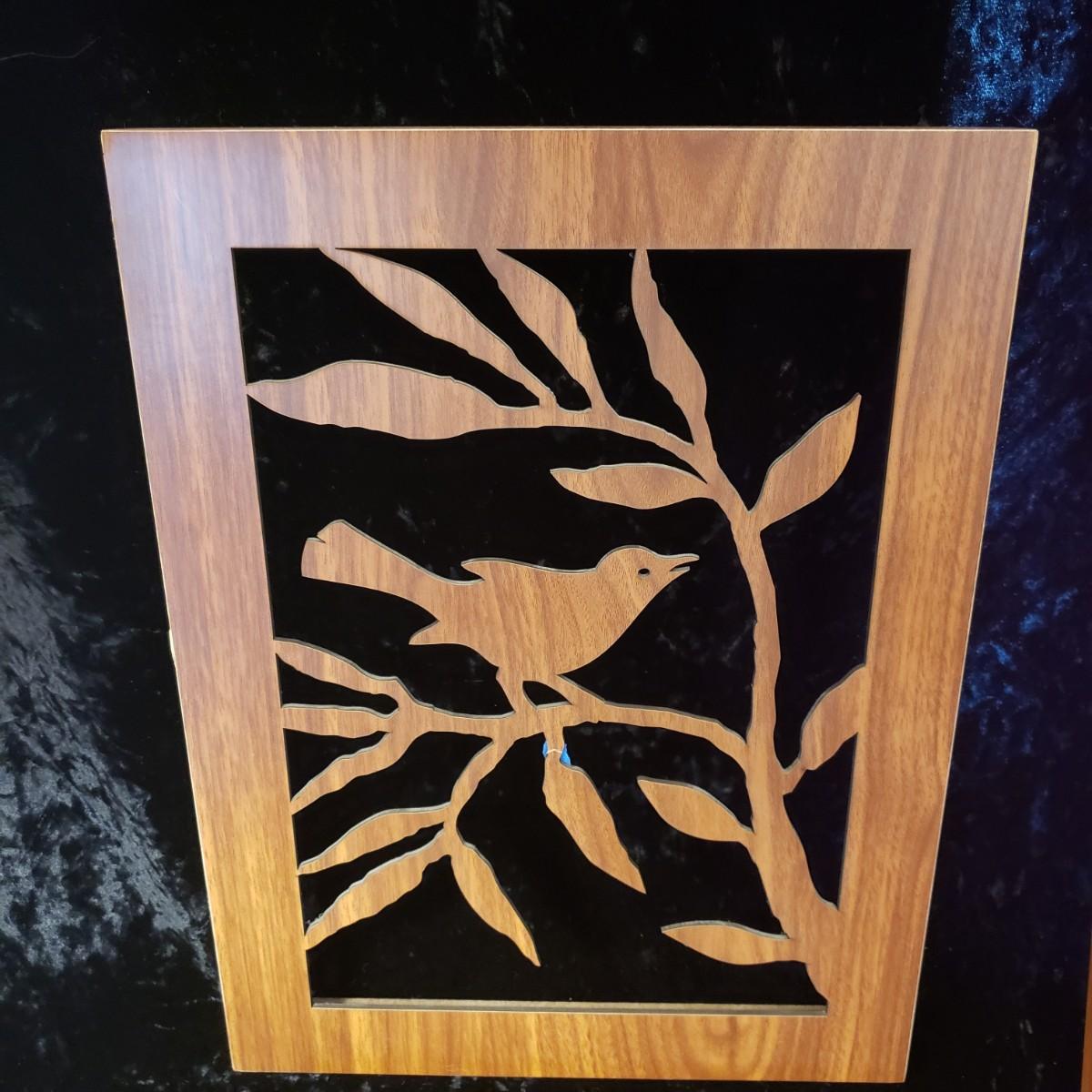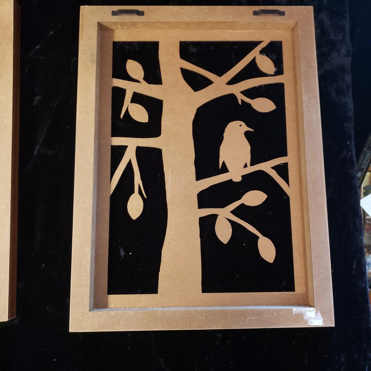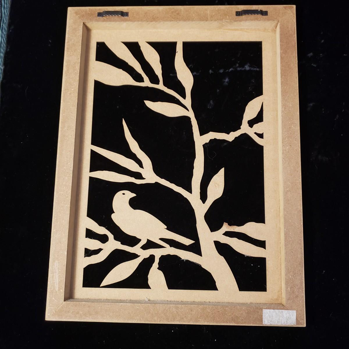 This bird lot features four frames with cut outs of birds in trees. The frames measure 12" x 16". There is one frame that has a leaf broken. We couldn't break up the birds, so we left this one in the lot. The felted mother bird feeding her babies is sewn onto a foam piece and inserted in an antique bottle box. It has a hanger on the back.