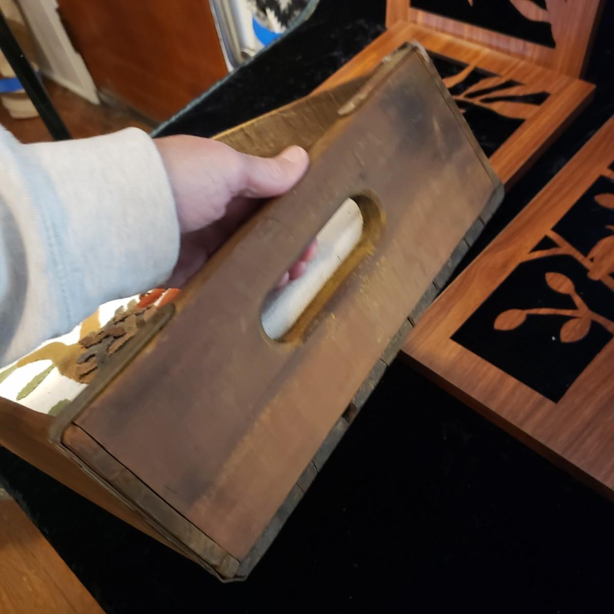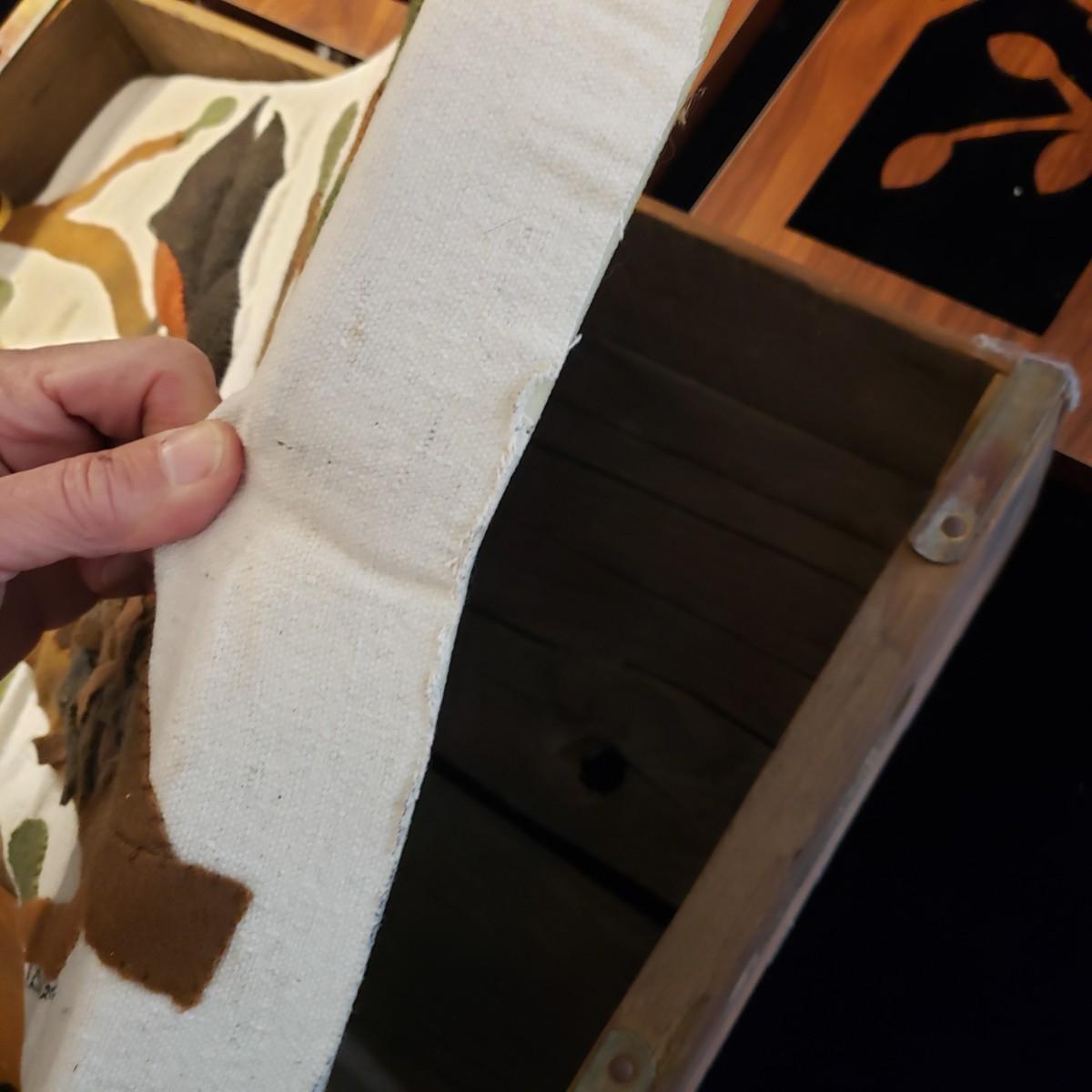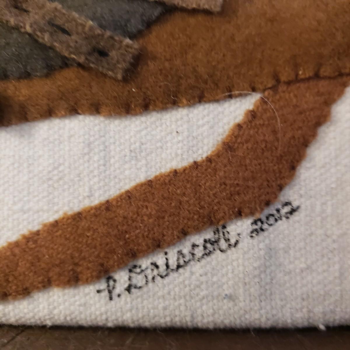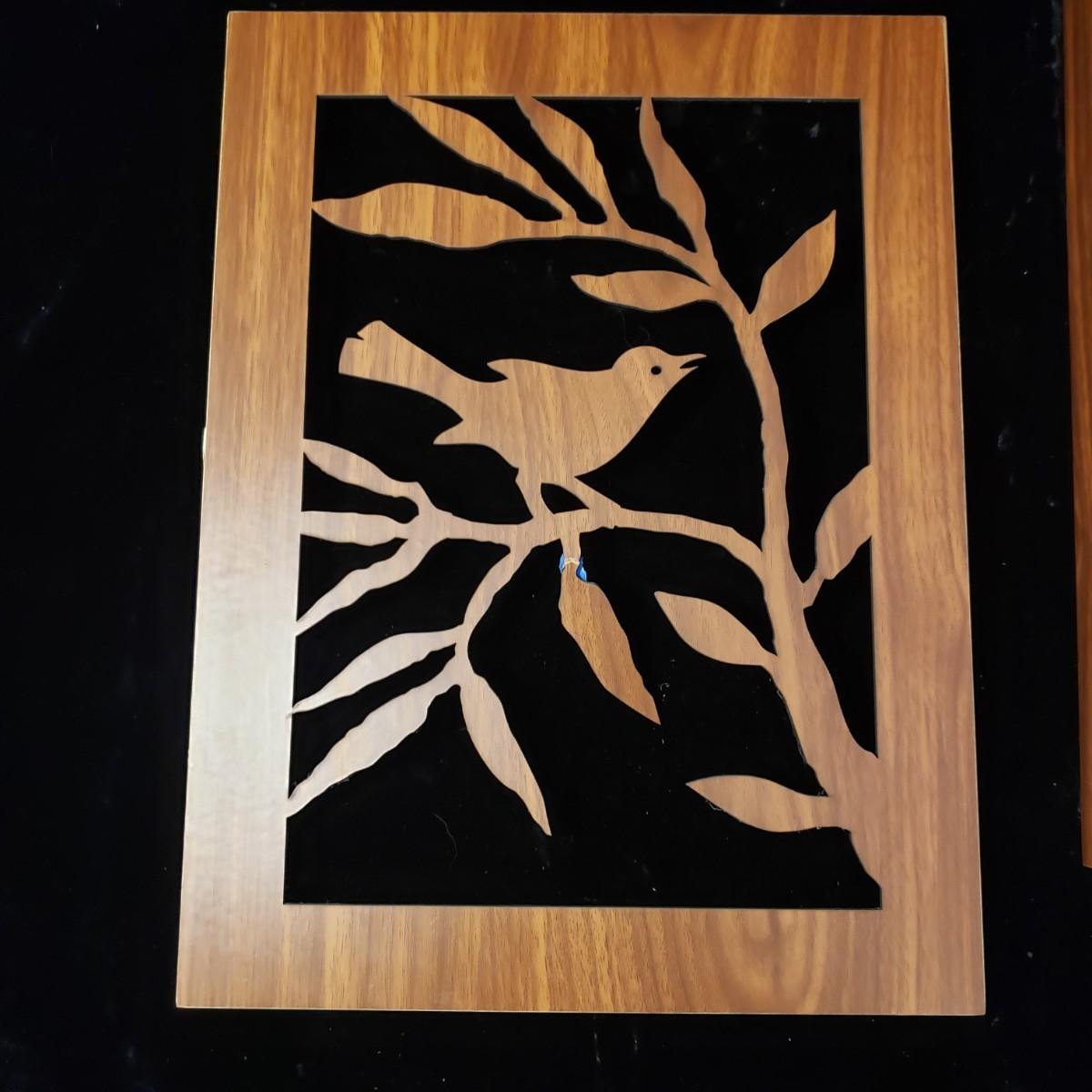 This bird lot features four frames with cut outs of birds in trees. The frames measure 12" x 16". There is one frame that has a leaf broken. We couldn't break up the birds, so we left this one in the lot. The felted mother bird feeding her babies is sewn onto a foam piece and inserted in an antique bottle box. It has a hanger on the back.