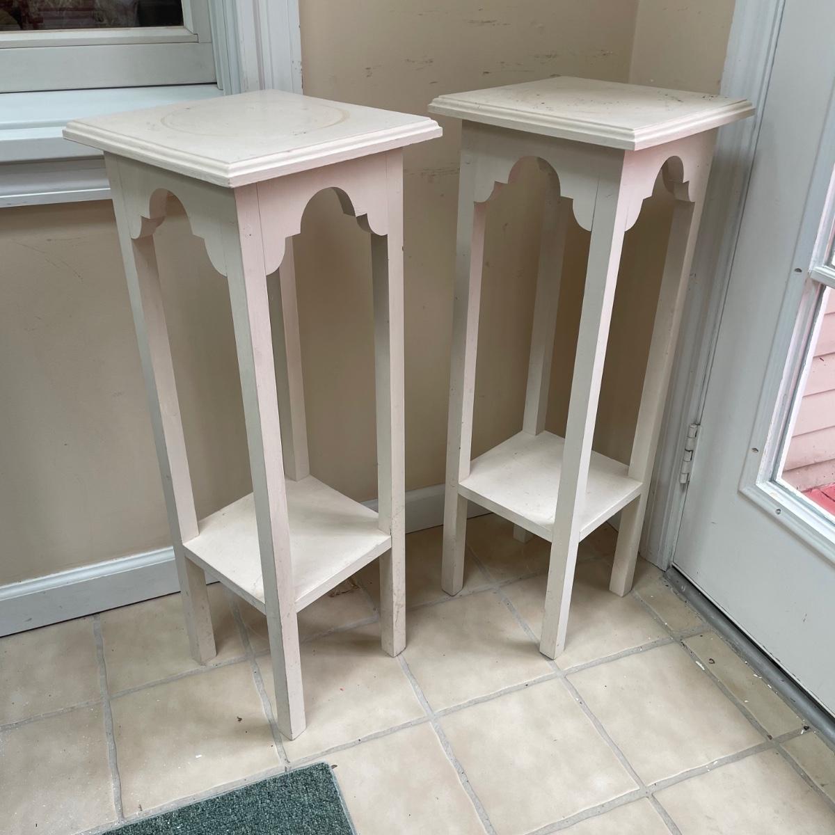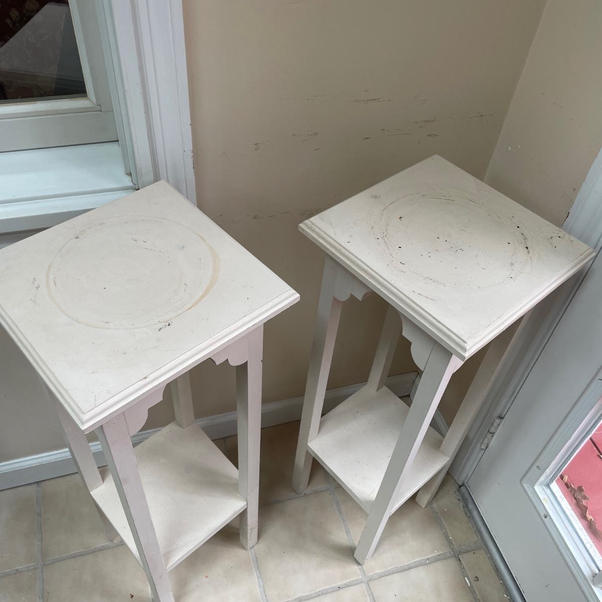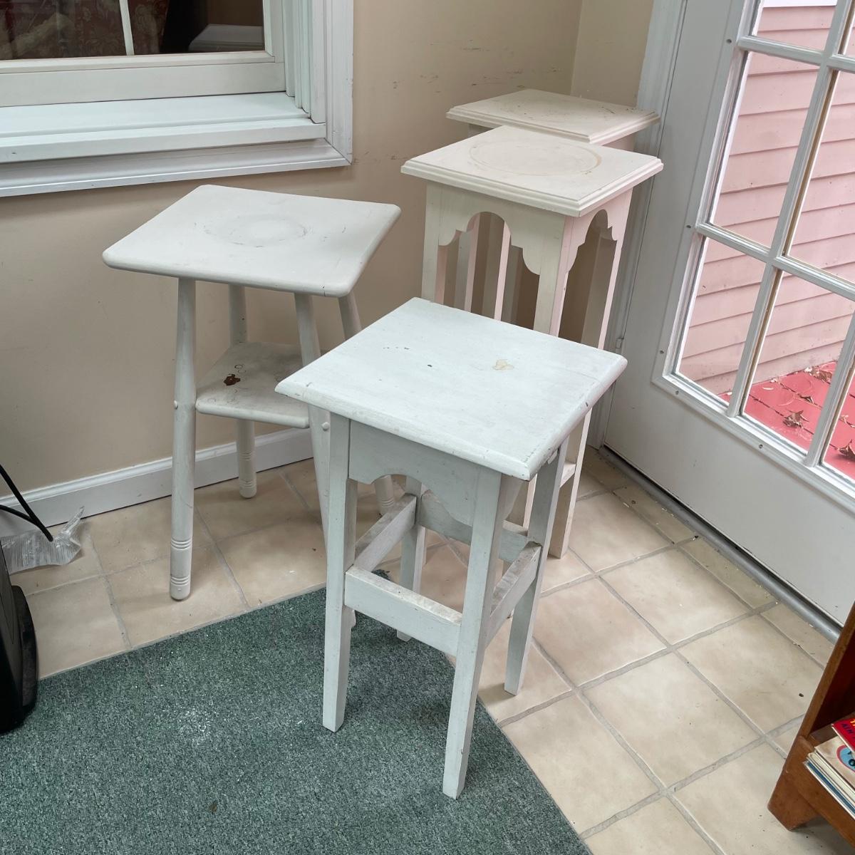 4 sturdy wooden plant stands in this lot; 2 are painted white, the other 2 are a matching pair painted in a dark cream color. All are in good condition but the white ones could take a fresh coat of paint.