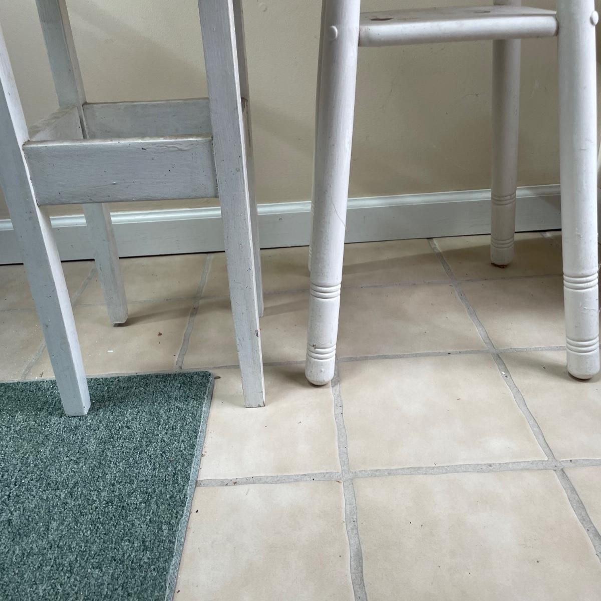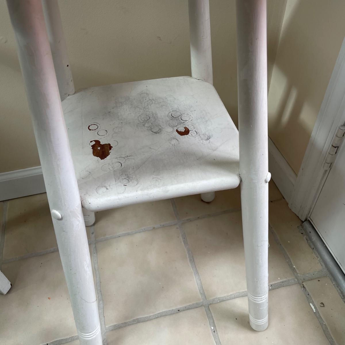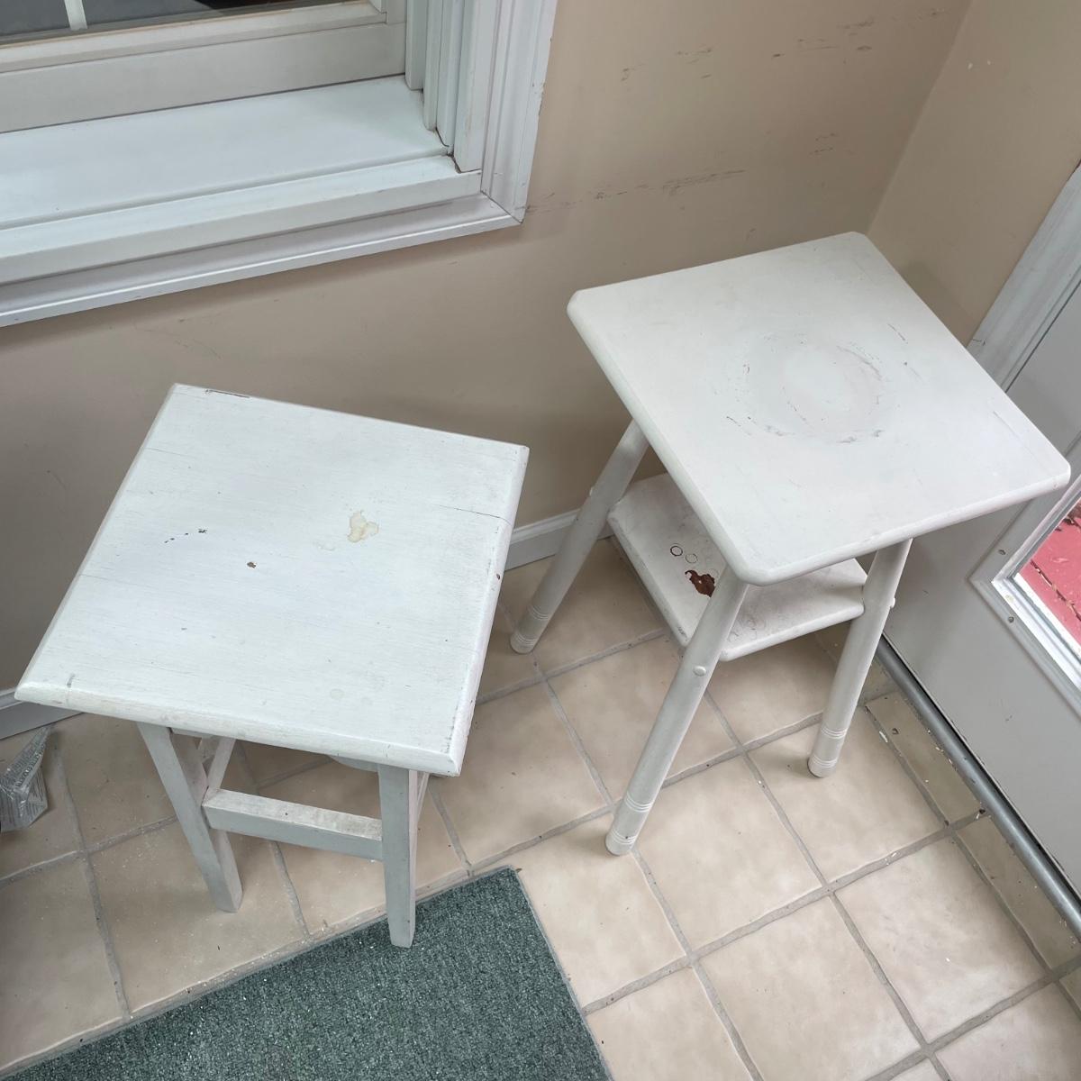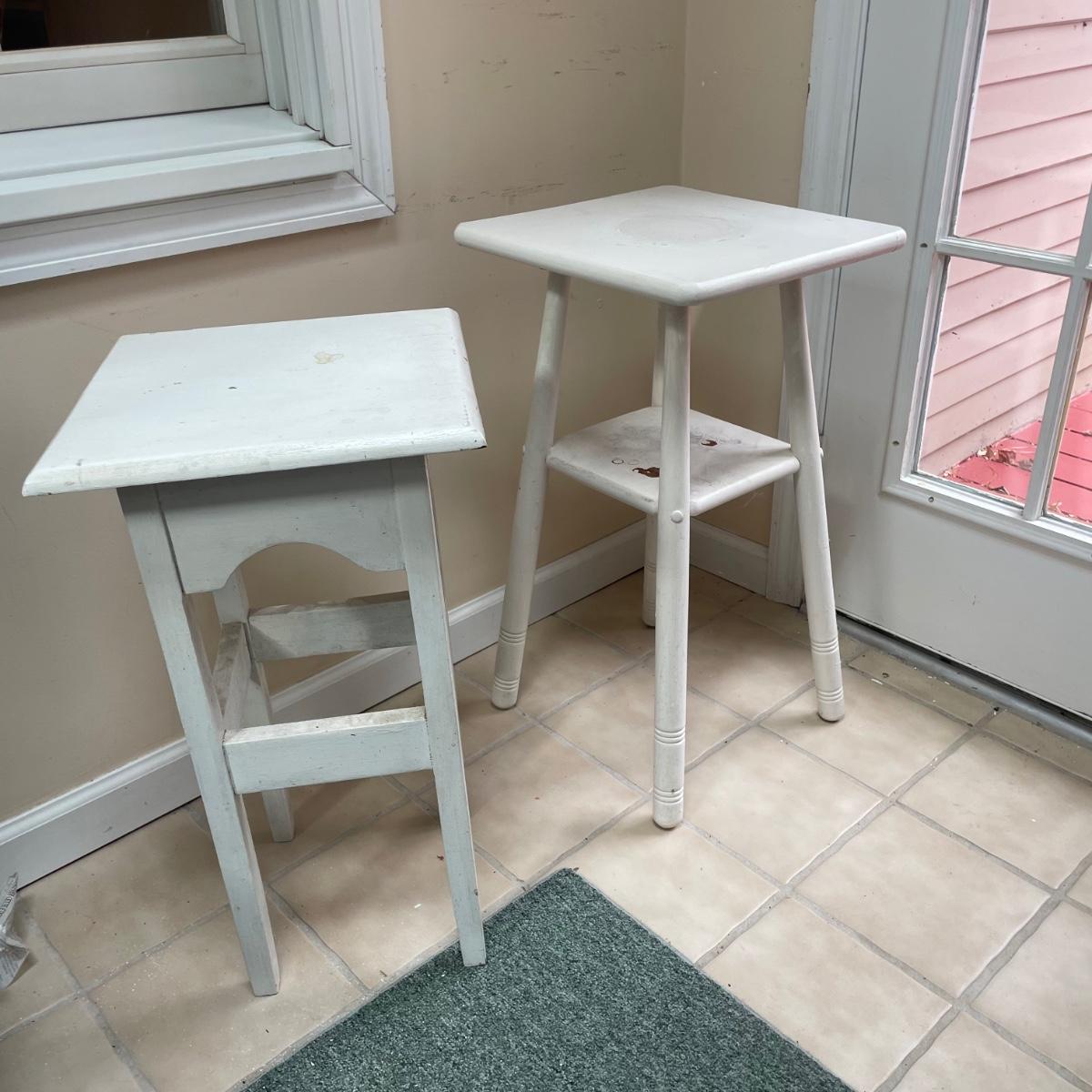 4 sturdy wooden plant stands in this lot; 2 are painted white, the other 2 are a matching pair painted in a dark cream color. All are in good condition but the white ones could take a fresh coat of paint.
