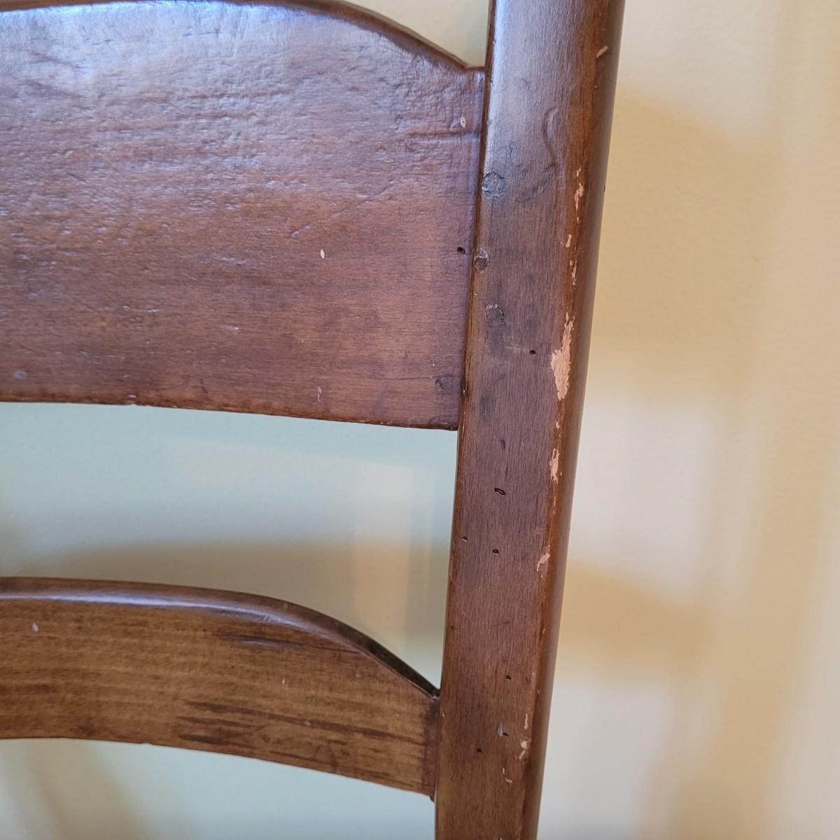 This set of four wooden rush woven seat chairs has one chair with a slightly taller back. Legs are sturdy. Some scuffs throughout (see photos). Measure approximately 17" x 12" x 32"H, seat height 15." Local pickup only.
