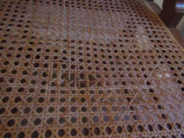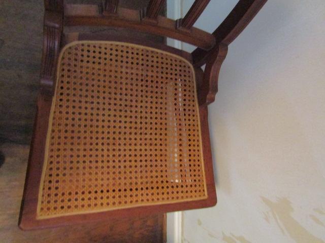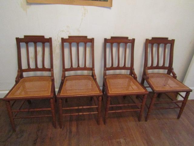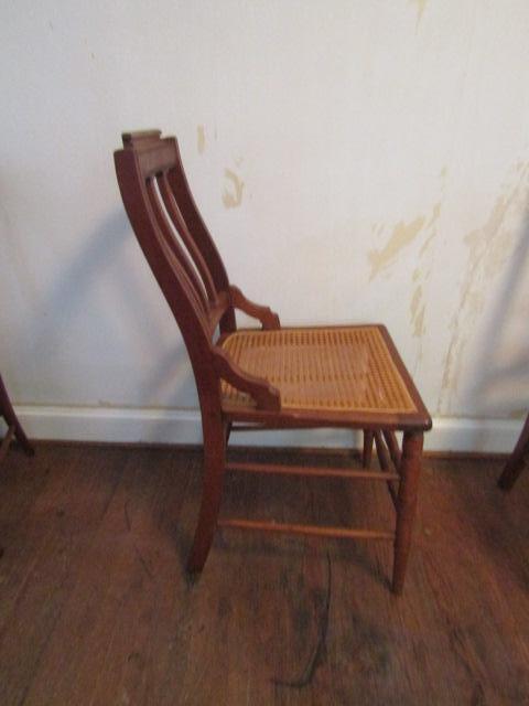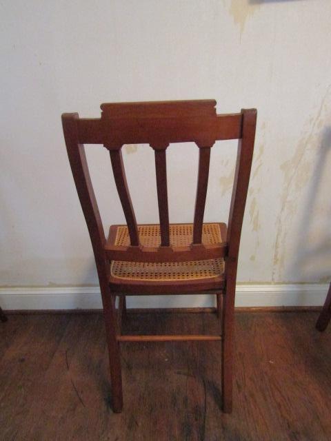 Four Wooden Chairs with Cane Seats. One needs repair to seat. Please see all pictures.