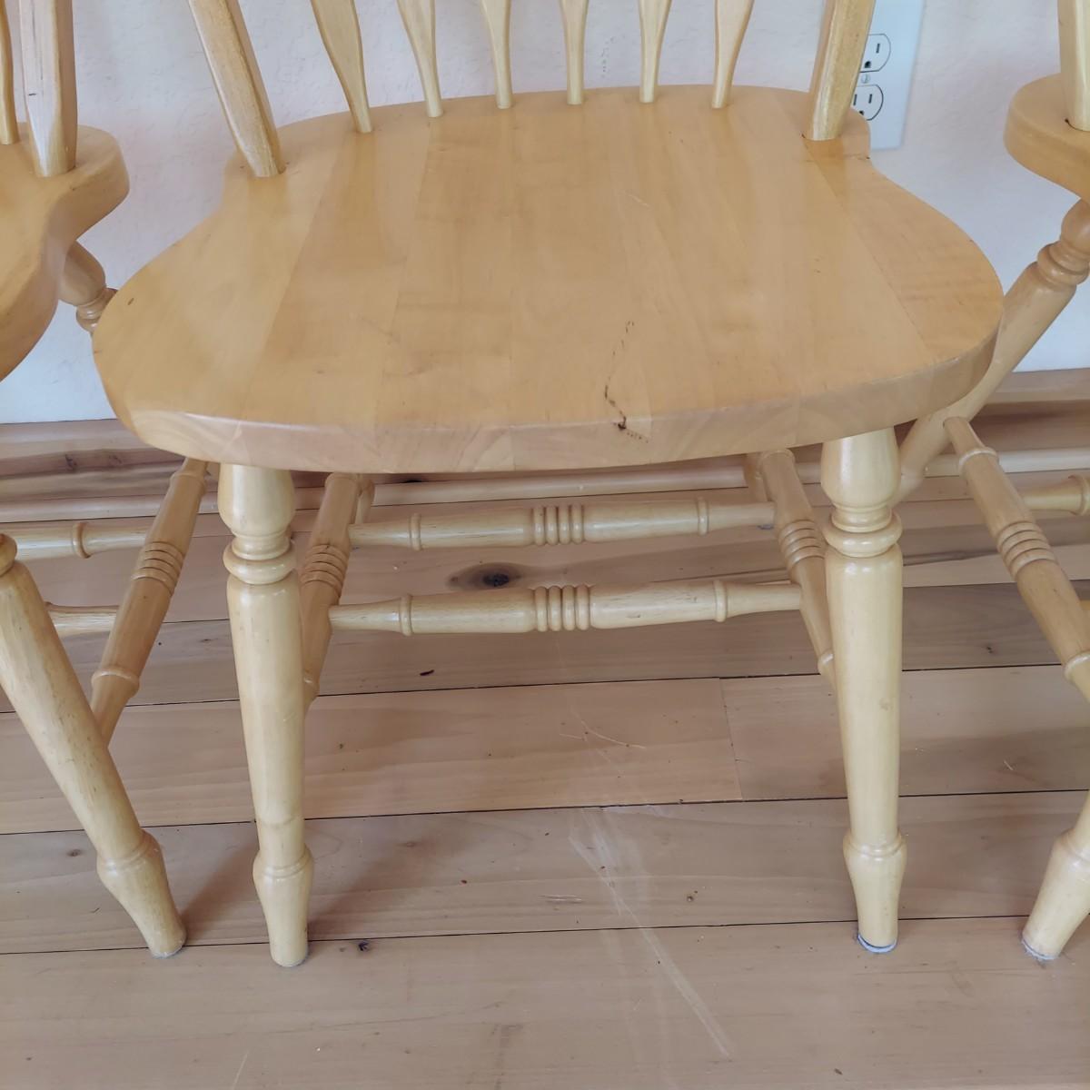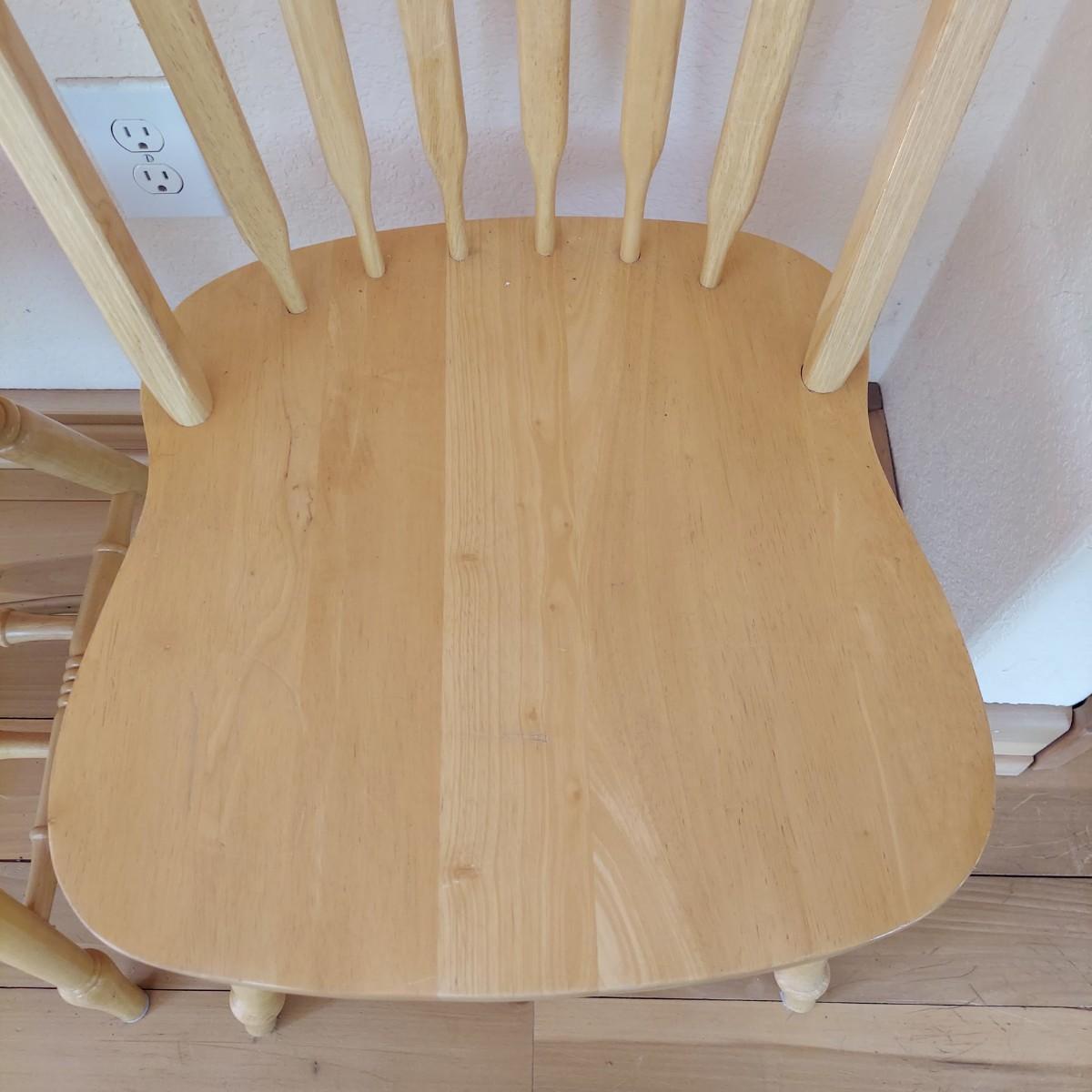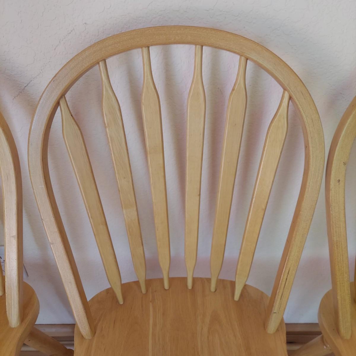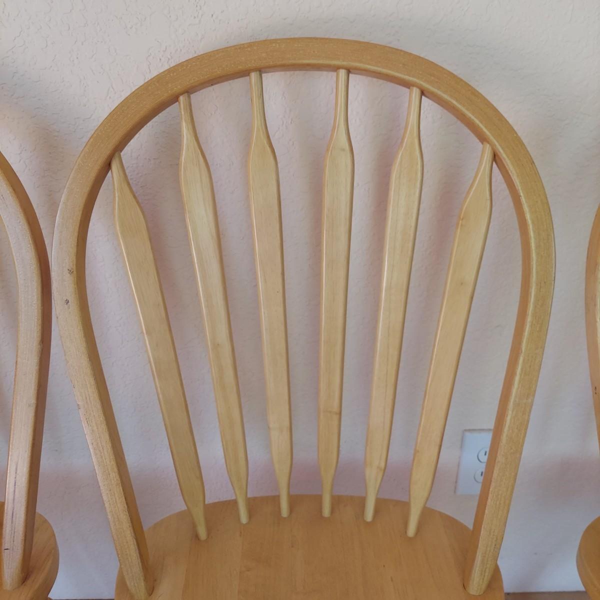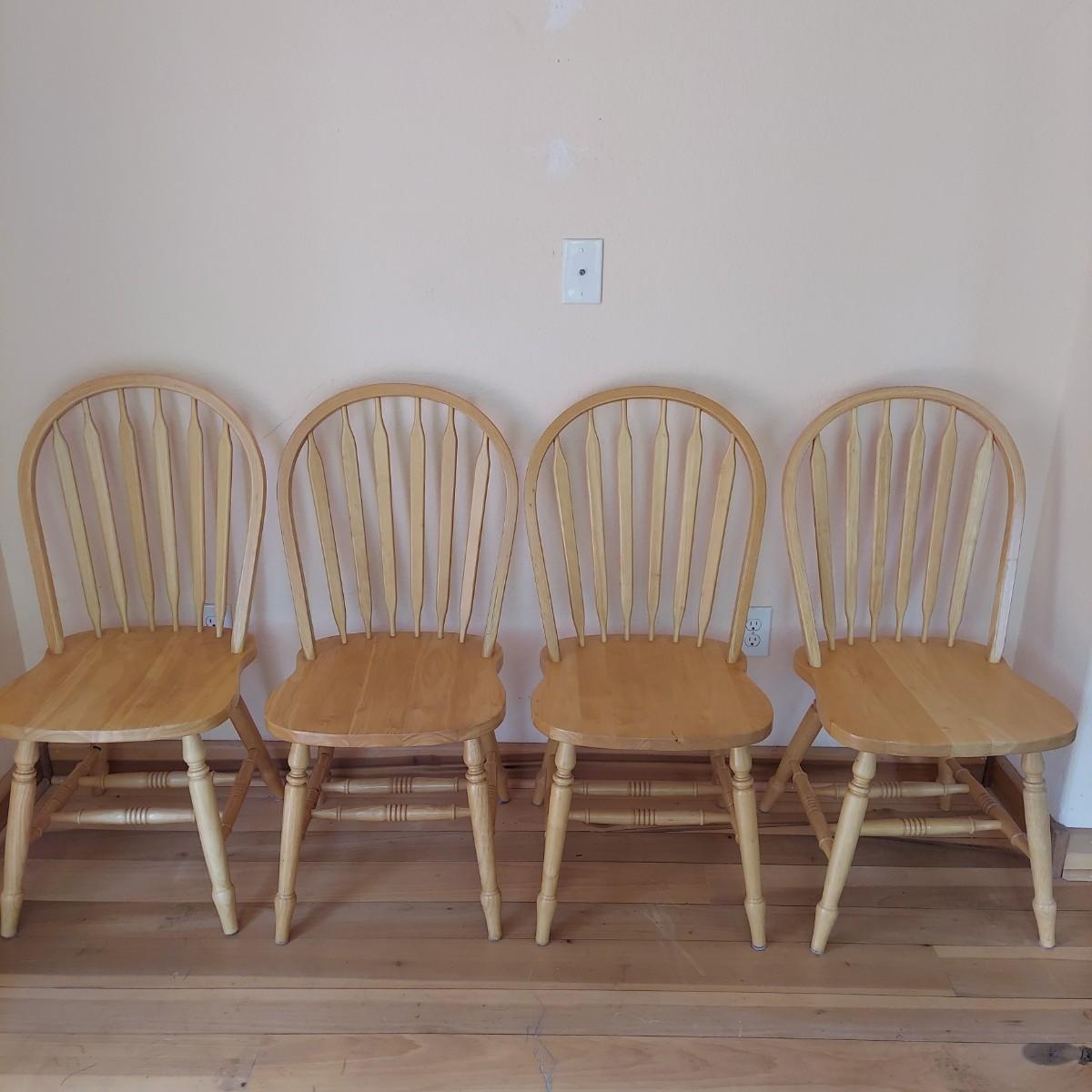 Four solid wood Shaker style dining chairs. A classic country style timeless staple. Light blond wood. Rounded bow back with spindles. Each measures approximately 18" x 18" x 38"H with a seat height of 18". Local Pickup Only