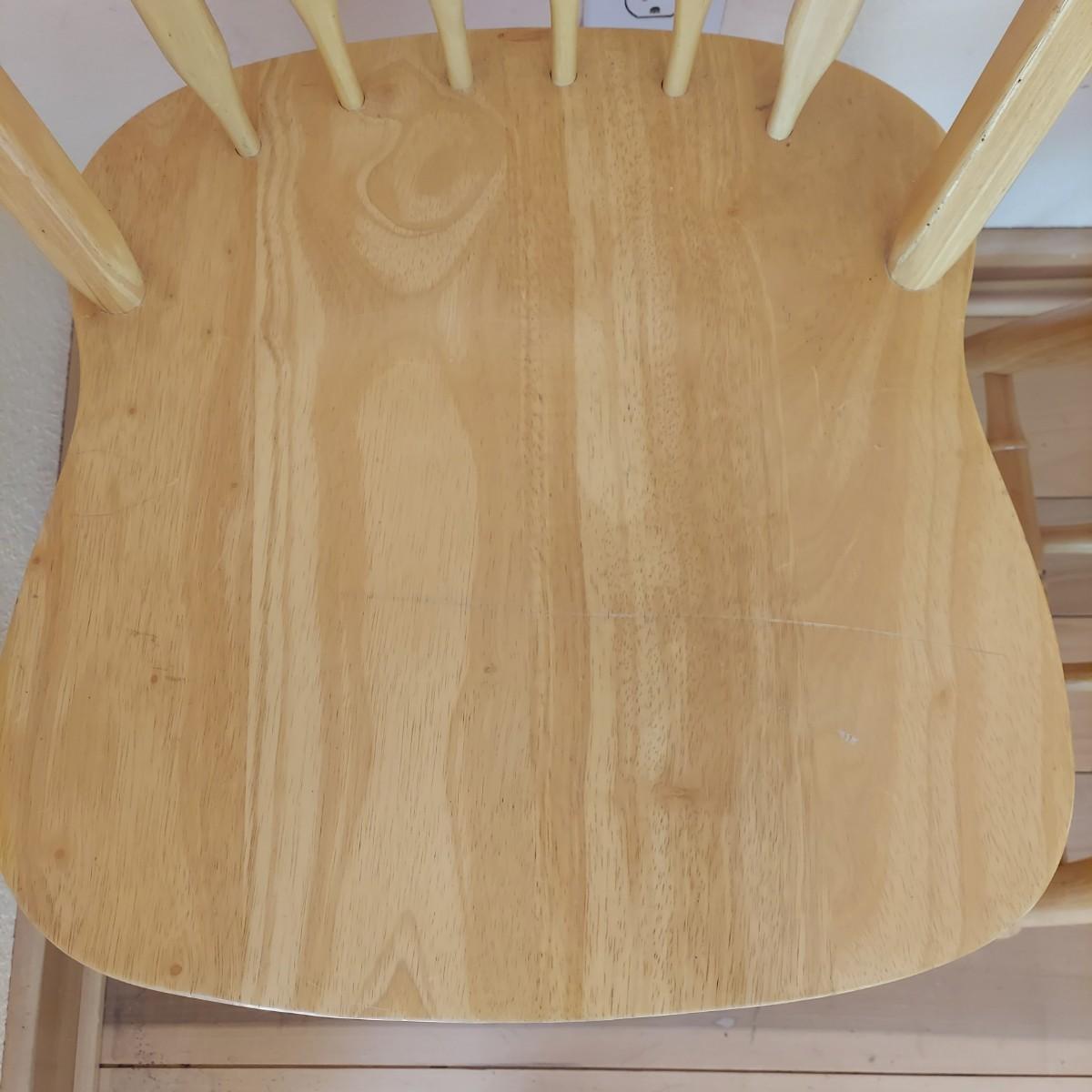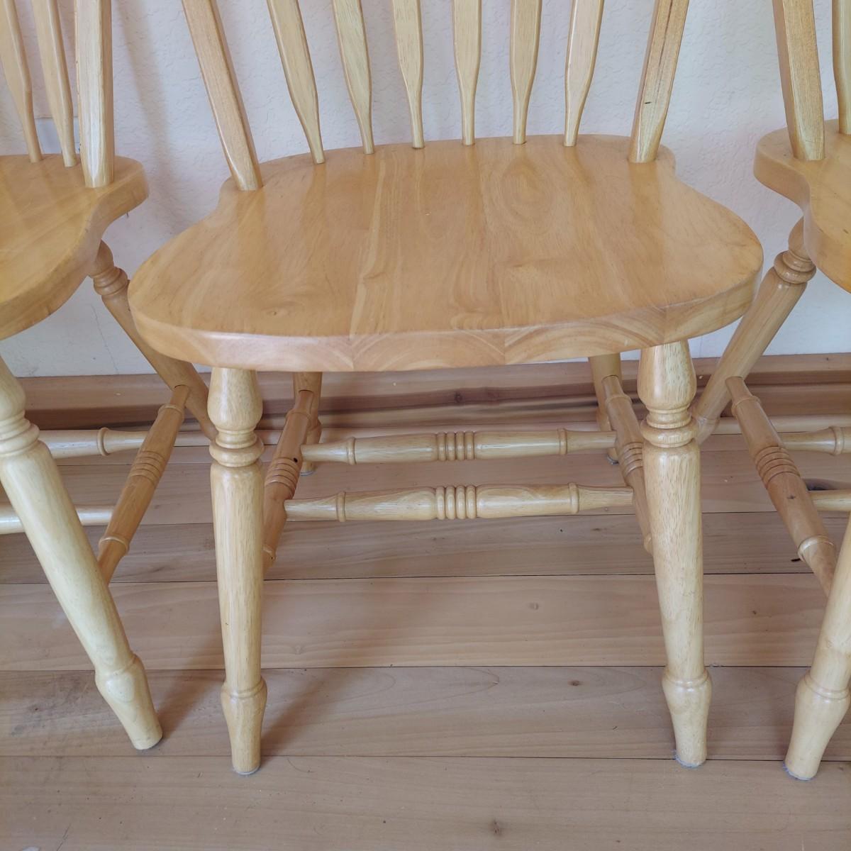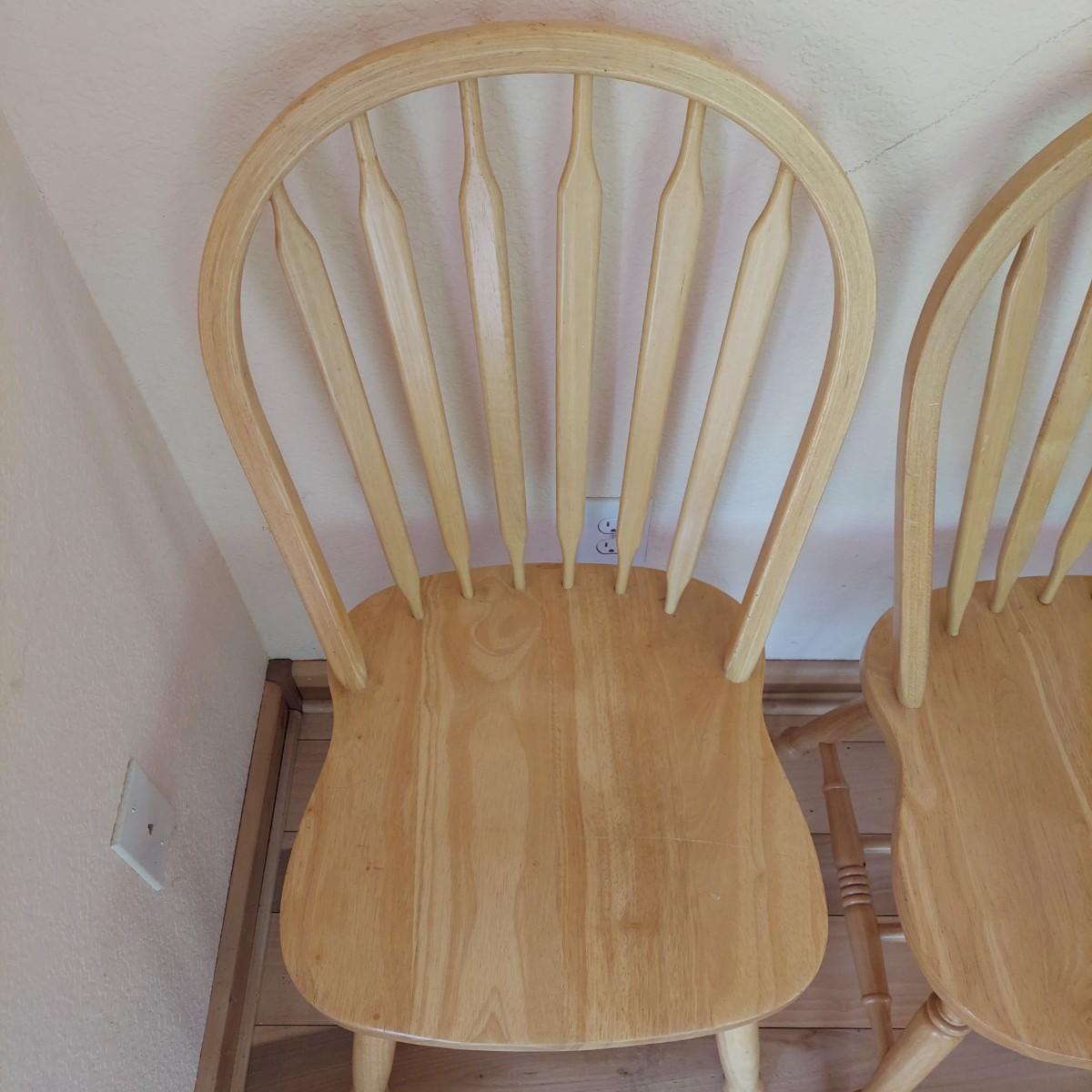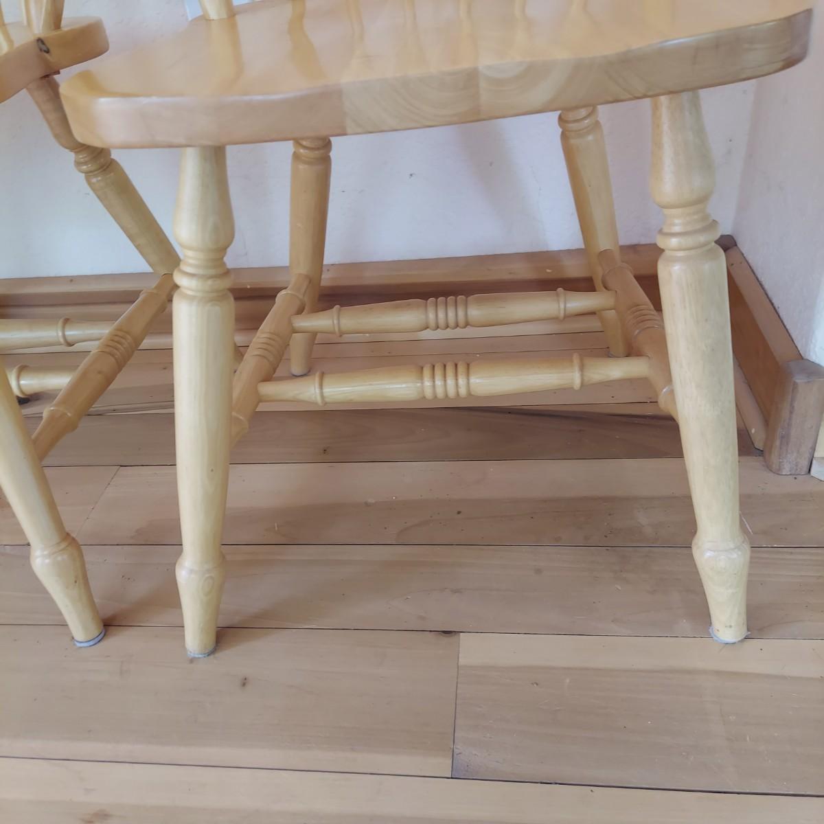 Four solid wood Shaker style dining chairs. A classic country style timeless staple. Light blond wood. Rounded bow back with spindles. Each measures approximately 18" x 18" x 38"H with a seat height of 18". Local Pickup Only