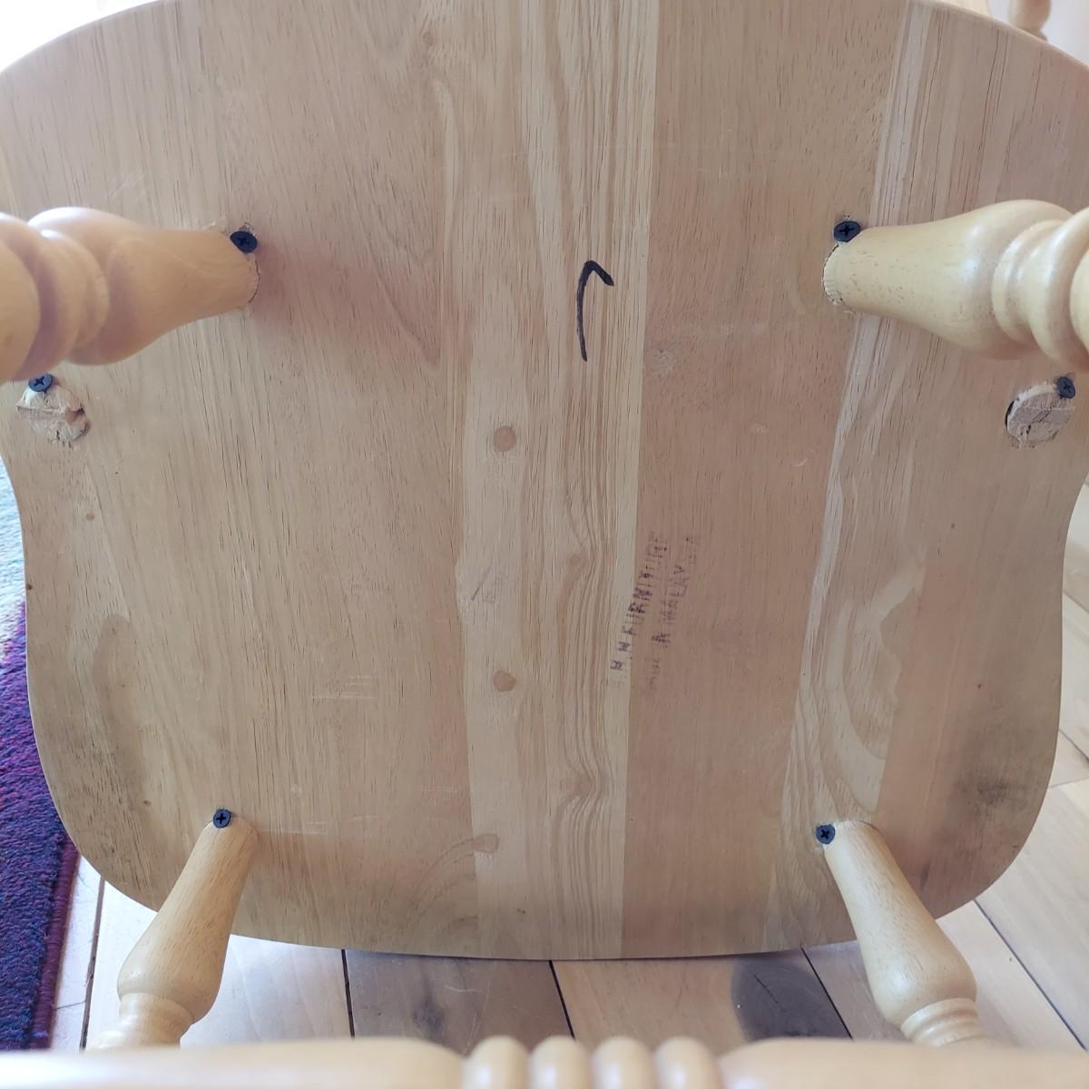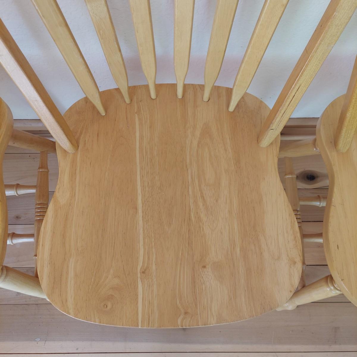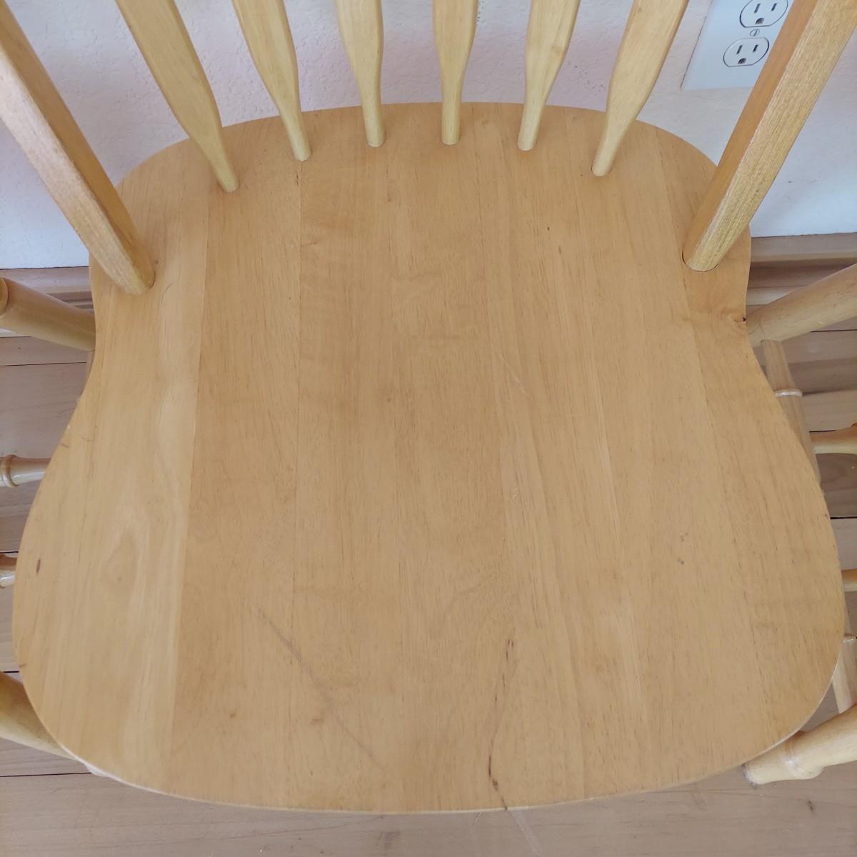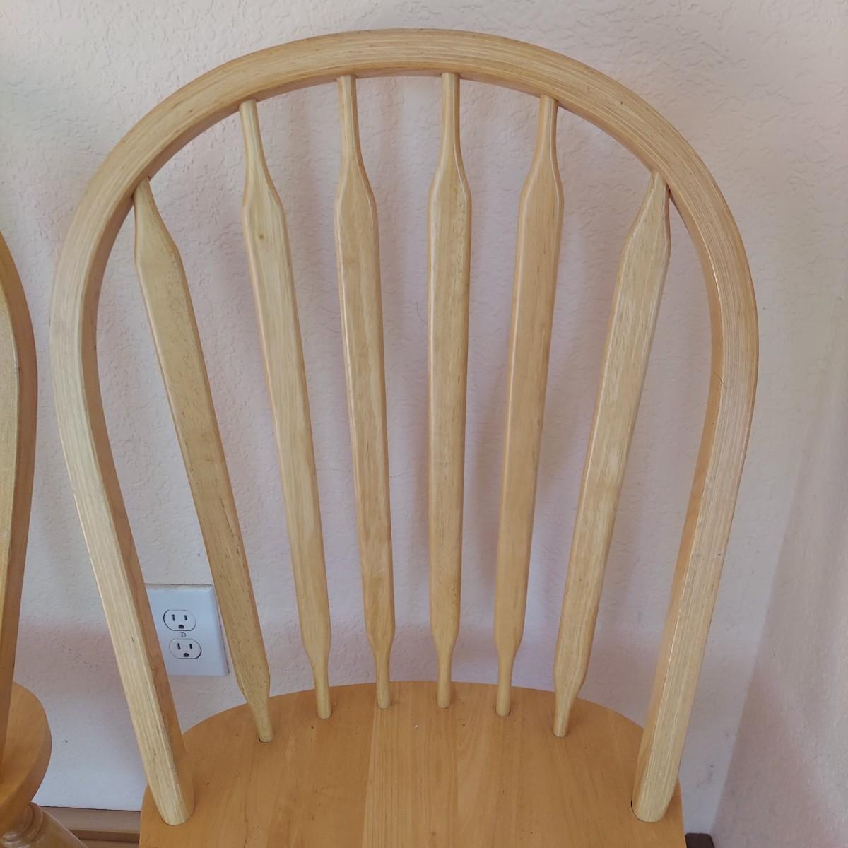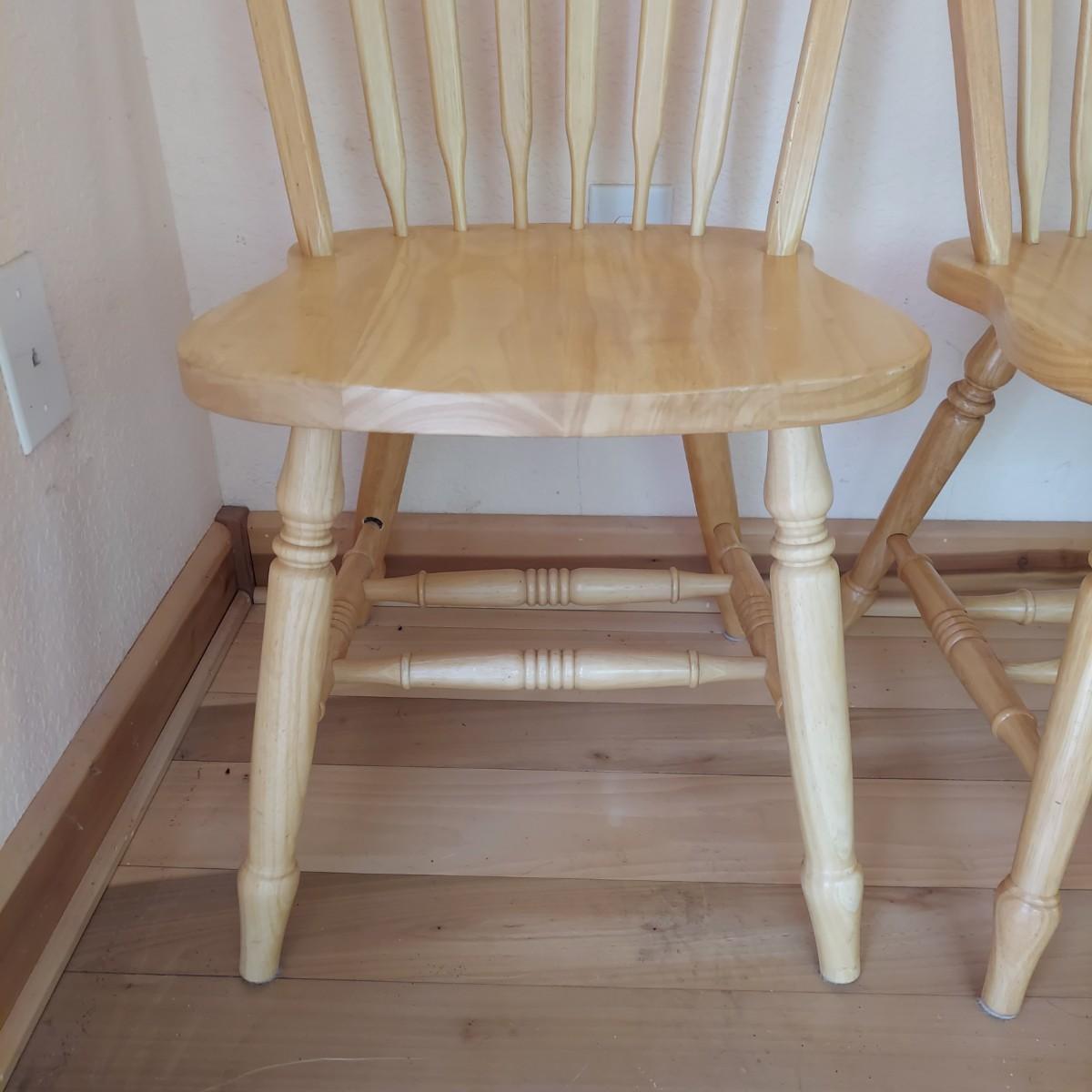Four solid wood Shaker style dining chairs. A classic country style timeless staple. Light blond wood. Rounded bow back with spindles. Each measures approximately 18" x 18" x 38"H with a seat height of 18". Local Pickup Only