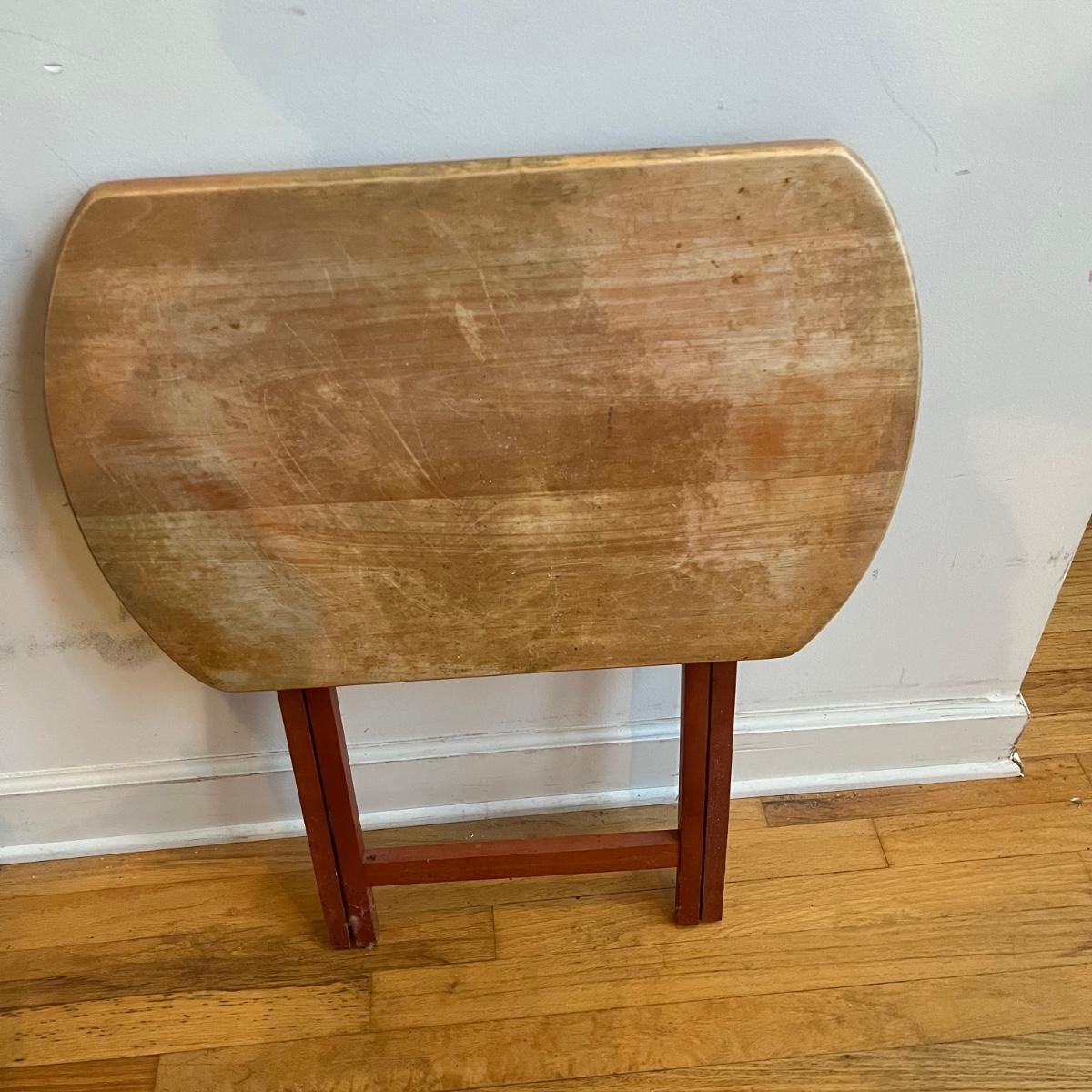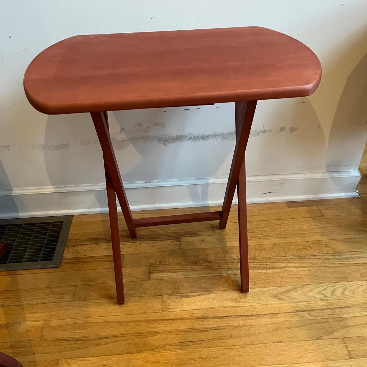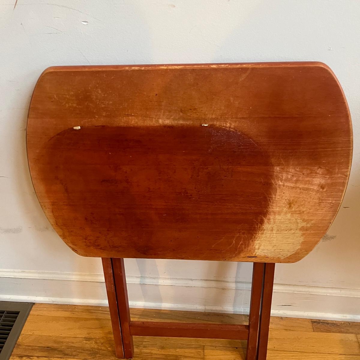 Lot includes four wooden TV trays. Two of the trays tops are discolored and scratched, see pictures. Trays measure 16” x 23” x 26”.