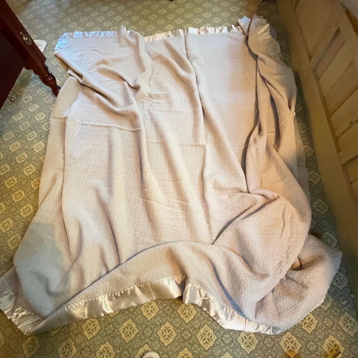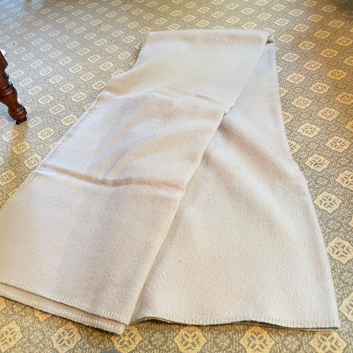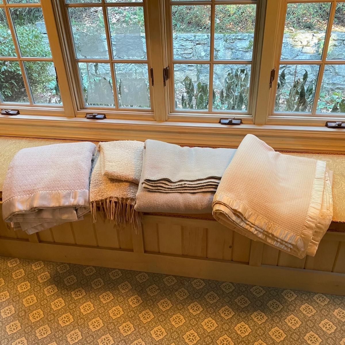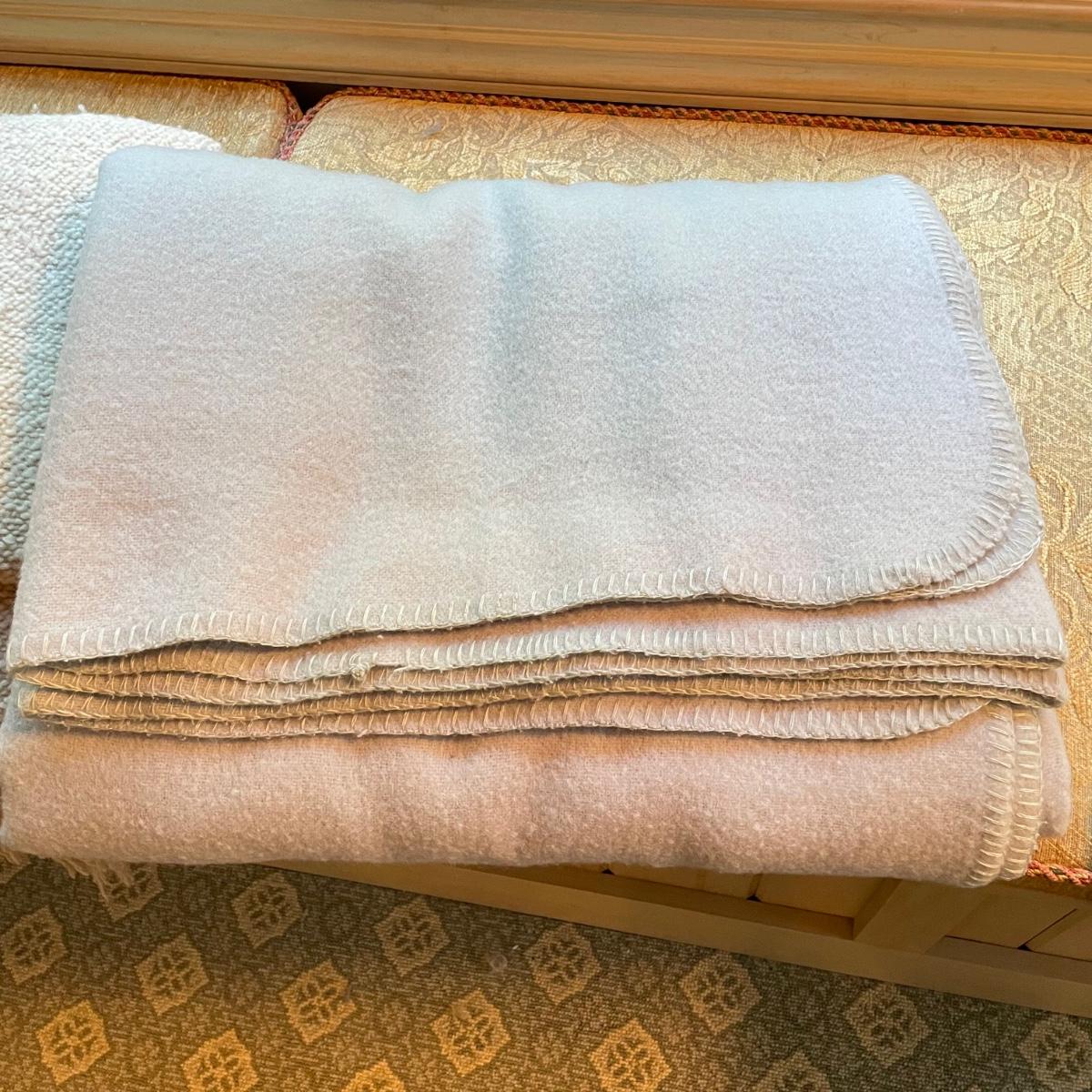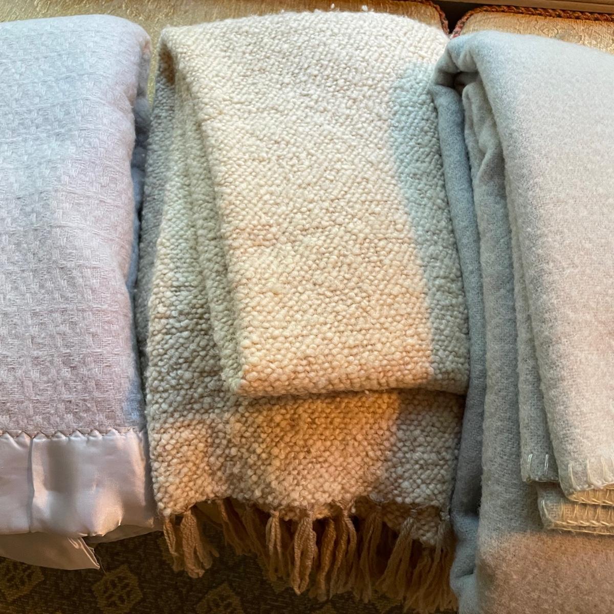 Four wool blankets, two light grey, two cream colored. One cream colored blanket (76” x 100”) has a spot or stain on its silky ribbon, see photos. The Three Weavers throw is the smallest at 48” x 72”, the largest is the Manta, its tag stating 90” x 108”. The other grey blanket is 88” x 96”. See images. Local pick up only.