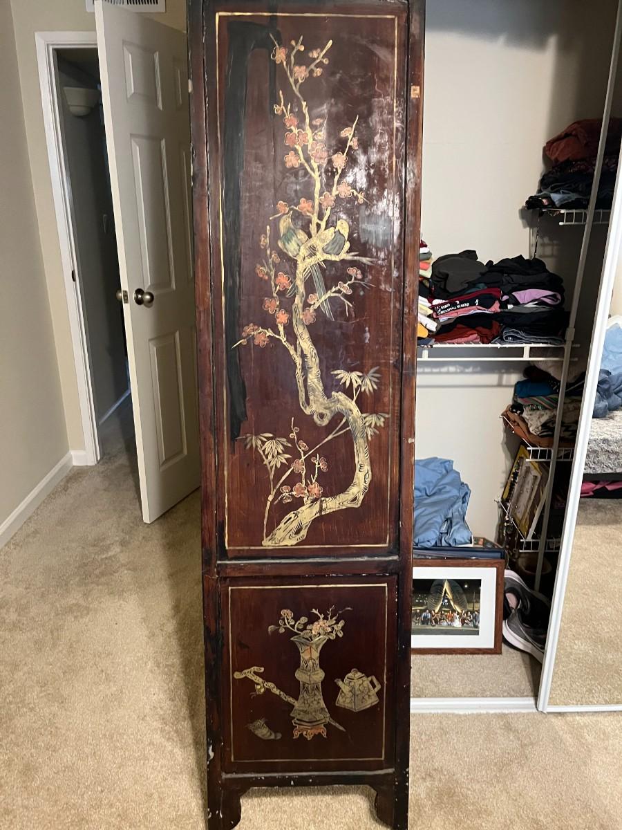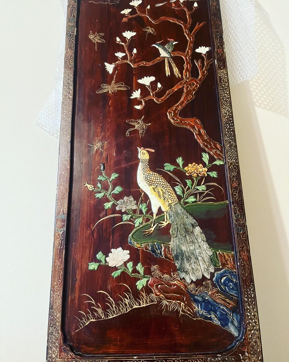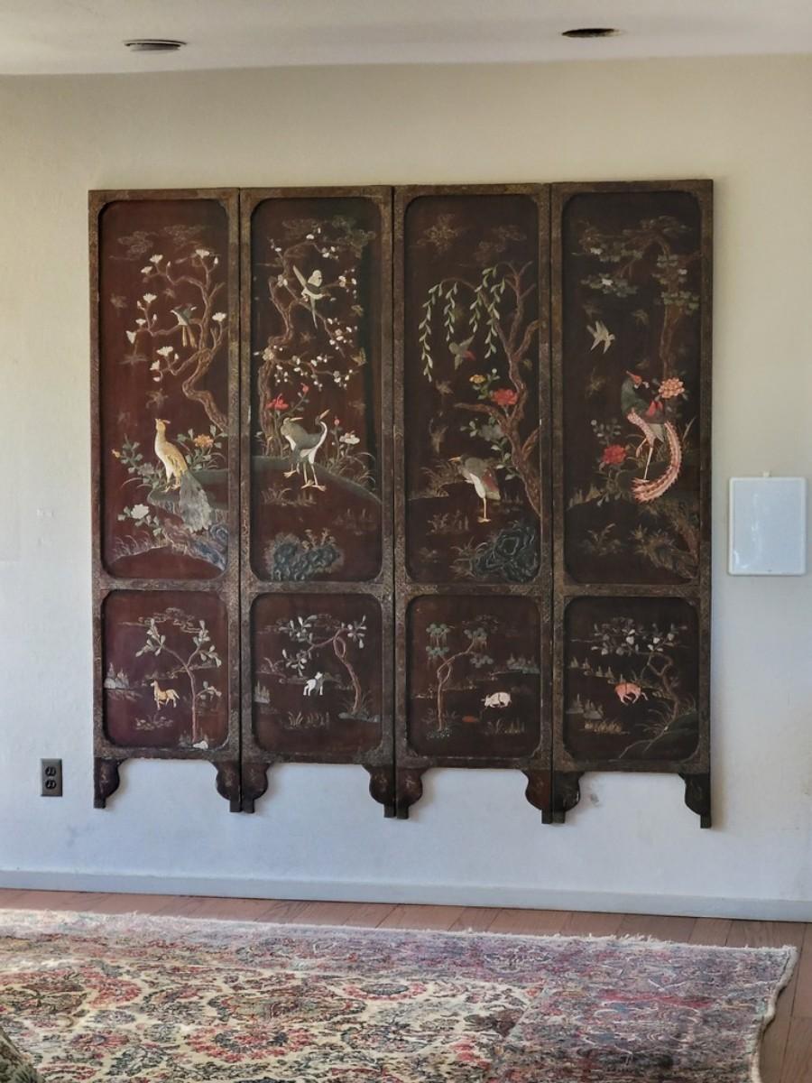 Chinese Coromandel were made in China in the 1600's for royalty and used in Europe as status symbols. They took artisans months to make, mostly due to the lacquering process and it's a very historical piece. In decent condition, considering the time frame. It's also very intricately detailed and ornate. Each upper panel is inlaid with tinded bone and semi-precious stone depicting various birds such as peasants, cranes perches on land or rock under trees, further smaller bird in flight; the lower section inlaid with semi-precious stone and wood depicting animals such as horses, monkeys, ox and rams under trees. Circa: late 19th to early 20th century. (noted damage to one of the birds back of feathers). Purchased from a luxurious Estate in Atherton, CA.