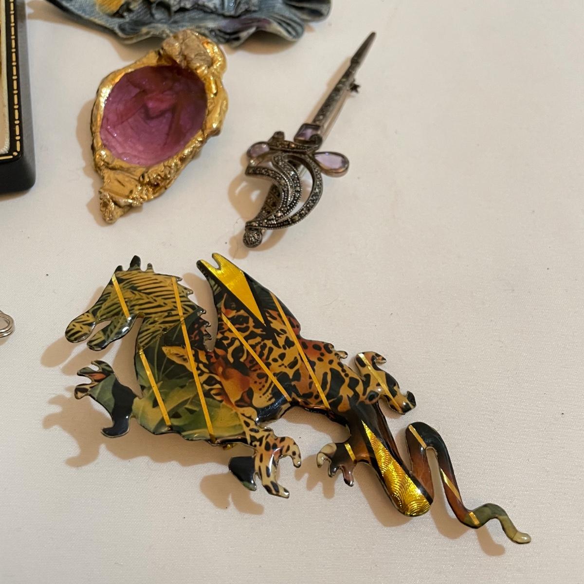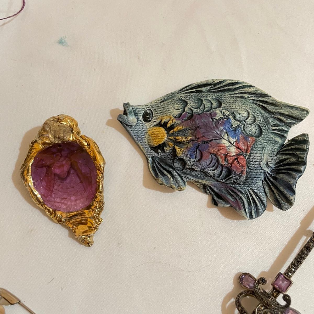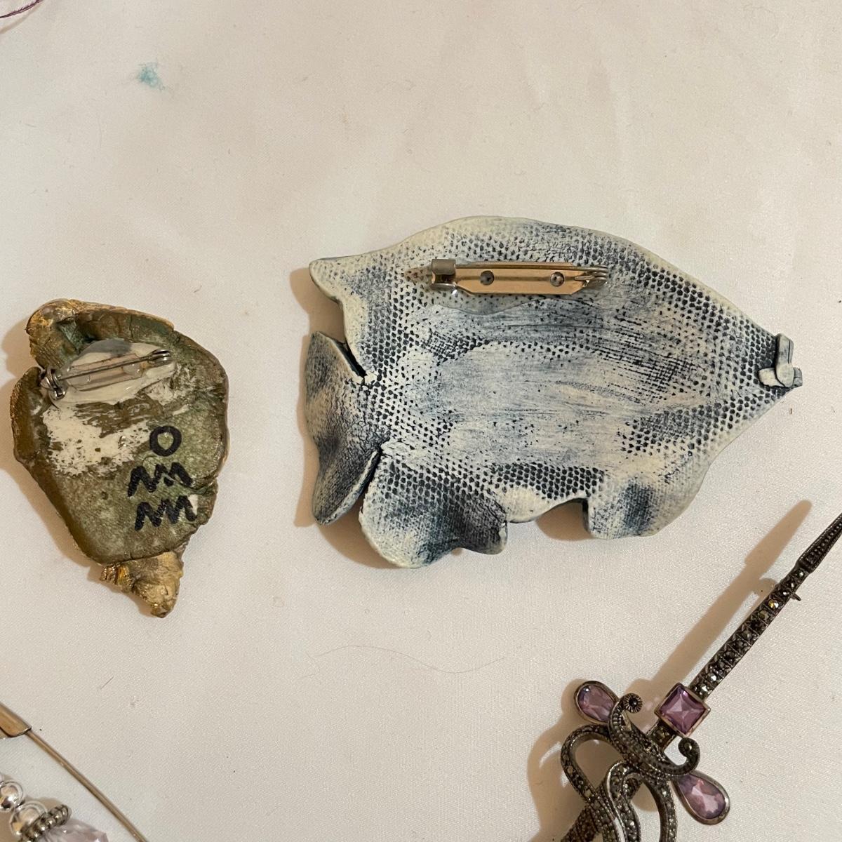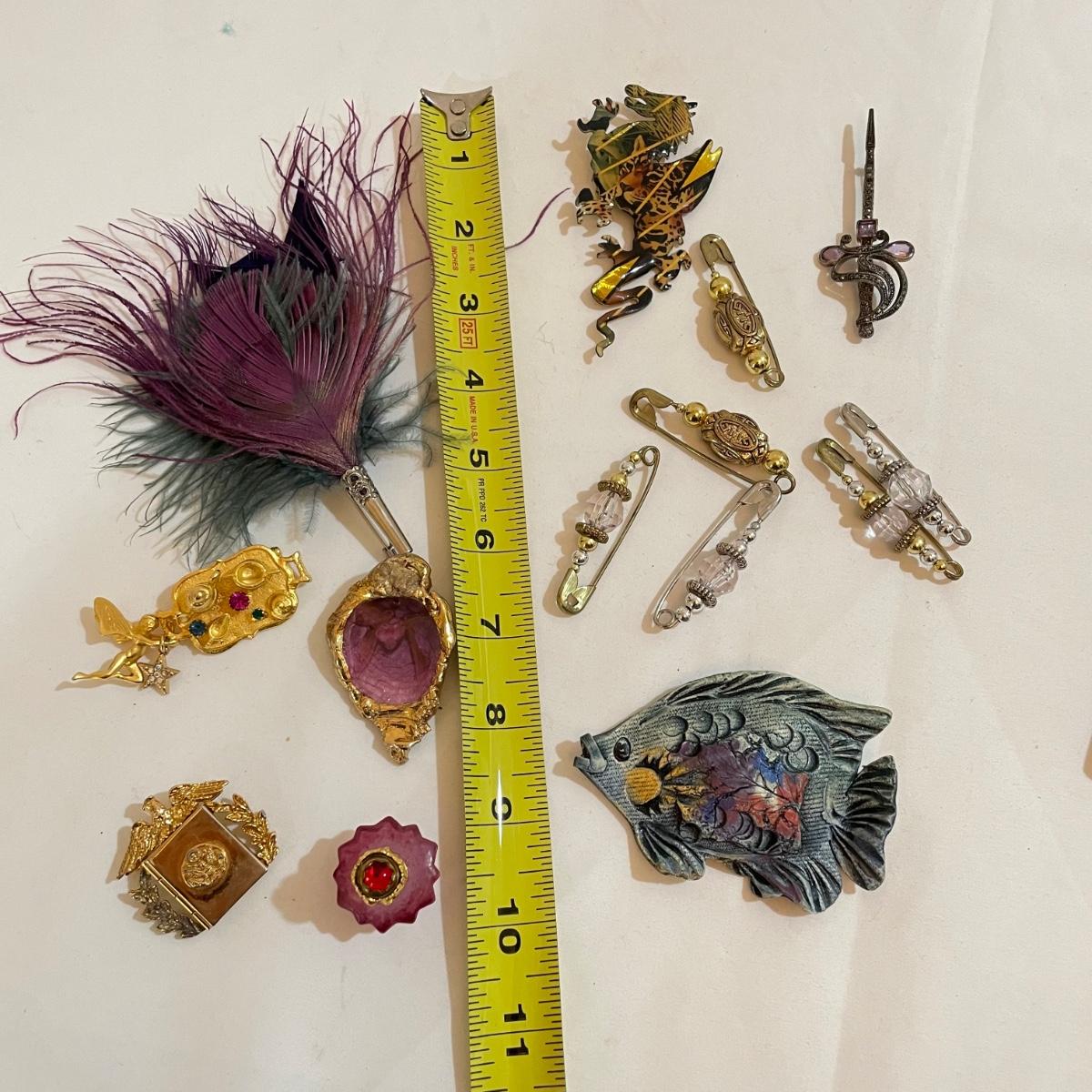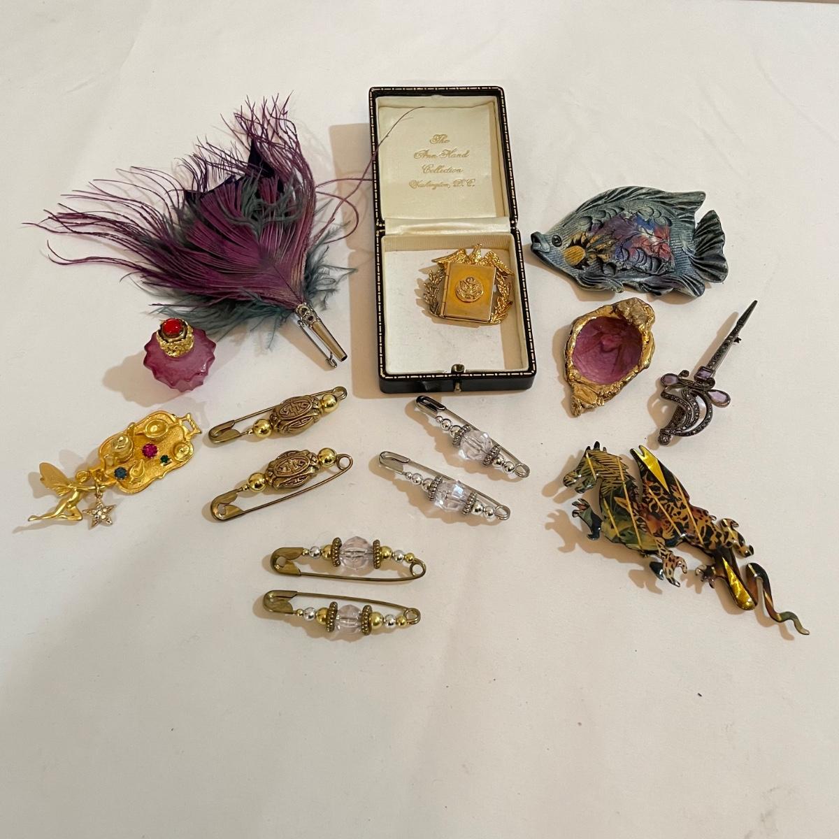 14 pins and brooches for a variety of occasions. A plum and teal peacock like brooch, a fairy serving tea, three pairs of stylish safety pins, sword with amethyst colored gems, a tropical clay fish, Ann Hand collection locket and more. See images. Shipping available. All sales are final. No returns or refunds. Please bid accordingly.