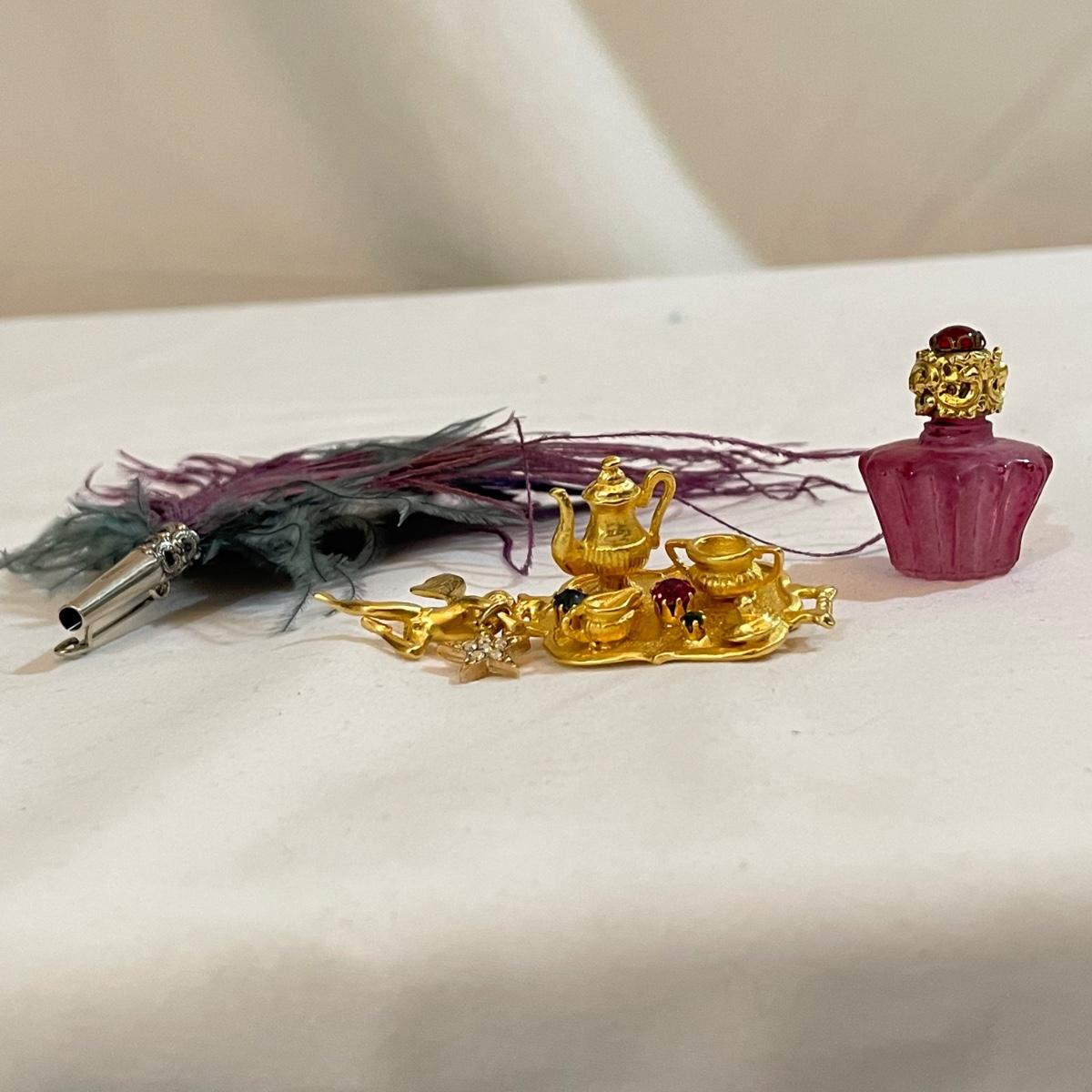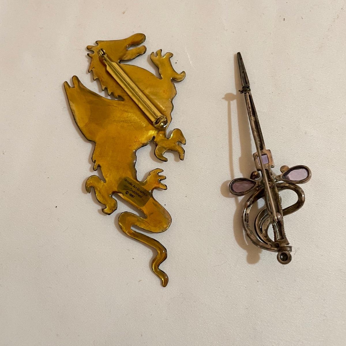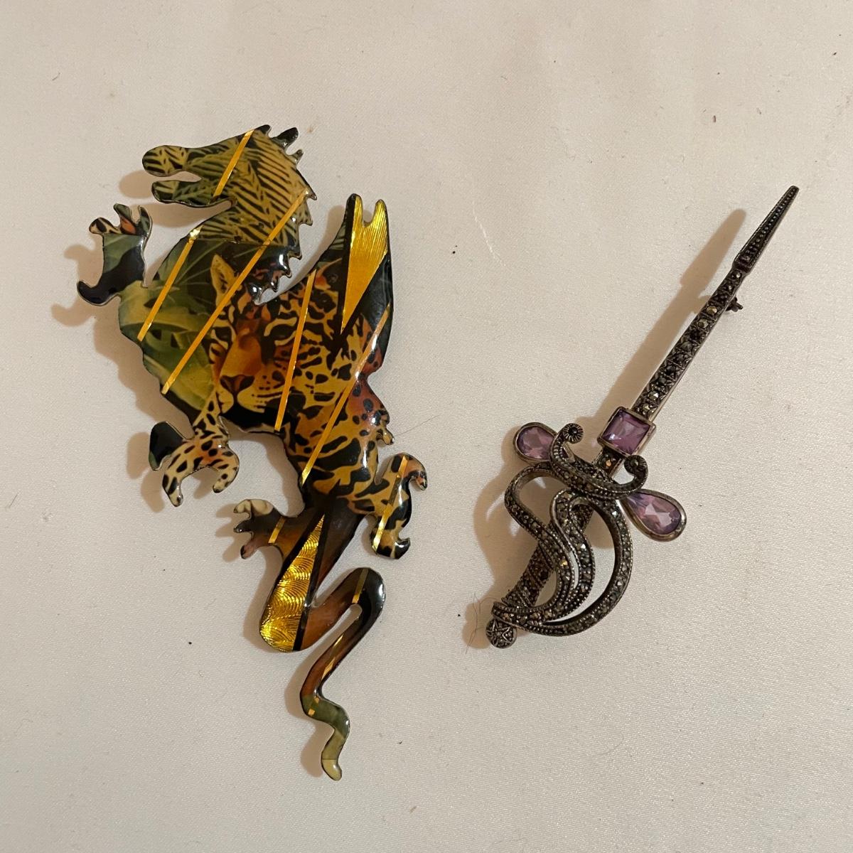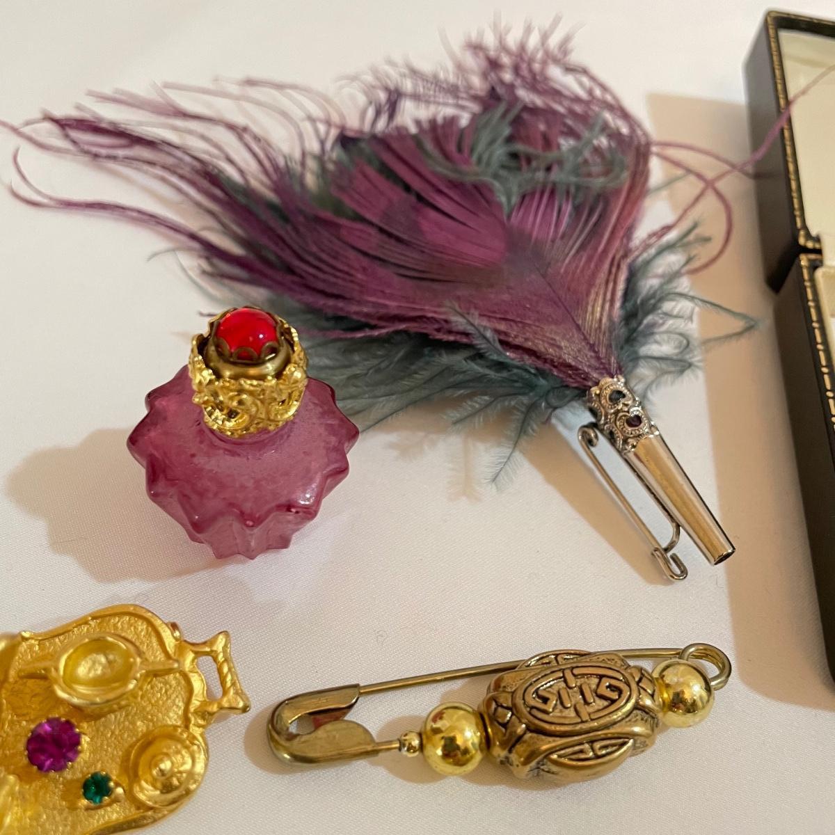 14 pins and brooches for a variety of occasions. A plum and teal peacock like brooch, a fairy serving tea, three pairs of stylish safety pins, sword with amethyst colored gems, a tropical clay fish, Ann Hand collection locket and more. See images. Shipping available. All sales are final. No returns or refunds. Please bid accordingly.